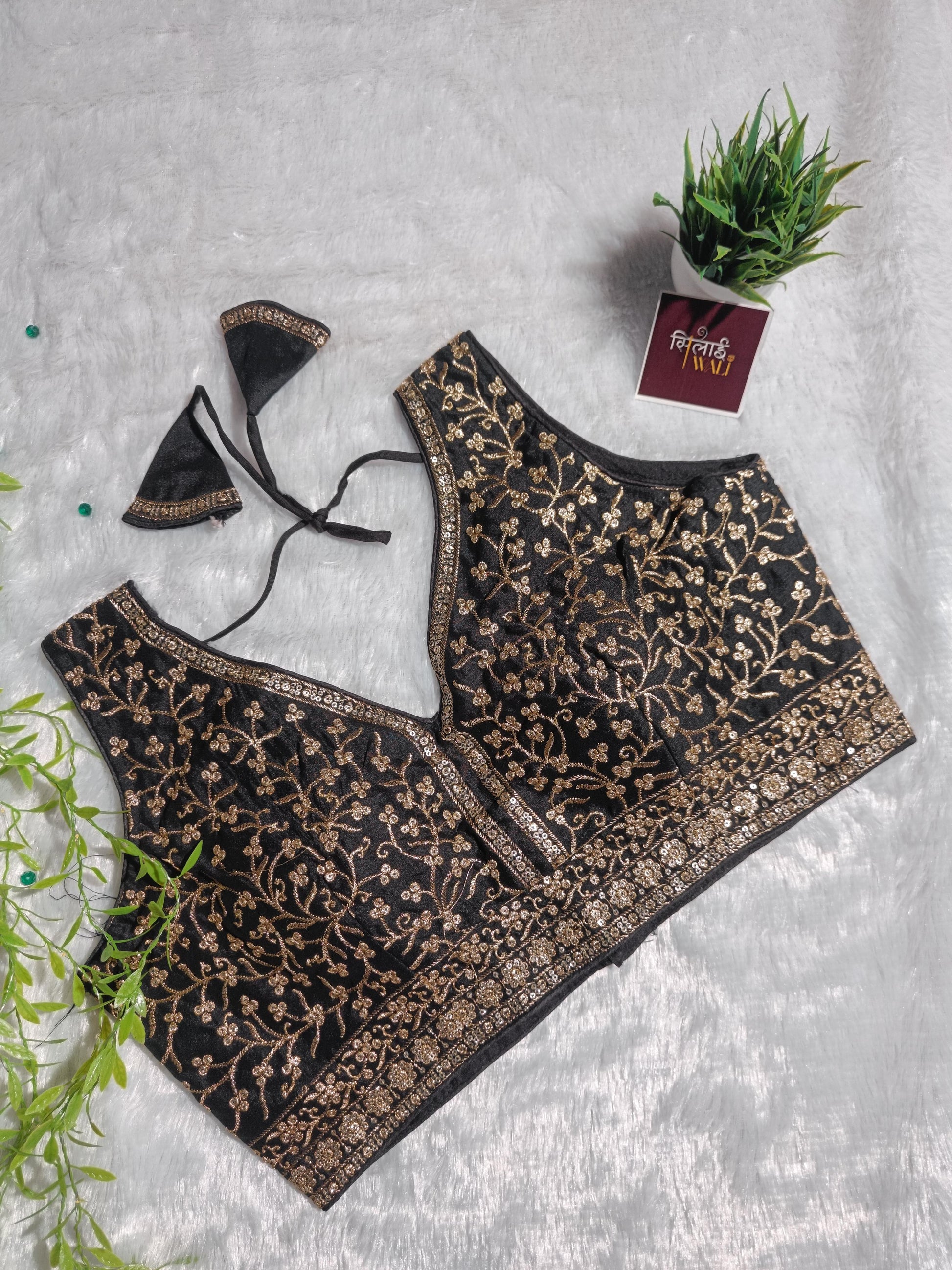 अफरीन नॉयर ब्लाउज के साथ शाम की भव्यता को नया रूप दें। गहरे मैट सिल्क फैब्रिक पर की गई सुनहरी ज़री की कढ़ाई बेहद आकर्षक लगती है। शार्प वी-नेकलाइन पर लगे भारी सीक्वेंस इसे एक शानदार लुक देते हैं।