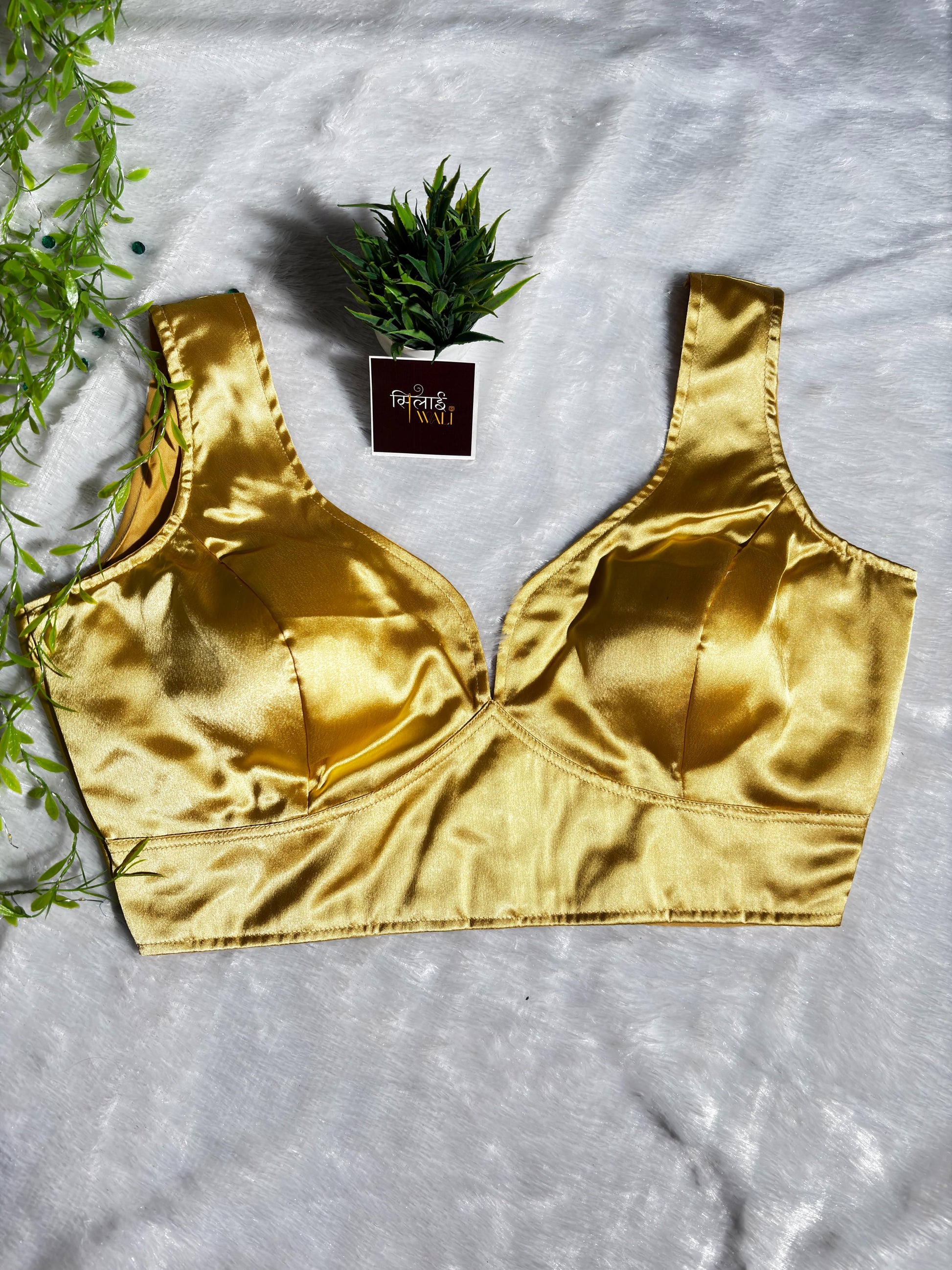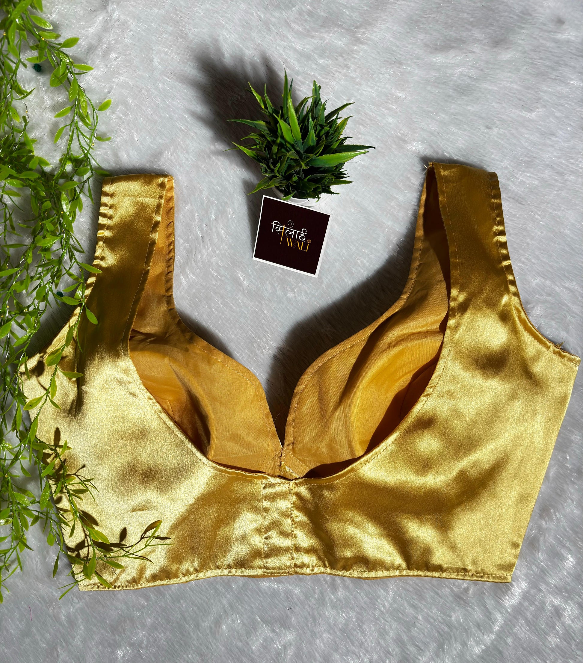 गोल्डन ग्लो सैटिन ब्लाउज एक बेहद बहुमुखी और उपयोगी परिधान है, जिसे आपकी अलमारी में मौजूद लगभग किसी भी साड़ी के साथ खूबसूरती से पहना जा सकता है। इसकी चमकदार मेटैलिक फिनिश और आधुनिक वी-कट इसे किसी भी उत्सव के लिए एक परिष्कृत डिज़ाइनर रेडीमेड ब्लाउज बनाते हैं।
