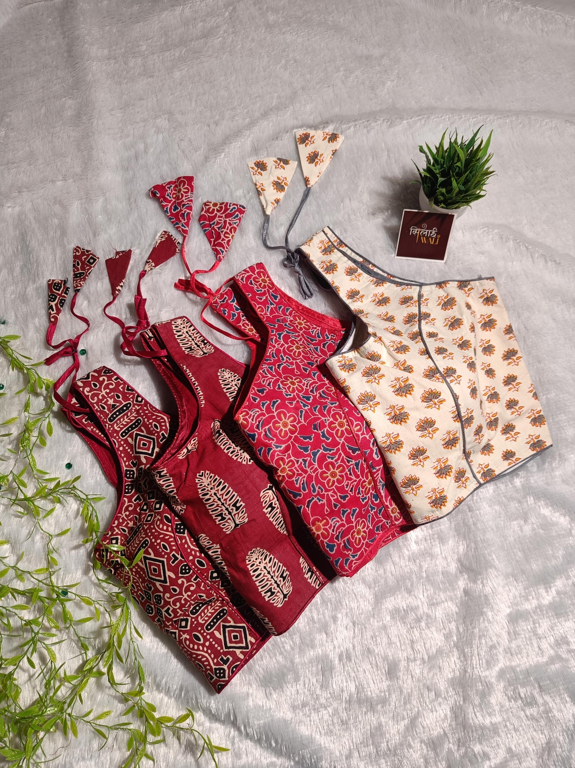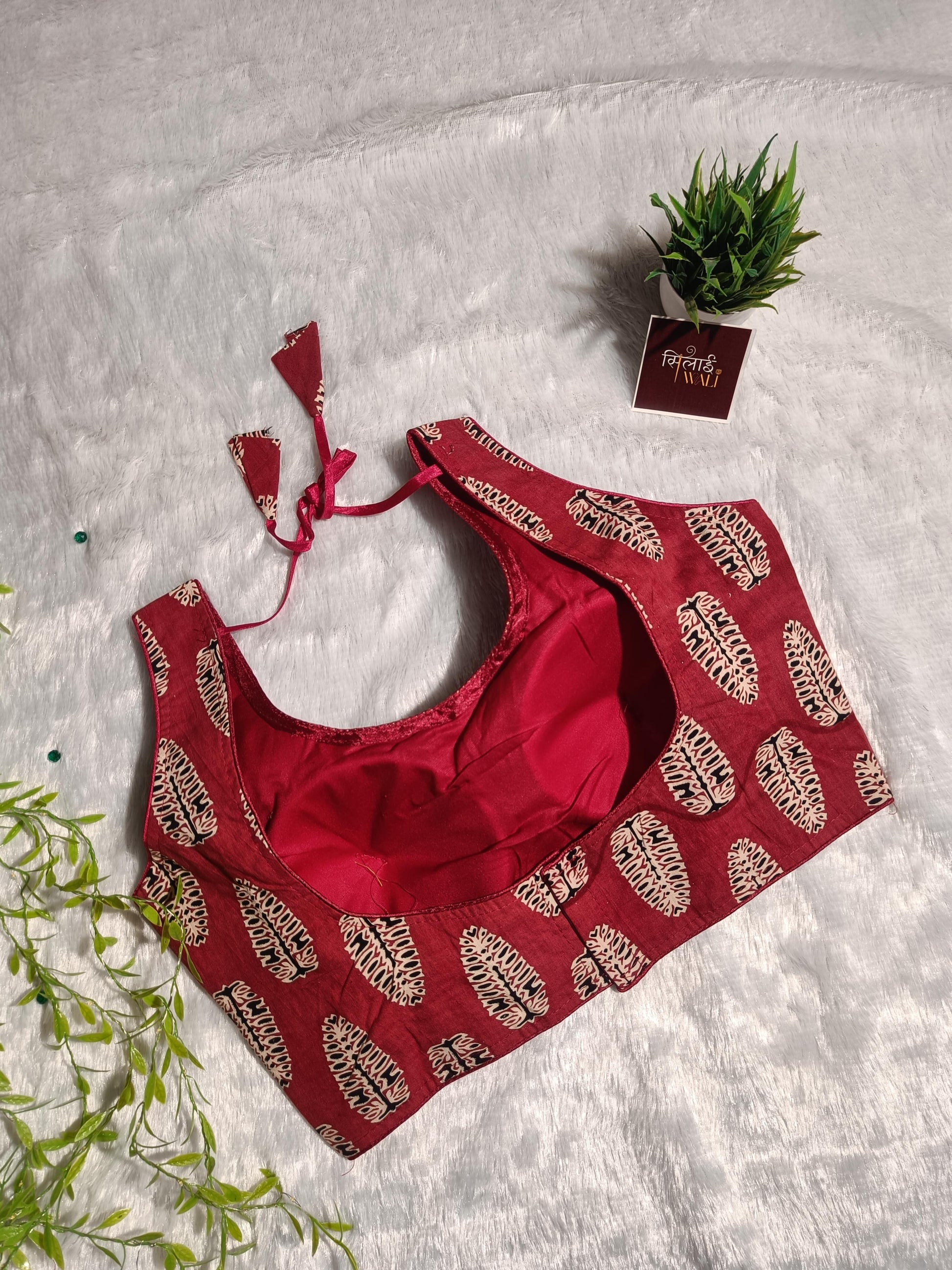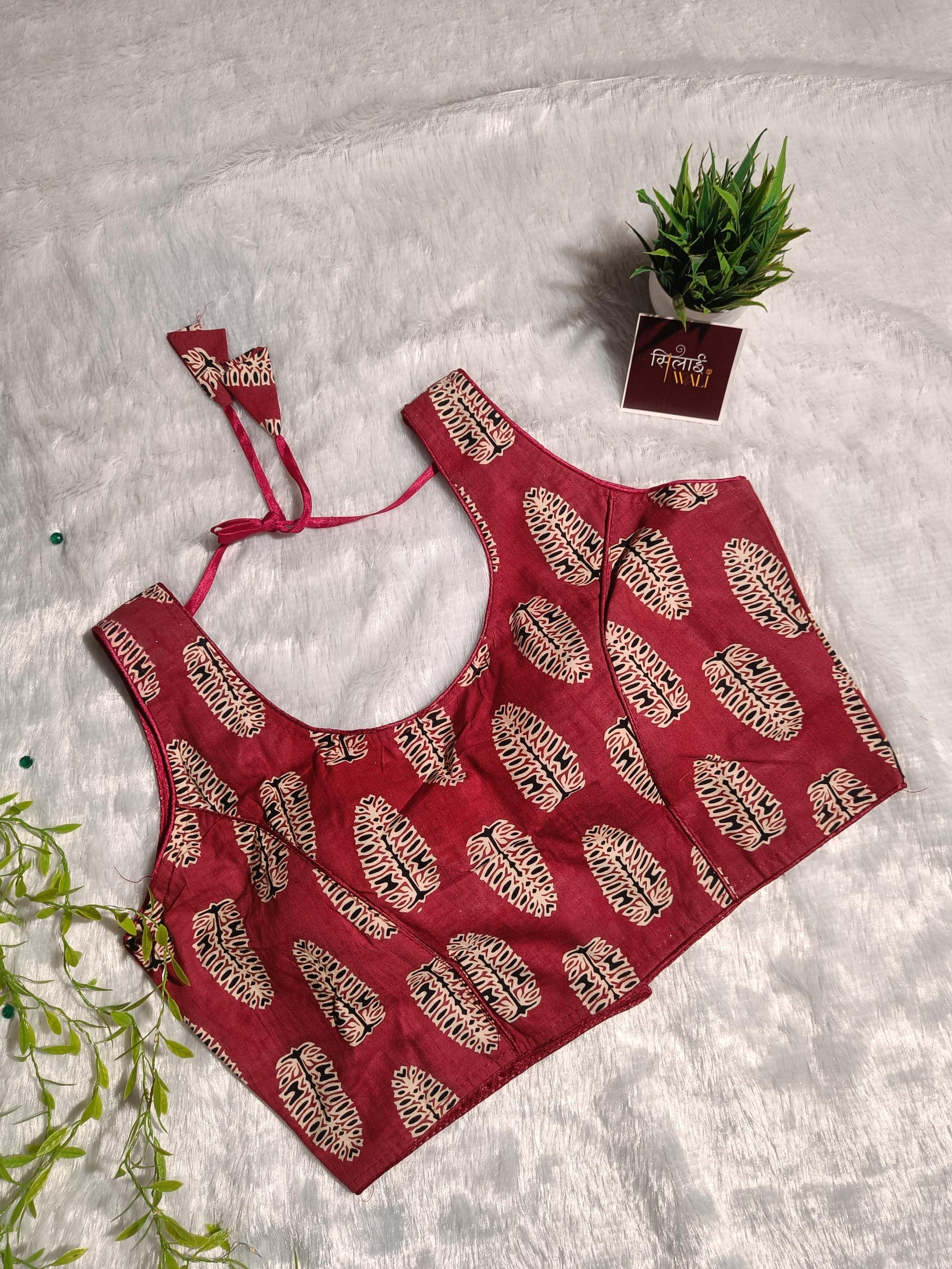 ईशानी ब्लाउज़ का नाम उसके साहसी और जोशीले स्वभाव के कारण रखा गया है। यह प्रीमियम रोज़ाना कॉटन फ़ैब्रिक से बना है। गहरे मैरून रंग के इस फ़ैब्रिक पर क्रीम और काले रंग के पारंपरिक हैंड-ब्लॉक "पंख" या पत्ती के डिज़ाइन बने हैं। इसमें एक आकर्षक चौड़ा यू-नेकलाइन है जो कॉलरबोन को खूबसूरती से उभारता है, जिससे यह किसी भी अवसर के लिए एक बेहतरीन विकल्प बन जाता है।