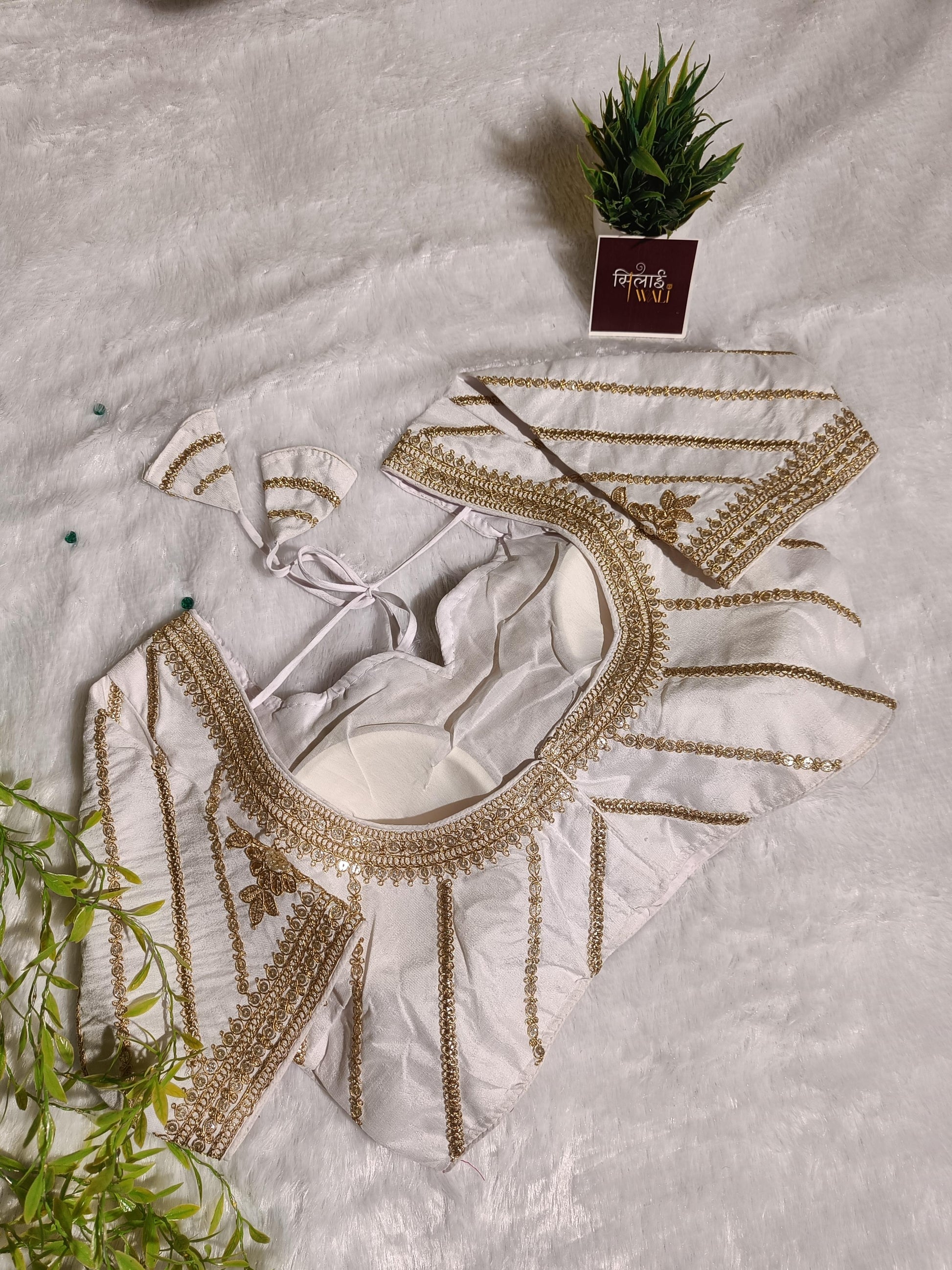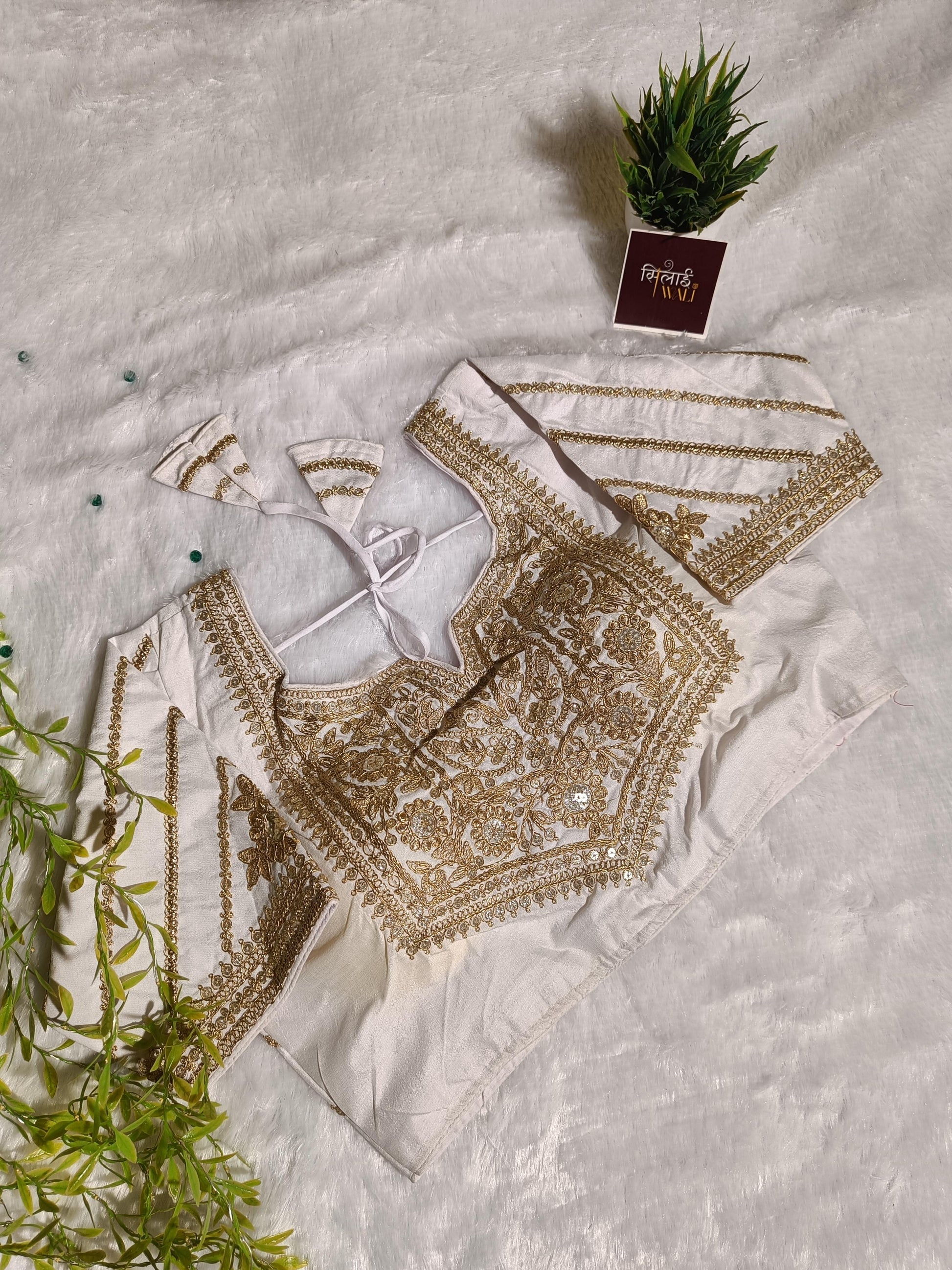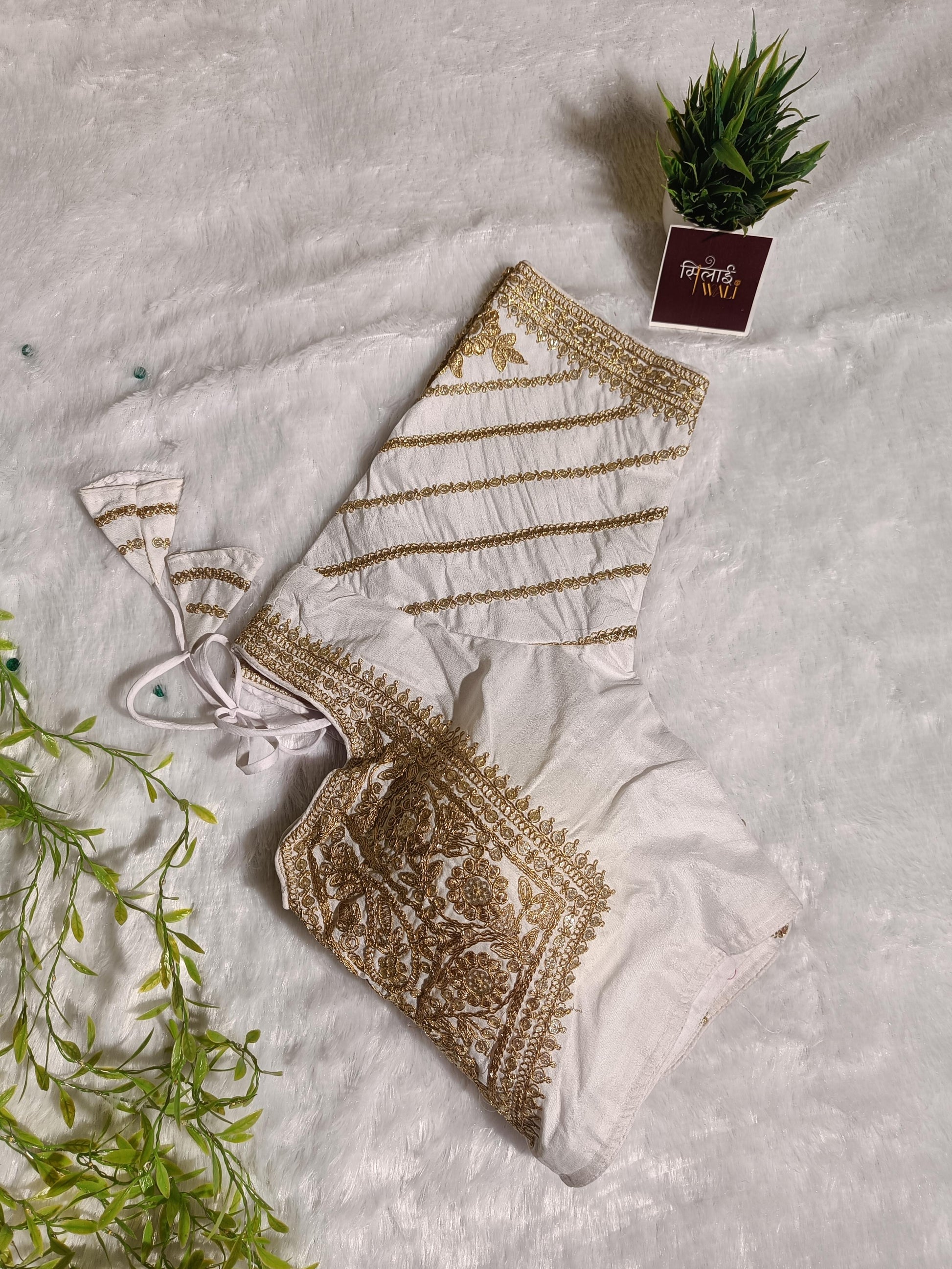 "मूनलाइट आइवरी" डिज़ाइनर ब्लाउज़: हमारे सिग्नेचर खोया खोया चंद कलेक्शन के आइवरी सफेद रेडीमेड डिज़ाइनर ब्लाउज़ के साथ शाश्वत सुंदरता का अनुभव करें। यह परिष्कृत ऑफ-व्हाइट ब्लाउज़ भारी सोने की ज़री और चमकदार सीक्वेंस से बारीकी से सजाया गया है, जो एक दिव्य चमक बिखेरता है।