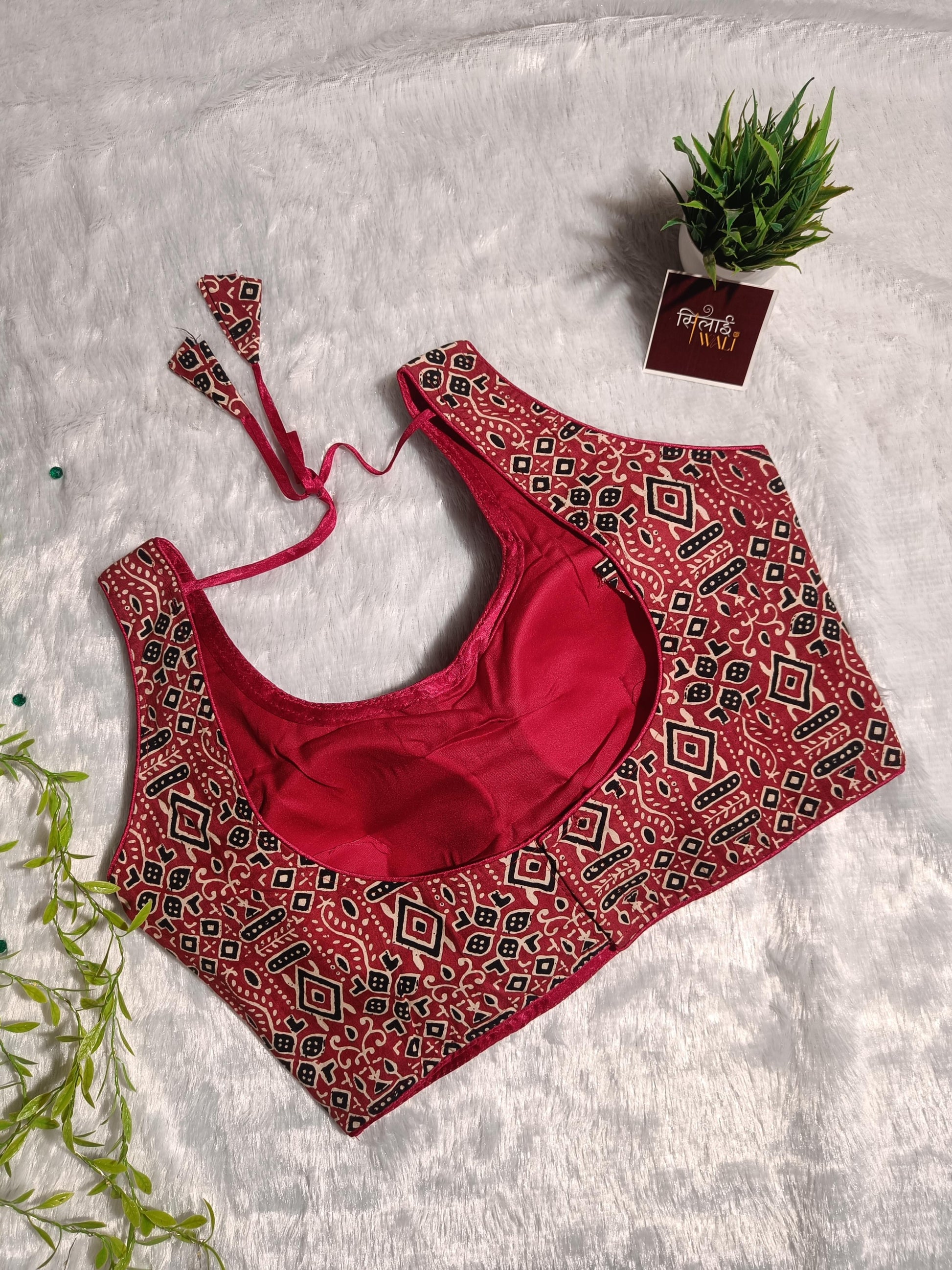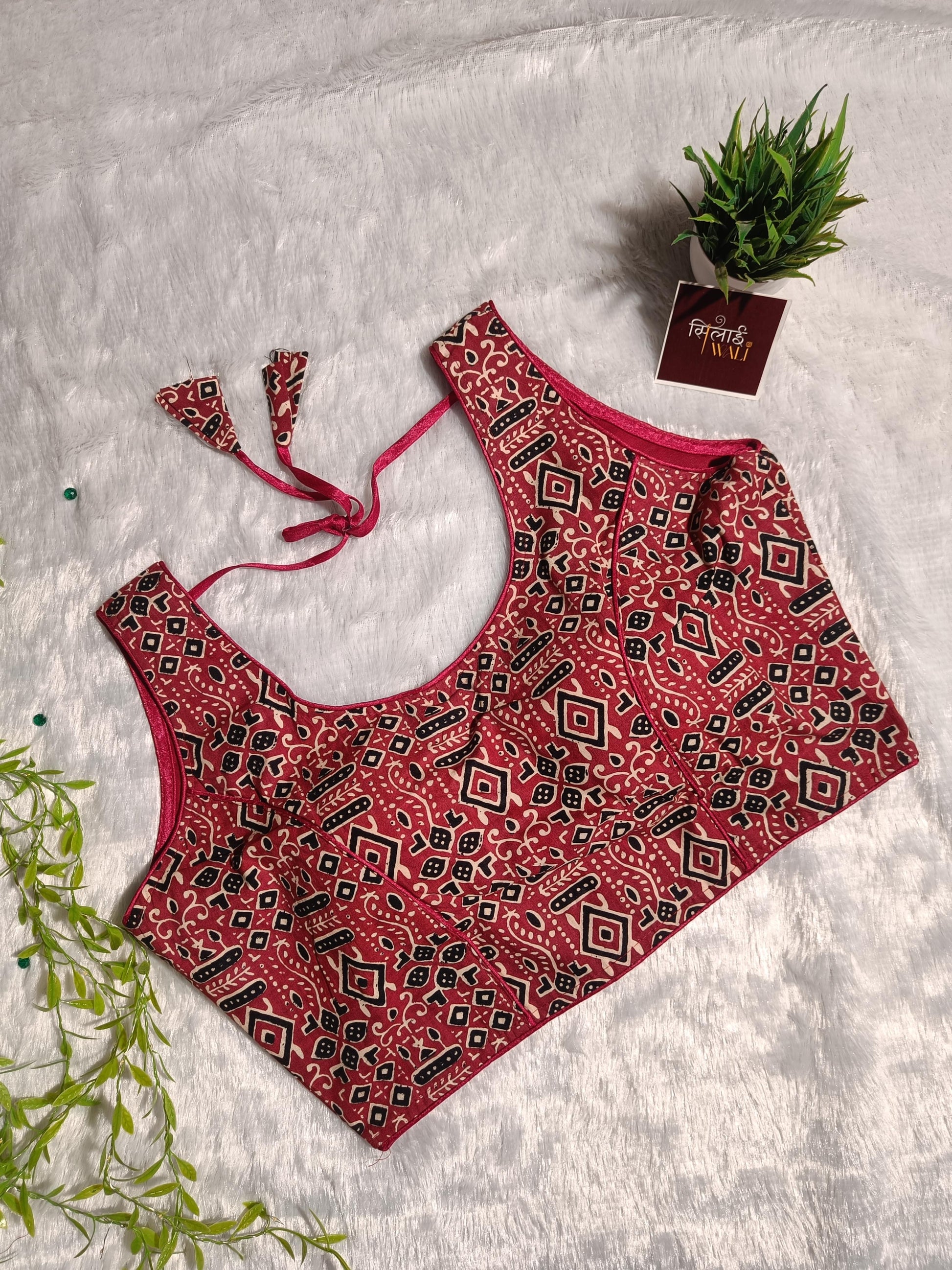 काव्या ब्लाउज संरचनात्मक सुंदरता और पारंपरिक कला को समर्पित है। मुलायम सूती कपड़े से बना यह ब्लाउज गहरे लाल, काले और क्रीम रंगों में परिष्कृत ज्यामितीय ट्राइबल प्रिंट से सुसज्जित है। इसका चौकोर-गोल नेकलाइन एक अनूठा, आधुनिक लुक देता है, जिससे आप रोज़ाना कलेक्शन में सबसे अलग दिखेंगी।