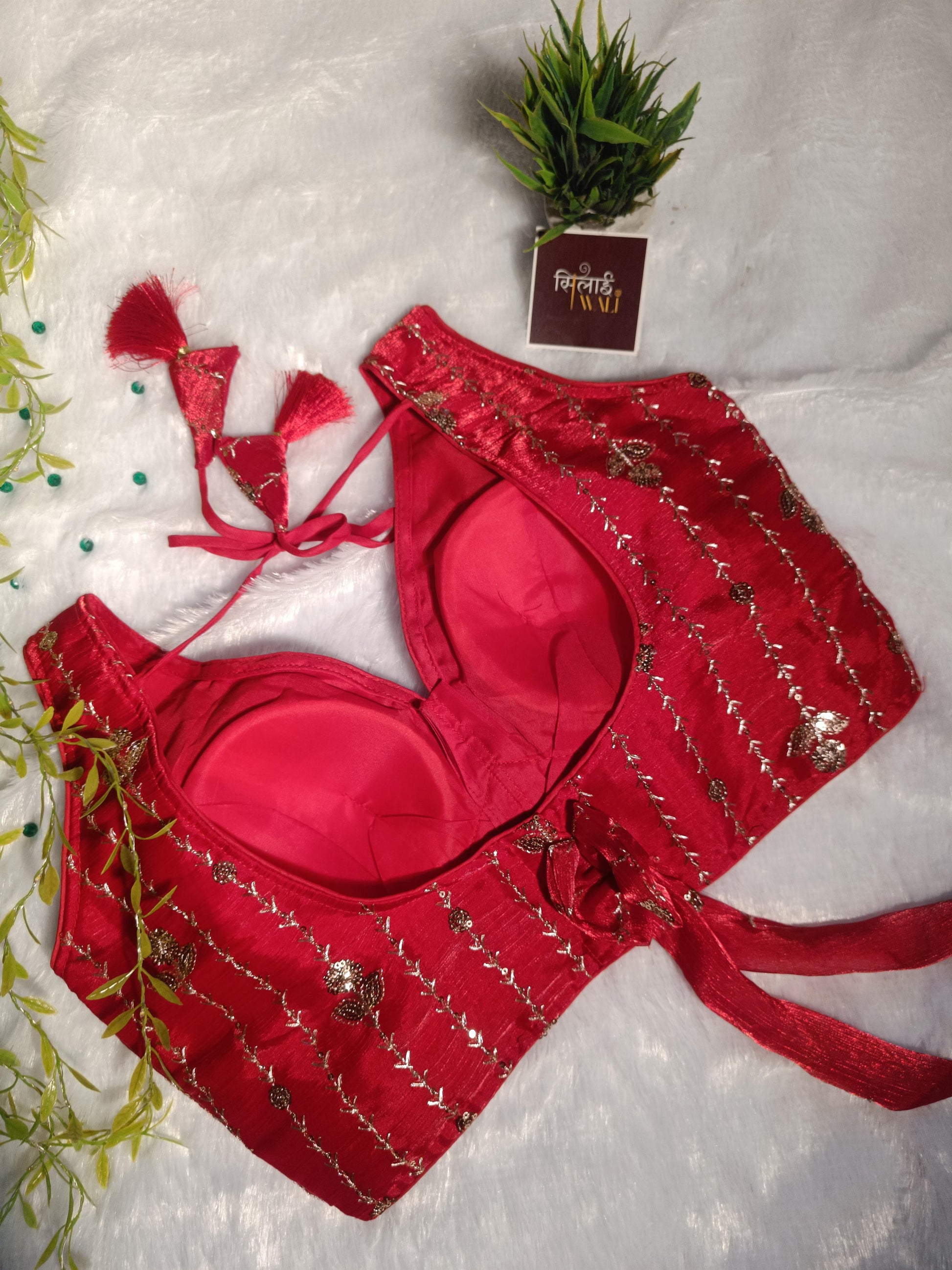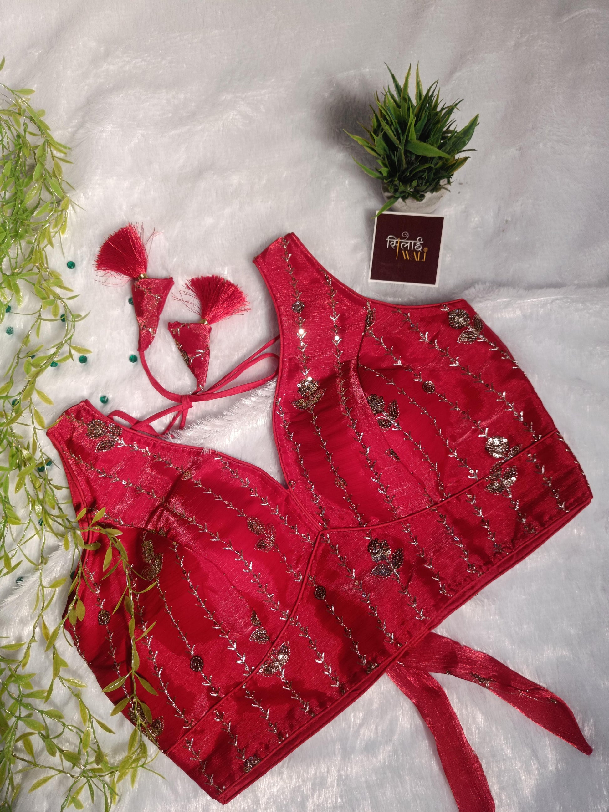 ऐशानी क्रिमसन ब्लाउज के साथ एक शानदार लुक पाएं, जो पारंपरिक कारीगरी का एक बेजोड़ नमूना है। उच्च गुणवत्ता वाले ज़री-बुनाई वाले डॉबी सिल्क से बना यह आकर्षक लाल ब्लाउज नाजुक ऊर्ध्वाधर लताओं और चमकदार फूलों के डिज़ाइन से सजा है। इसका आधुनिक डीप वी-नेकलाइन क्लासिक रंग के साथ खूबसूरती से मेल खाता है और इसे एक स्टाइलिश और फैशनेबल लुक देता है। पीछे की ओर बांधने वाली डोरी और अलंकृत हस्तनिर्मित टैसल्स के साथ डिज़ाइन किया गया यह ब्लाउज दुल्हन के परिधान या किसी उत्सव के लिए एकदम सही विकल्प है।