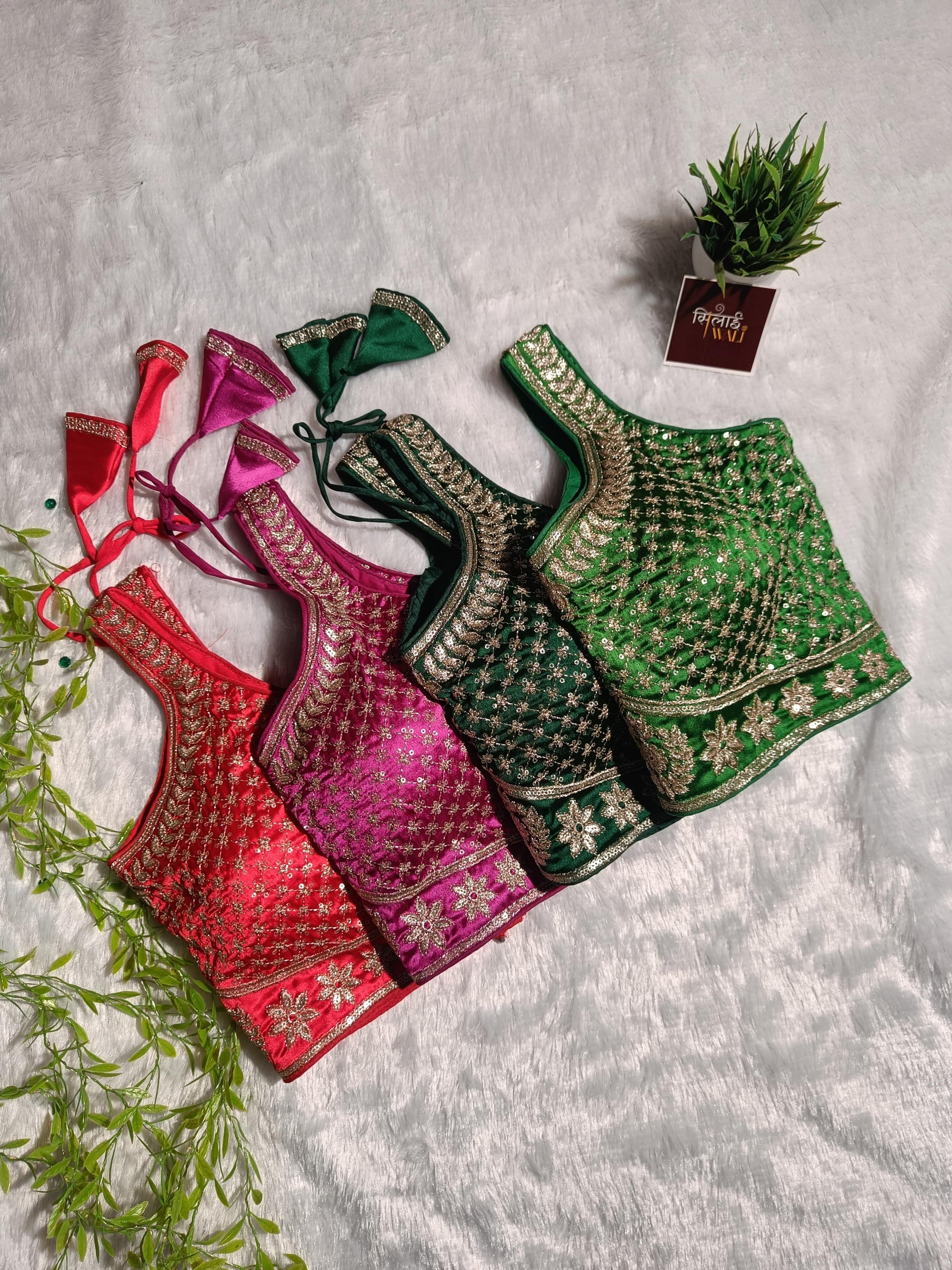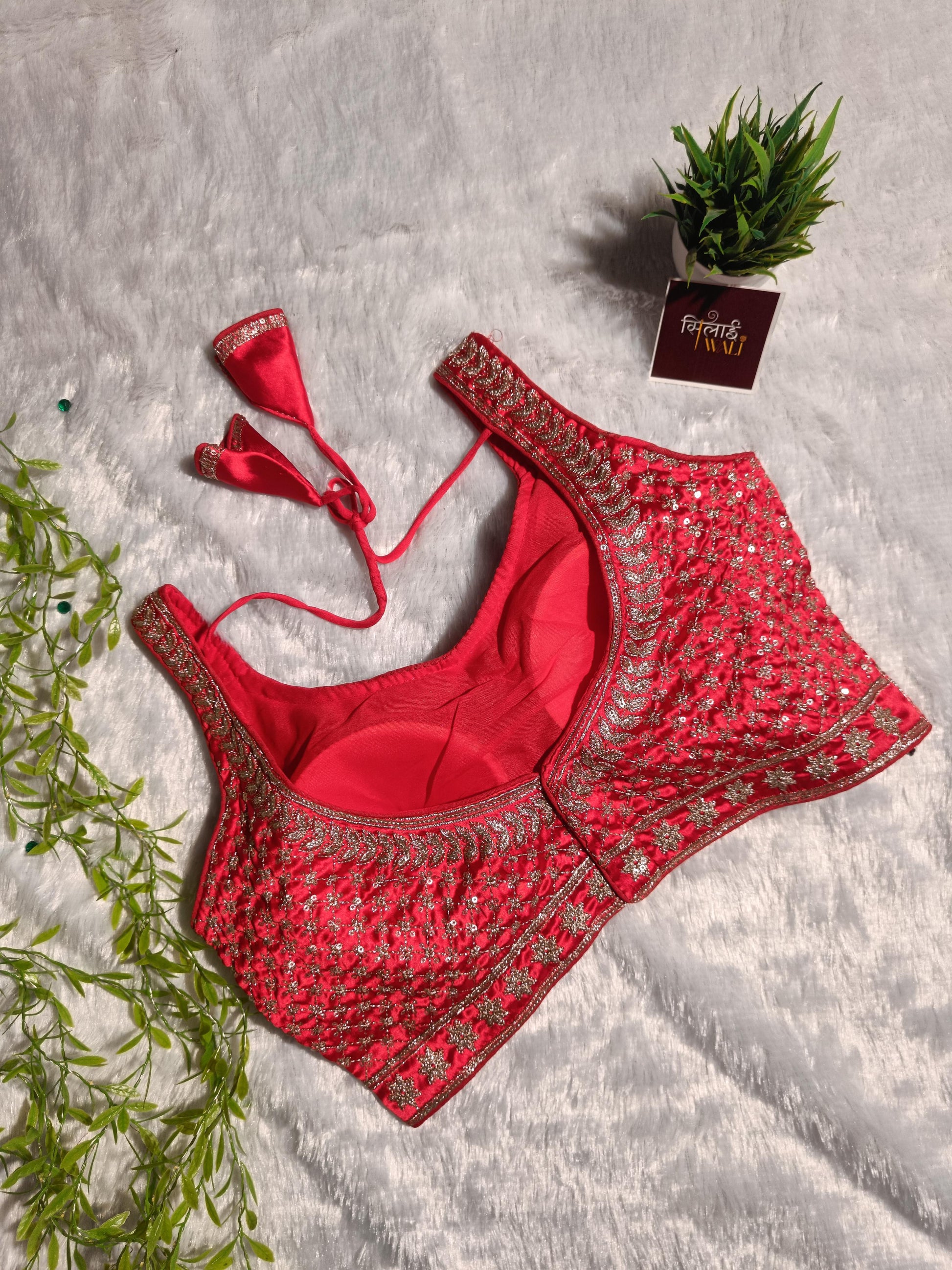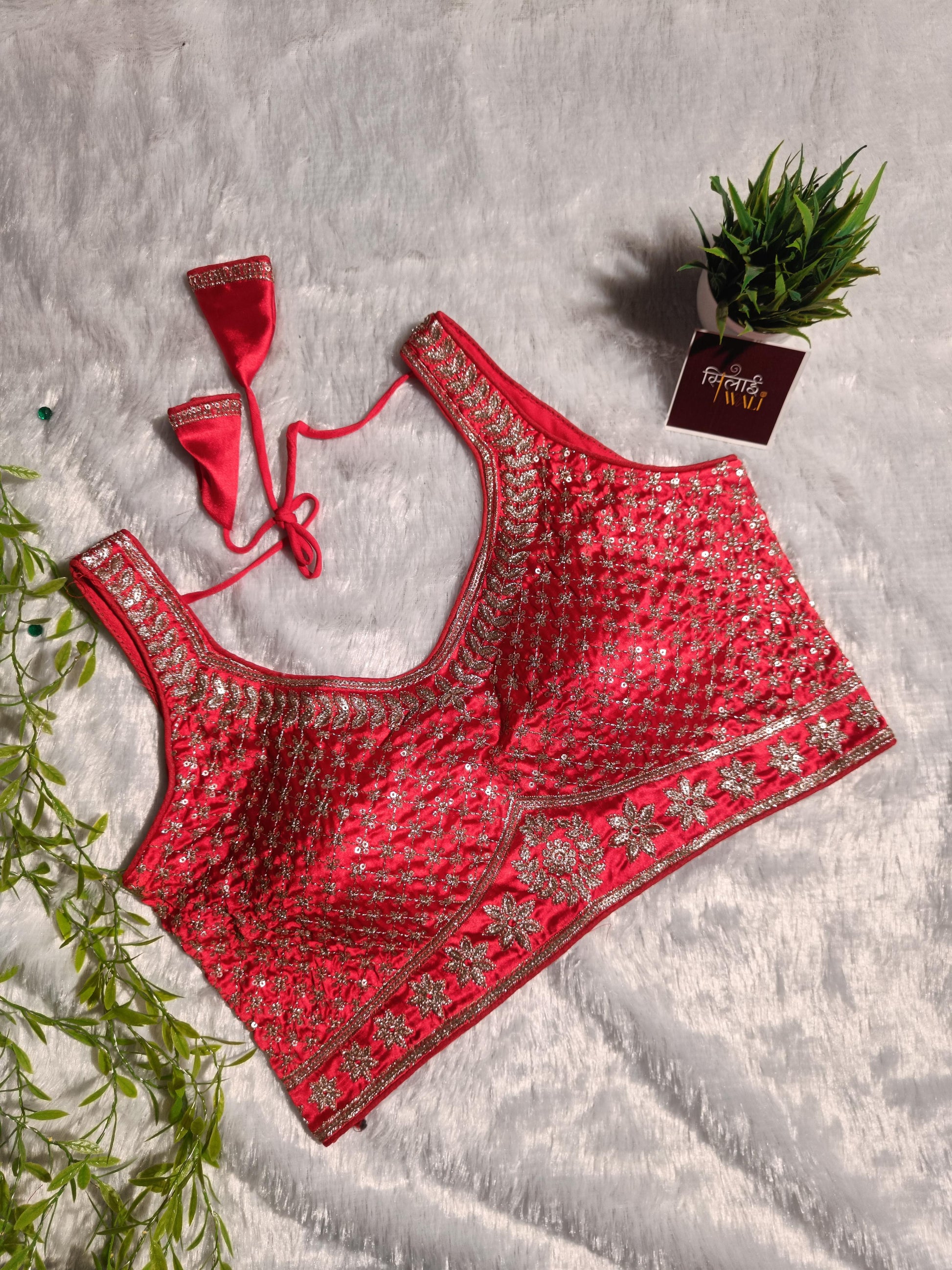 यह खूबसूरत आभूषण कला का प्रतीक है। गहरे लाल रंग का यह ब्लाउज आपके उत्सव के परिधान का केंद्रबिंदु बनने के लिए डिज़ाइन किया गया है, जिसमें गहरे लाल रंग के मुलायम रेशम की समृद्धि को सुनहरे ज़री की भव्यता के साथ मिलाया गया है। एक खूबसूरती से सजी दुल्हन की तरह, इस कपड़े पर जटिल सीक्वेंस जाल किया गया है जो हर कोण से प्रकाश को आकर्षित करता है। यह सजने-संवरने की परंपरा को समर्पित है, और इसे पहनते ही आपको राजसी और तेजस्वी अनुभूति कराता है।