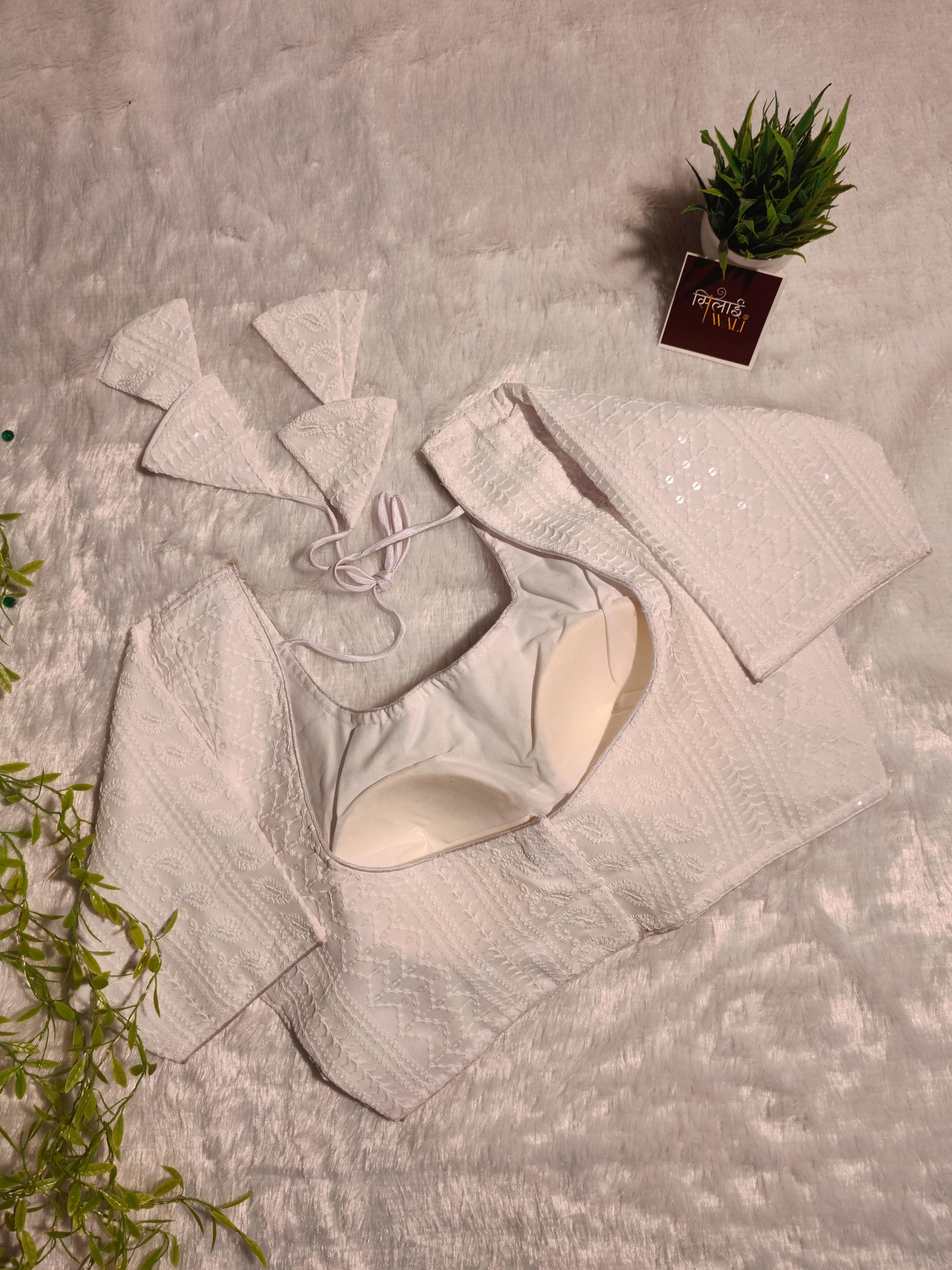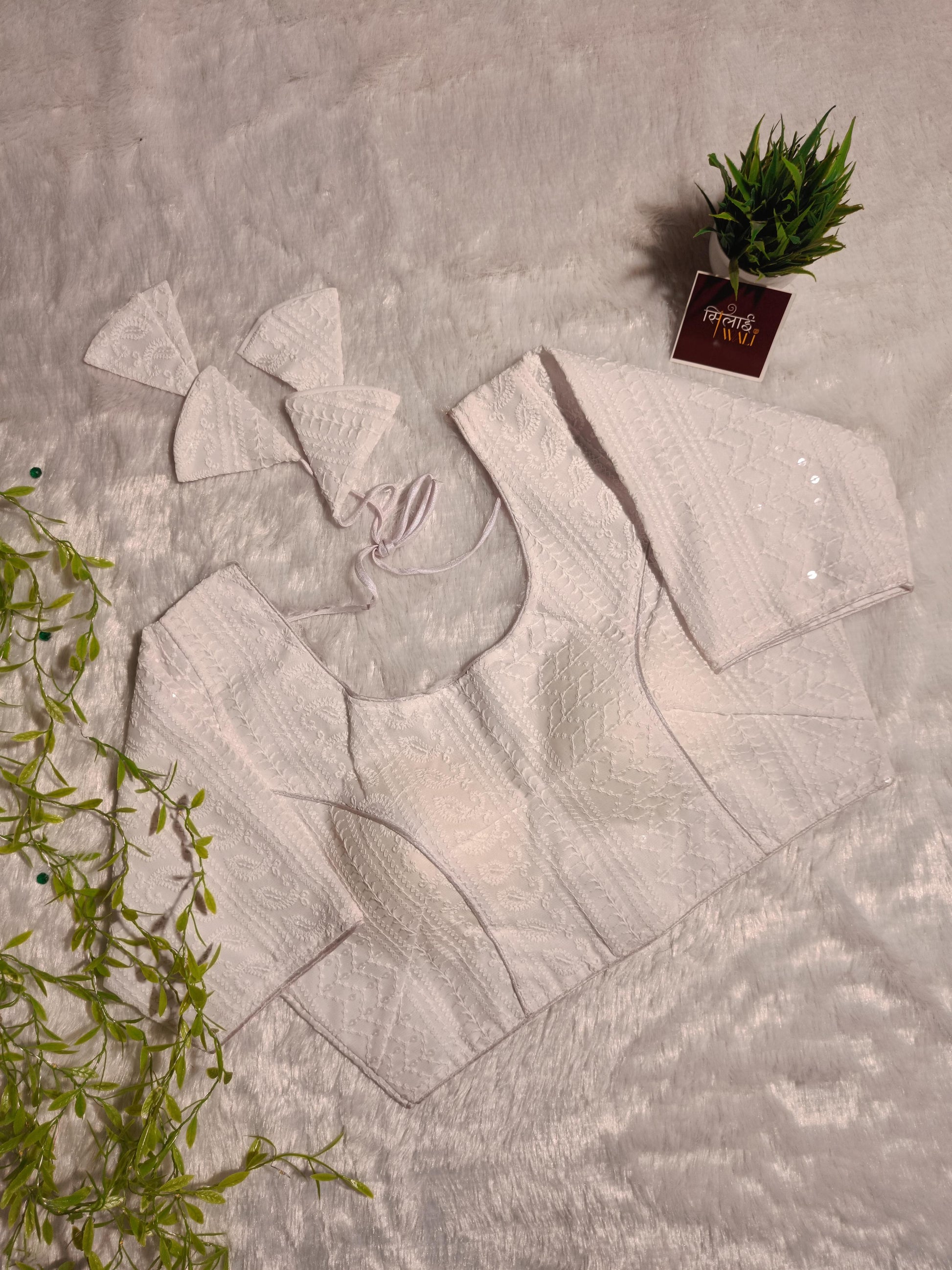 कार्य का प्रकार: सफेद रंग पर सफेद चिकन कढ़ाई, माइक्रो-सीक्विन के साथ