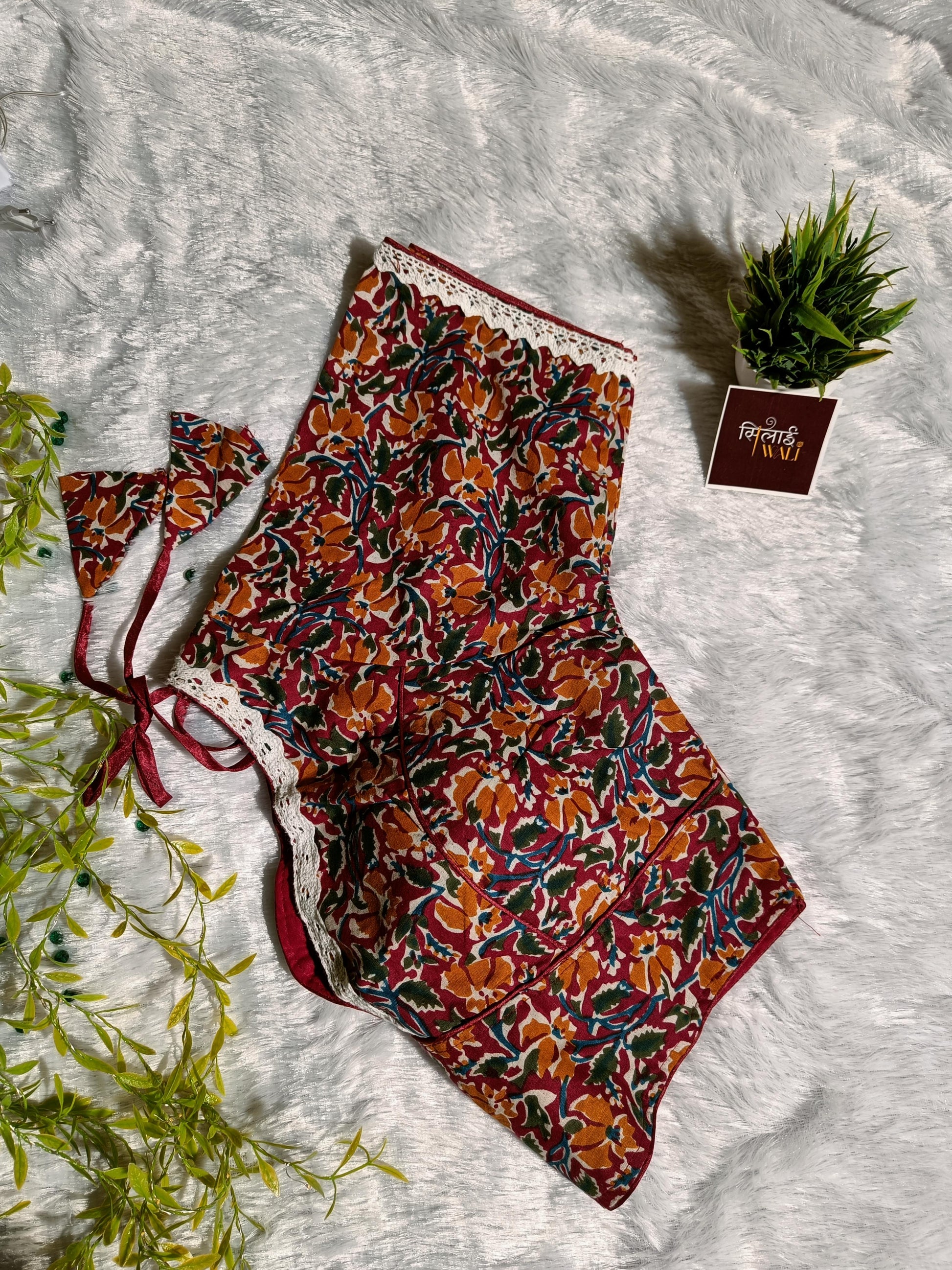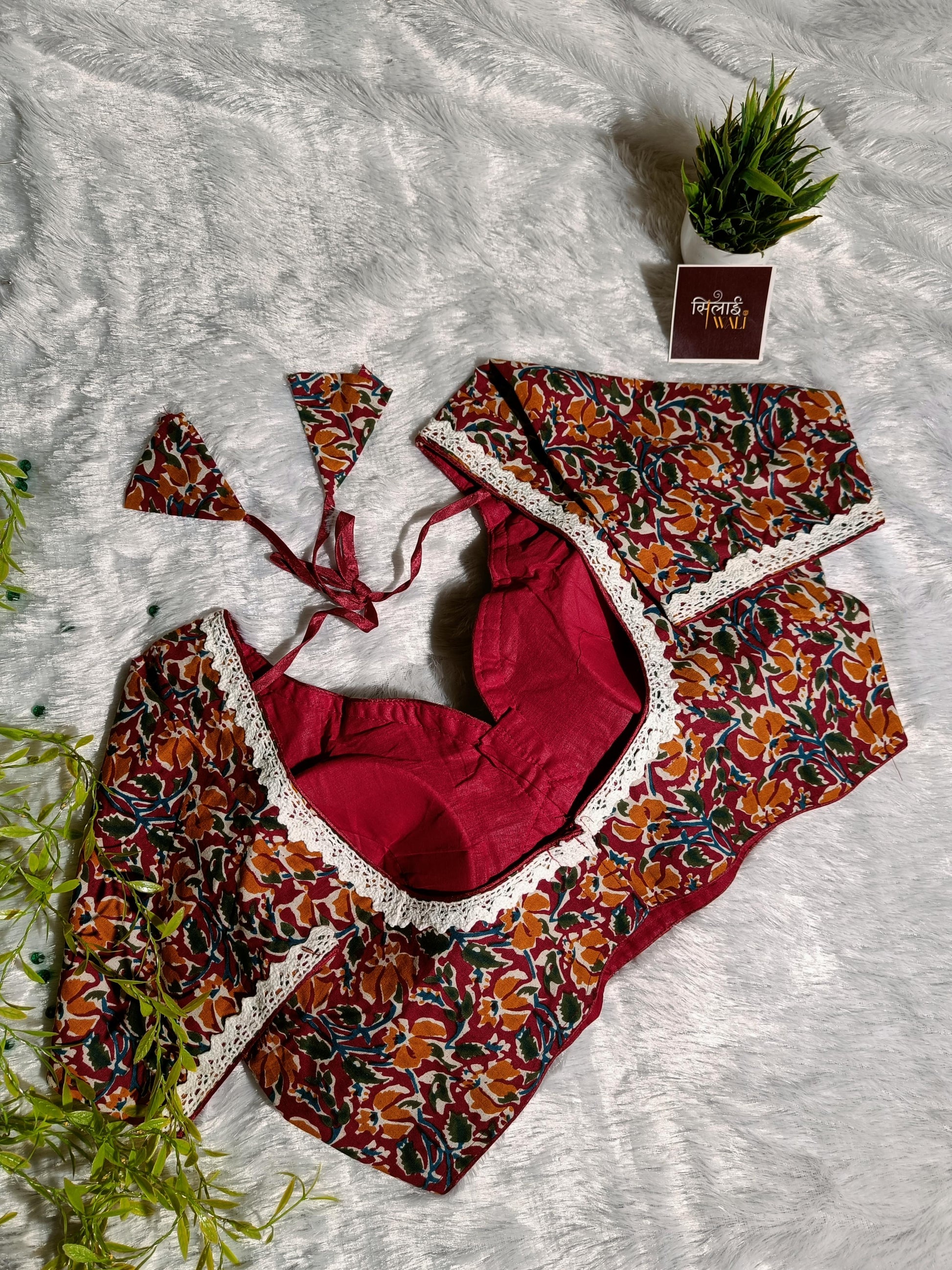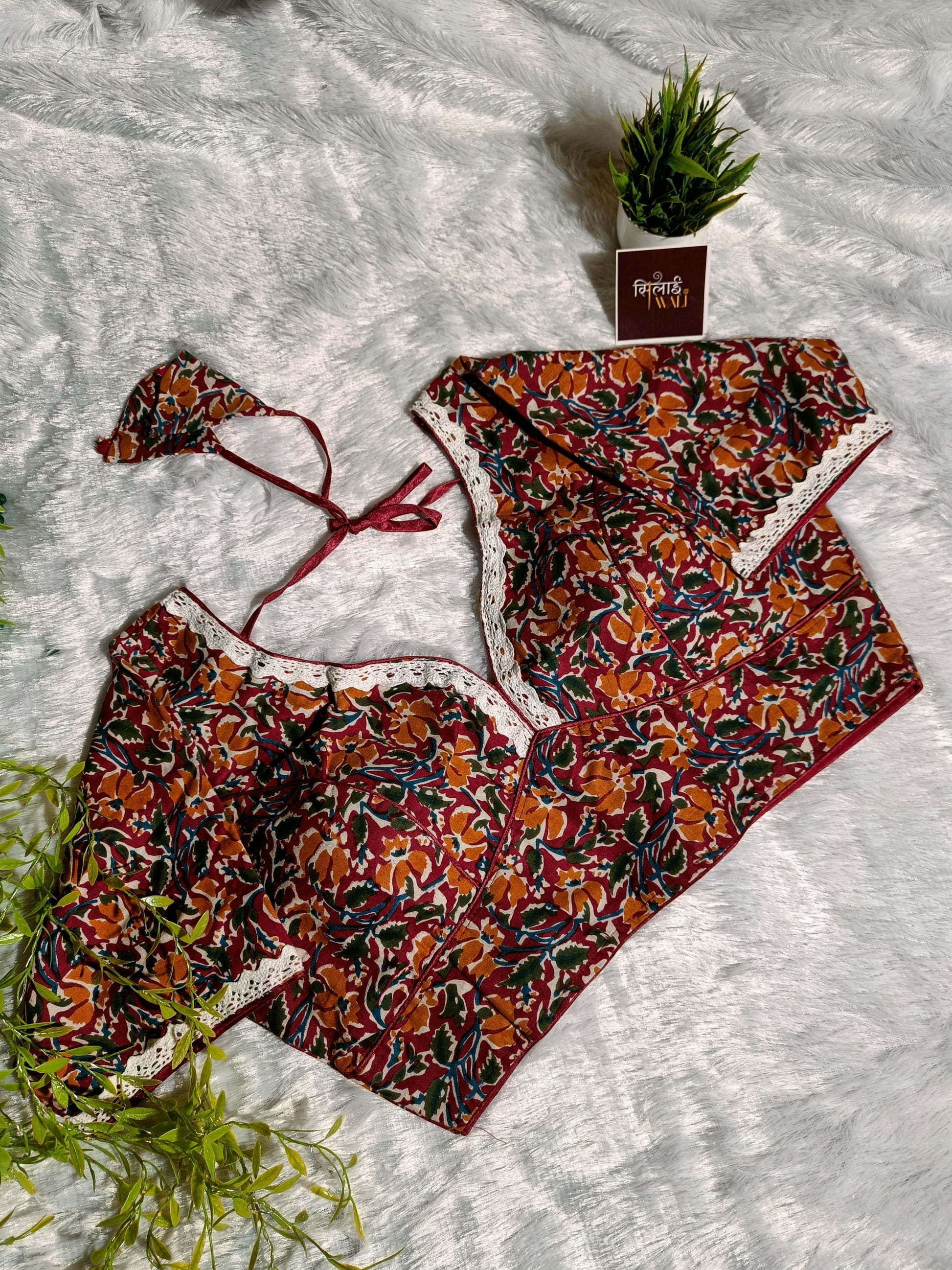Infuse your wardrobe with the vibrant hues of the Autumn Garden Lace Blouse. This stunning piece showcases an intricate botanical print with warm orange, forest green, and mustard tones on a maroon base. Made from soft, high-grade cotton, it offers a luxurious feel against the skin. The blouse features a modern plunging V-neckline finished with intricate crochet-style lace that frames the torso beautifully. Its earthy palette and refined silhouette make it an ideal choice for festive gatherings or casual ethnic outings.