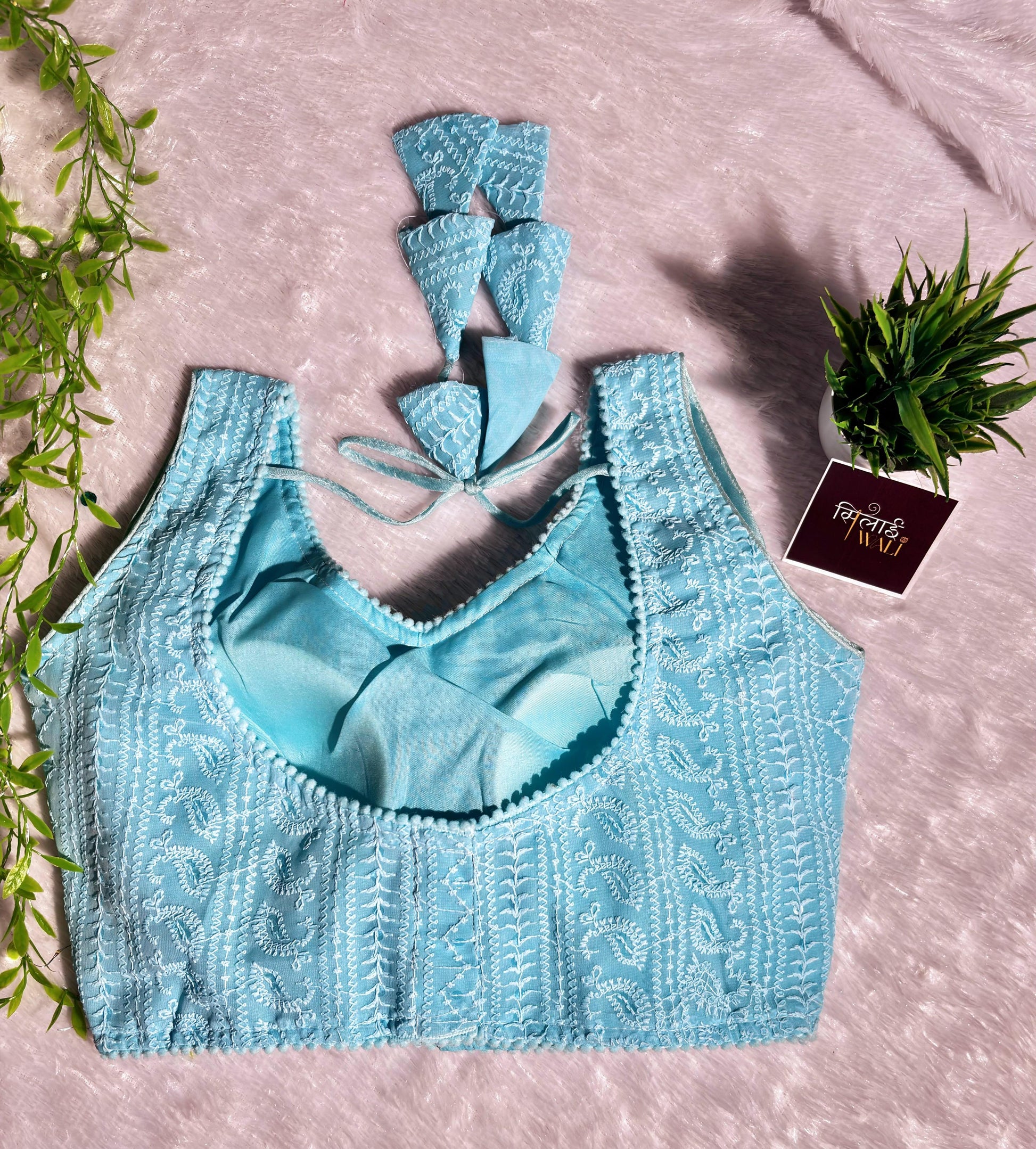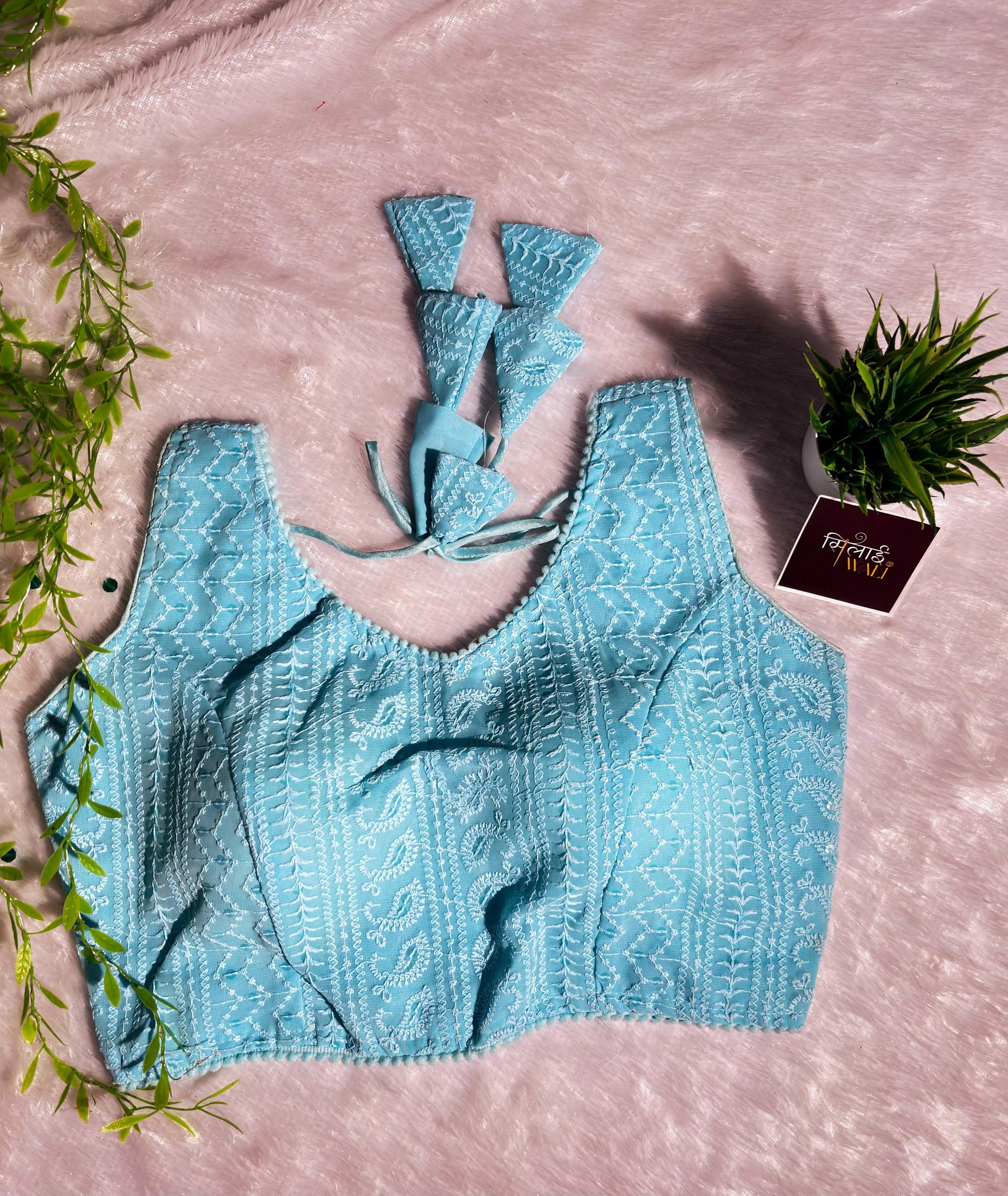 Refresh your ethnic look with the Serene Sky Blue blouse. The cooling hue makes it perfect for outdoor events, while the heavy embroidery ensures it remains festive. Pair it with a white chiffon saree for a classic "Bollywood" inspired look.