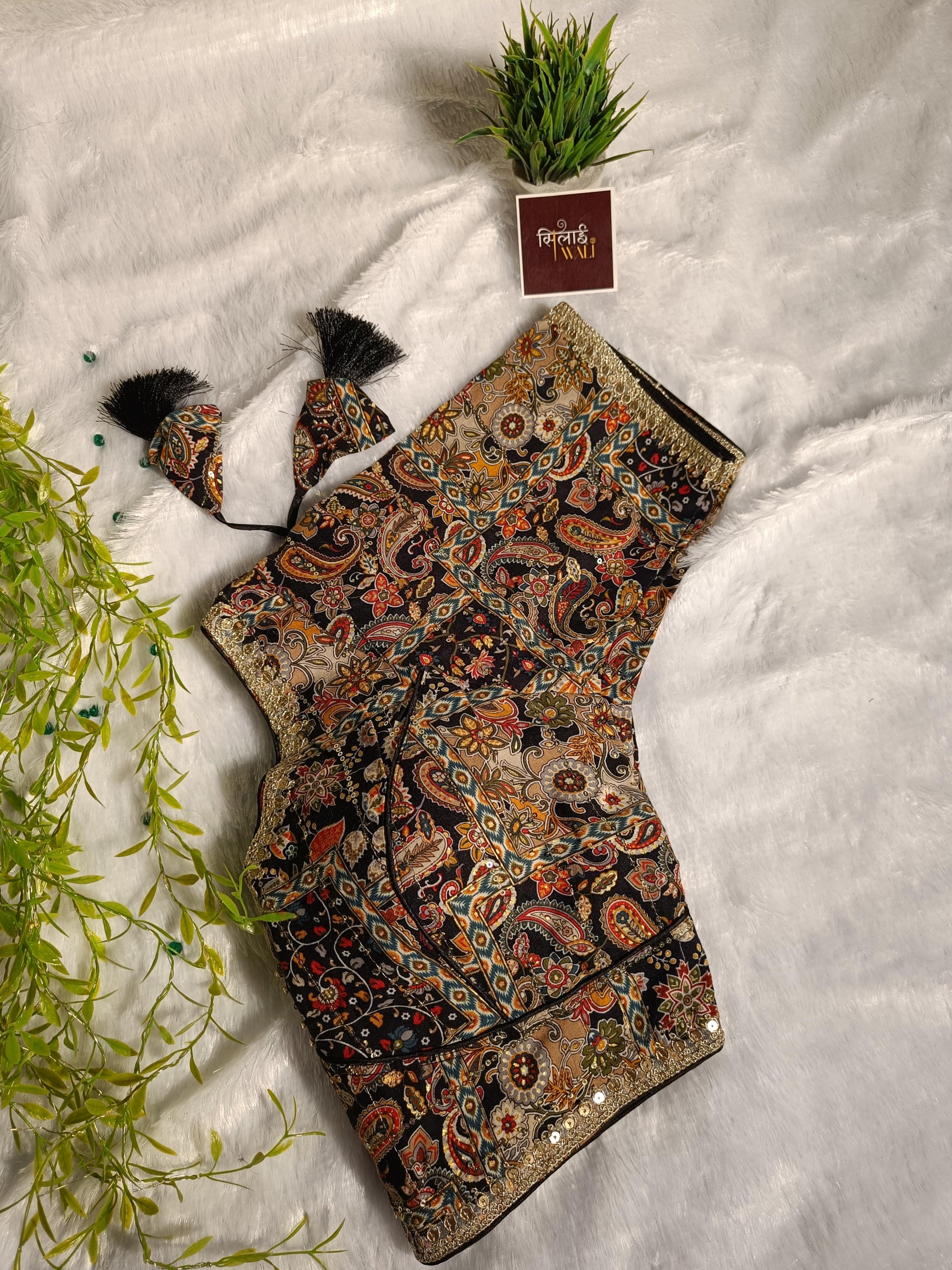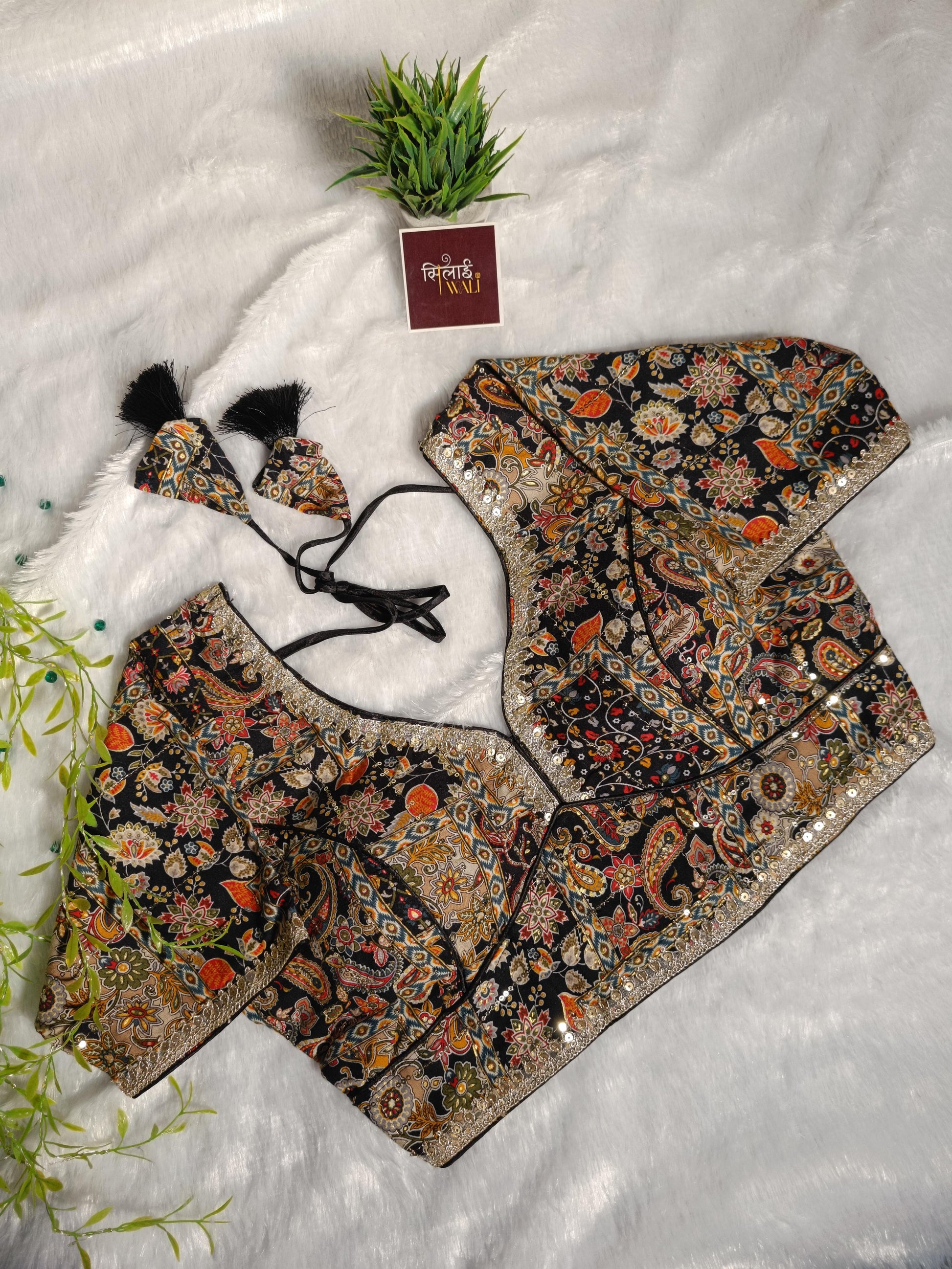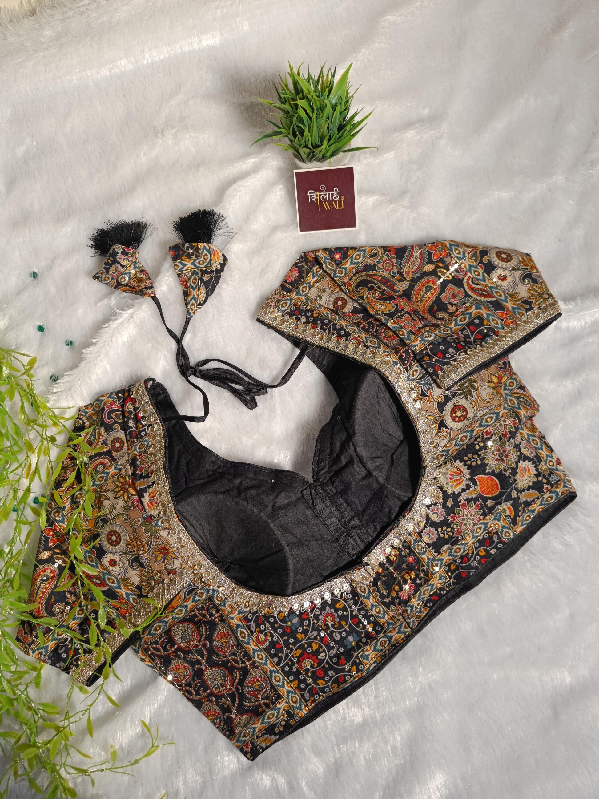 Make a bold statement with our Banjara-inspired Work Blouse. This black canvas is brought to life with vibrant orange, green, and blue embroidery in geometric patterns. Real accents (Abhla work) catch the light beautifully, making it the ultimate choice for Garba nights or boho-chic weddings.