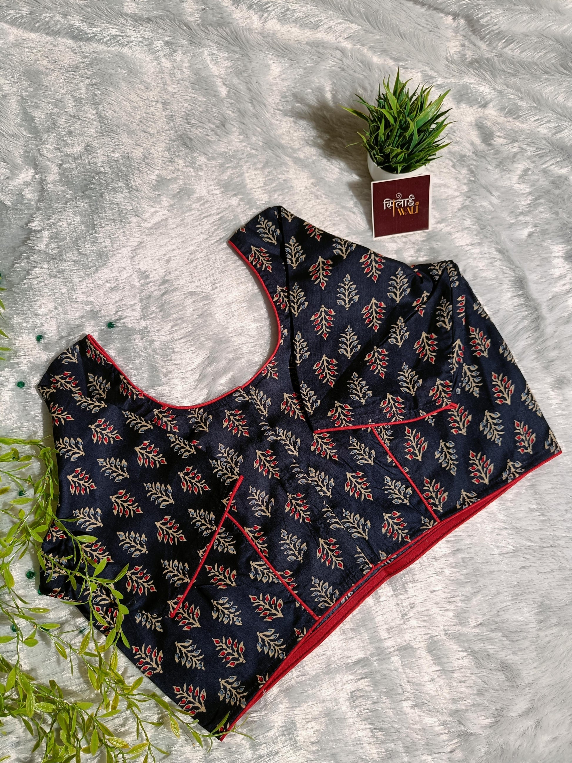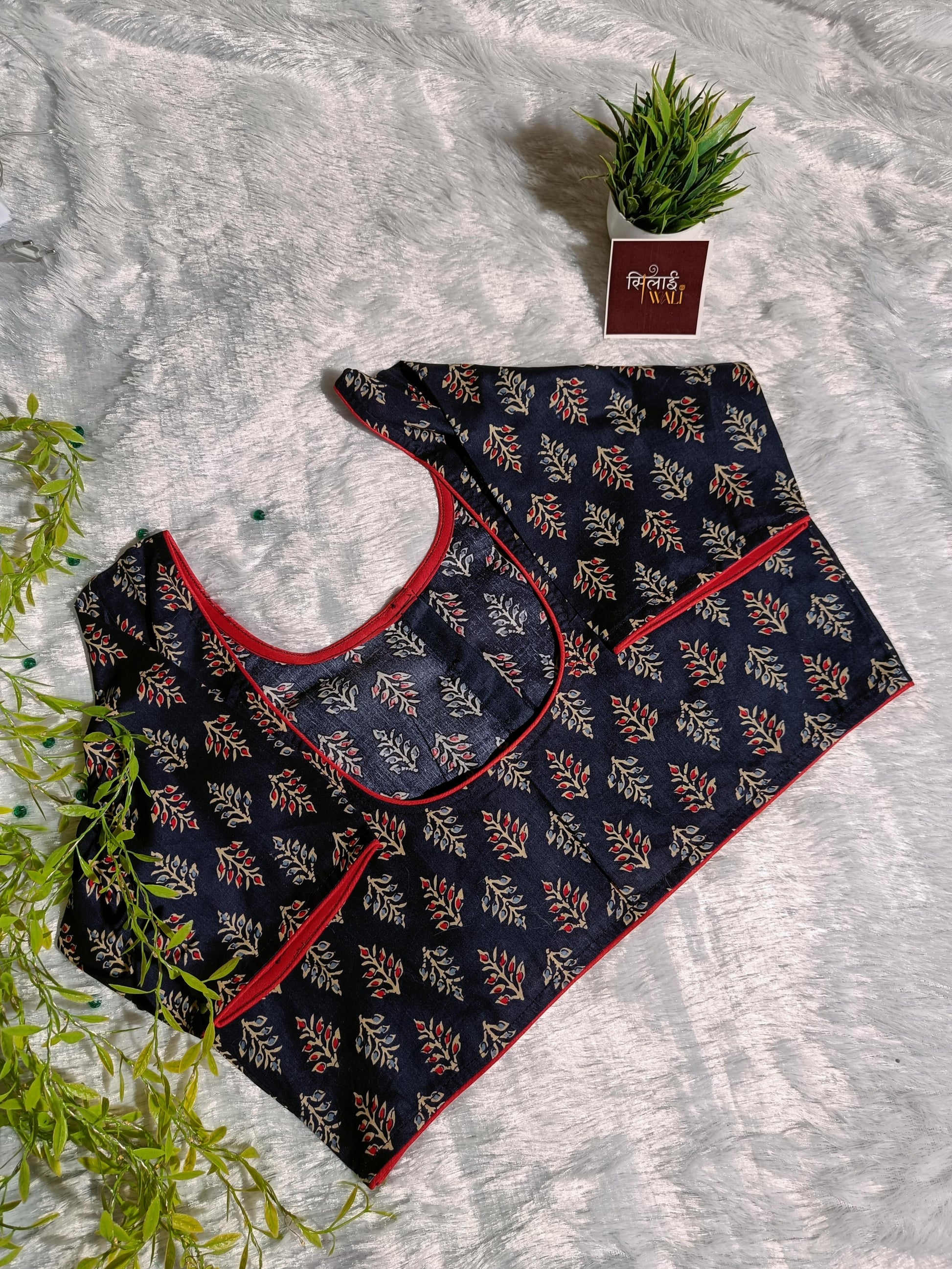Modern meets traditional in this Indigo Blue Botanical Print Blouse. Designed for the woman on the go, the non-padded structure ensures day-long comfort, while the contrasting red piping adds a sharp, tailored finish. The 3/4 sleeves and high-collar design provide a polished look for the boardroom or a casual work lunch.