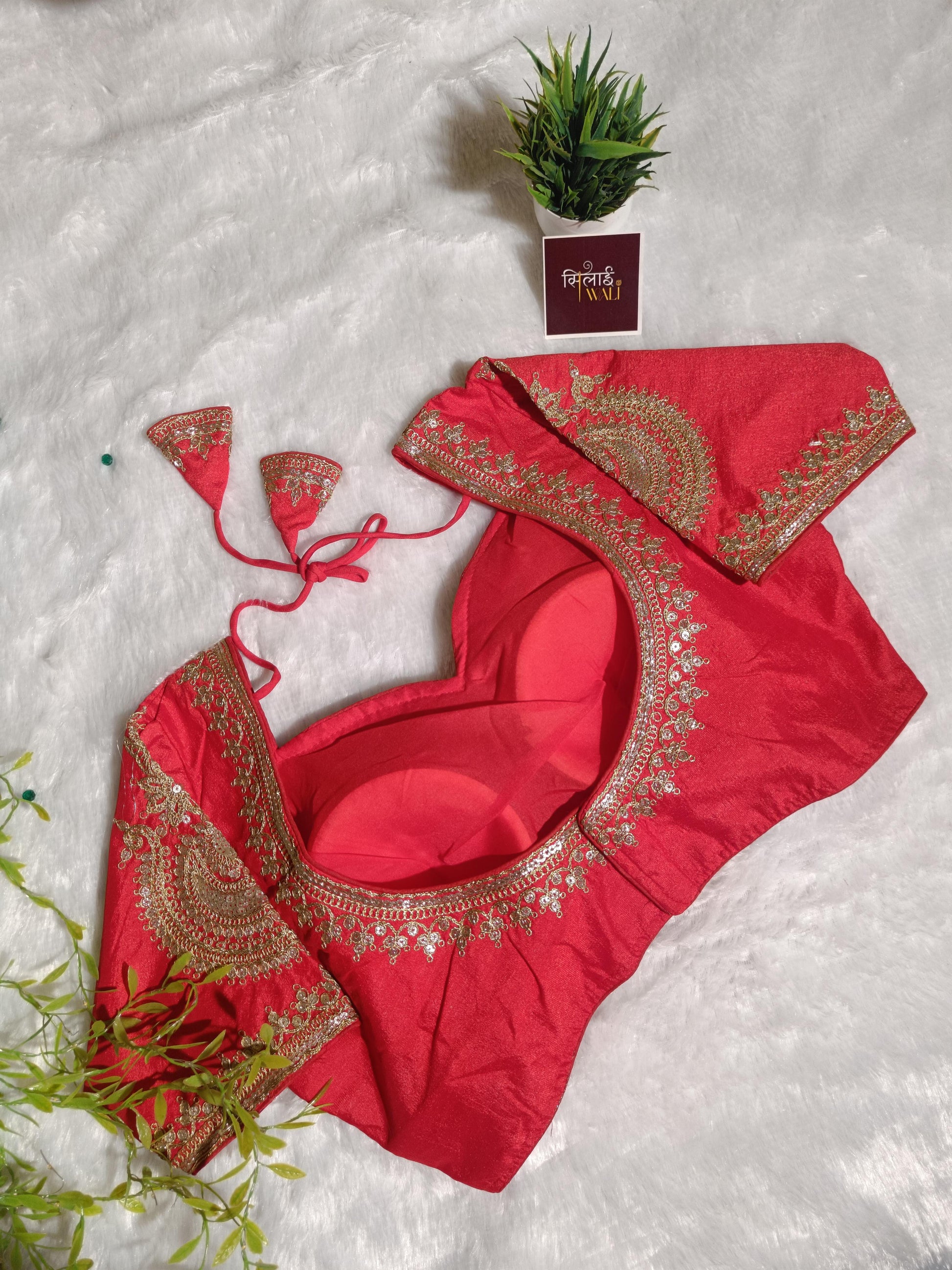 Designed specifically for the modern bride, this Crimson Red blouse is the epitome of traditional craftsmanship. The vibrant red fabric is adorned with traditional motifs executed in gold zari and sequins. The structured fit and premium padding provide comfort without compromising on style.