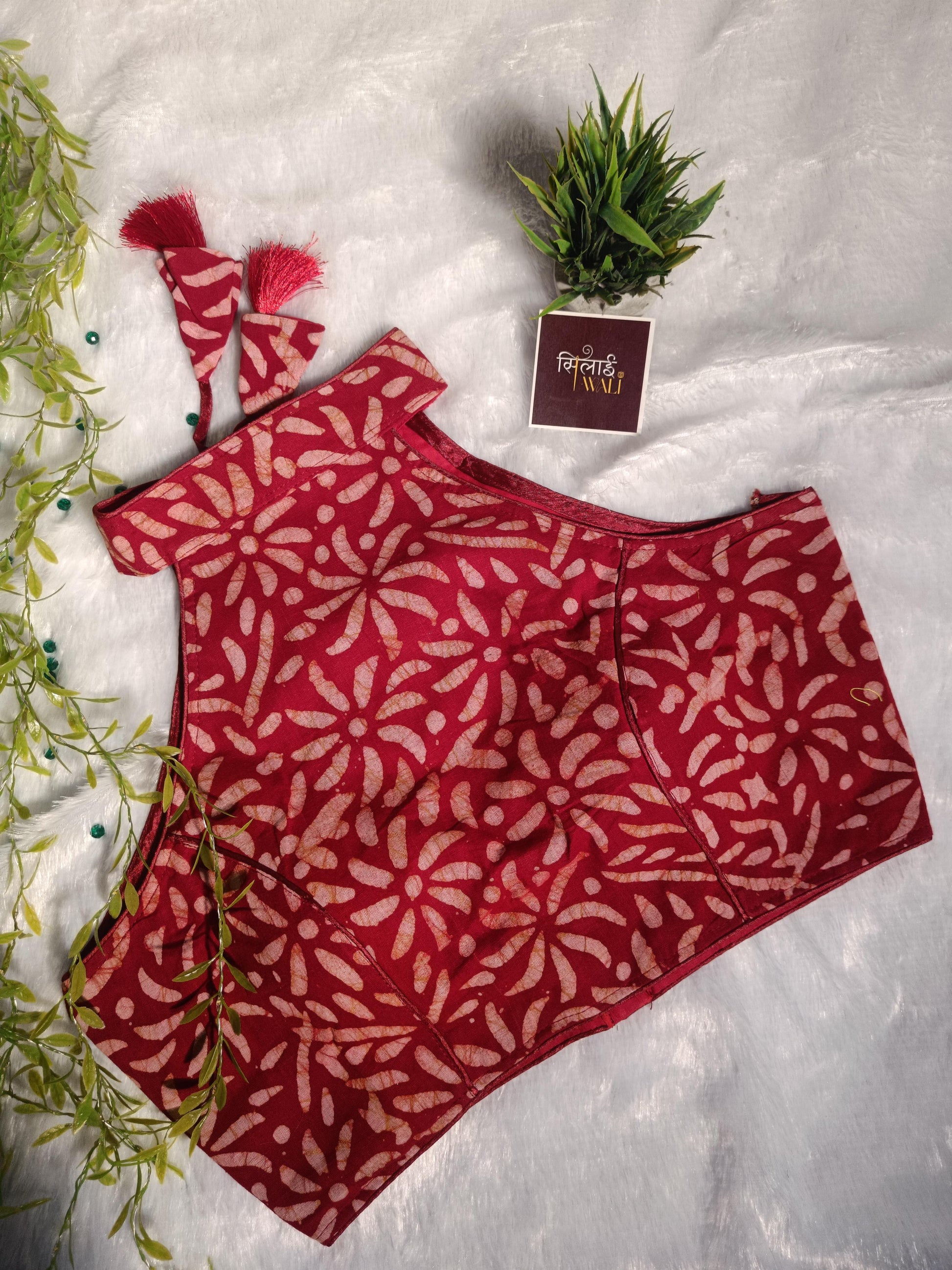 The "Crimson Bloom" is a celebration of classic Indian red tones. This rich maroon-red blouse is adorned with swirling batik petals, offering a look that is both romantic and traditional. It is specifically designed to pair beautifully with white, gold, or cream sarees, making it a versatile addition to your festive capsule wardrobe.