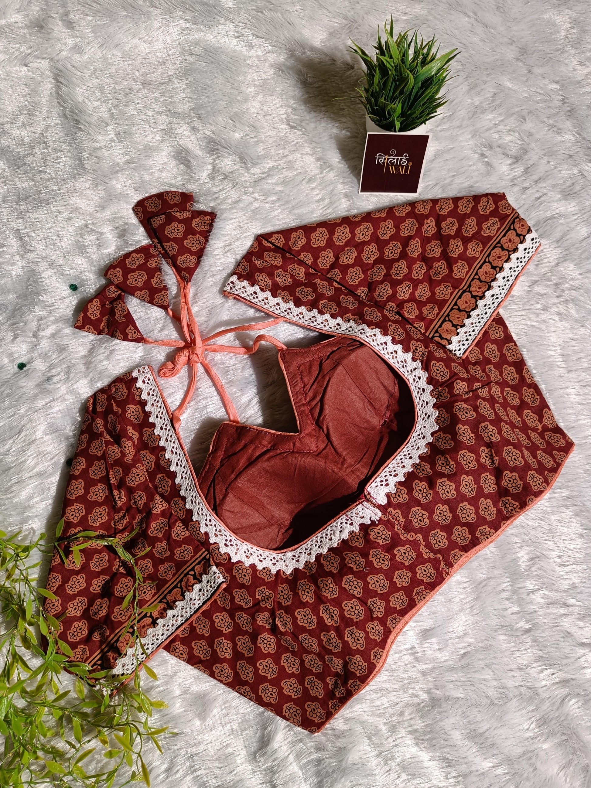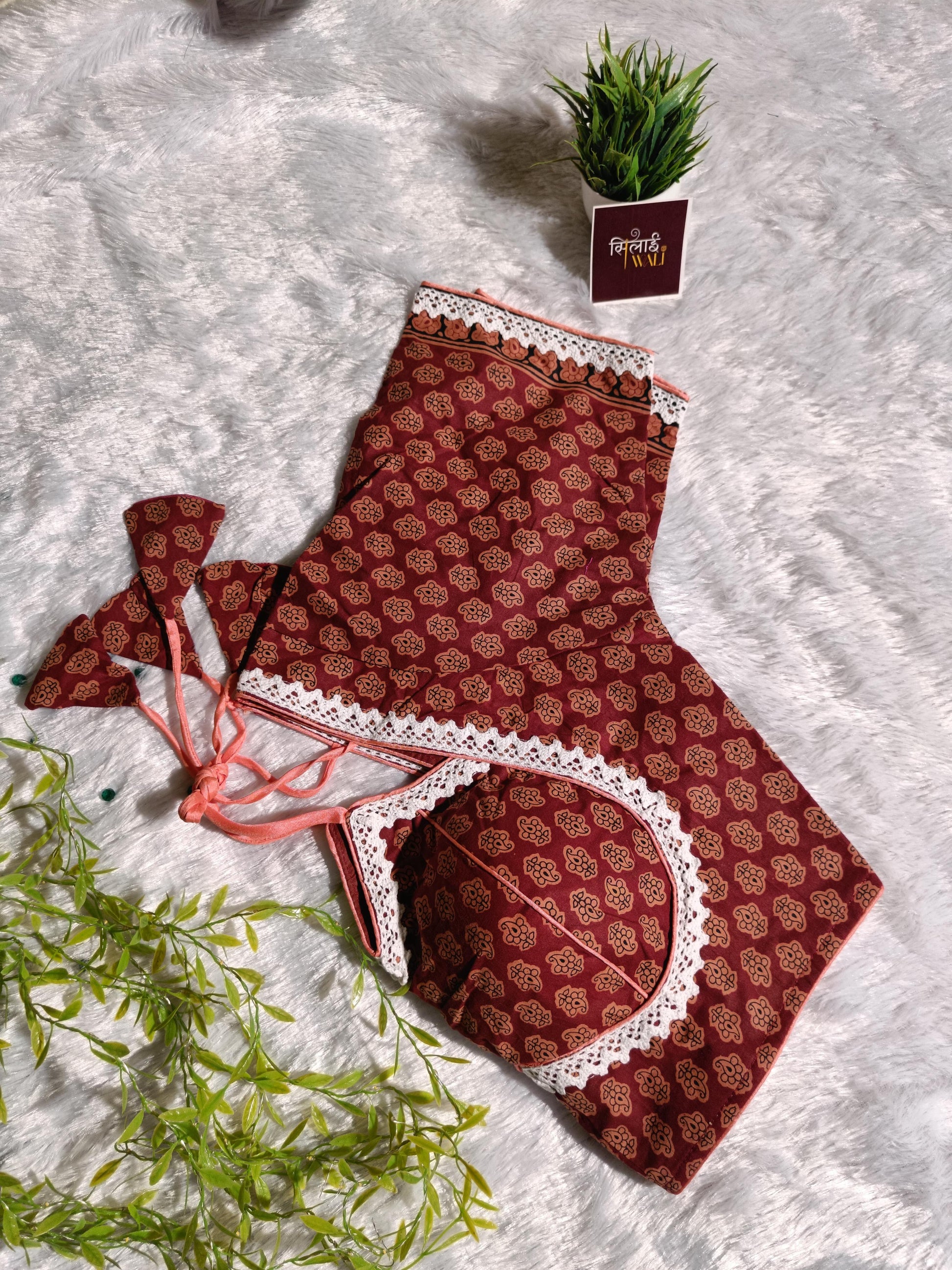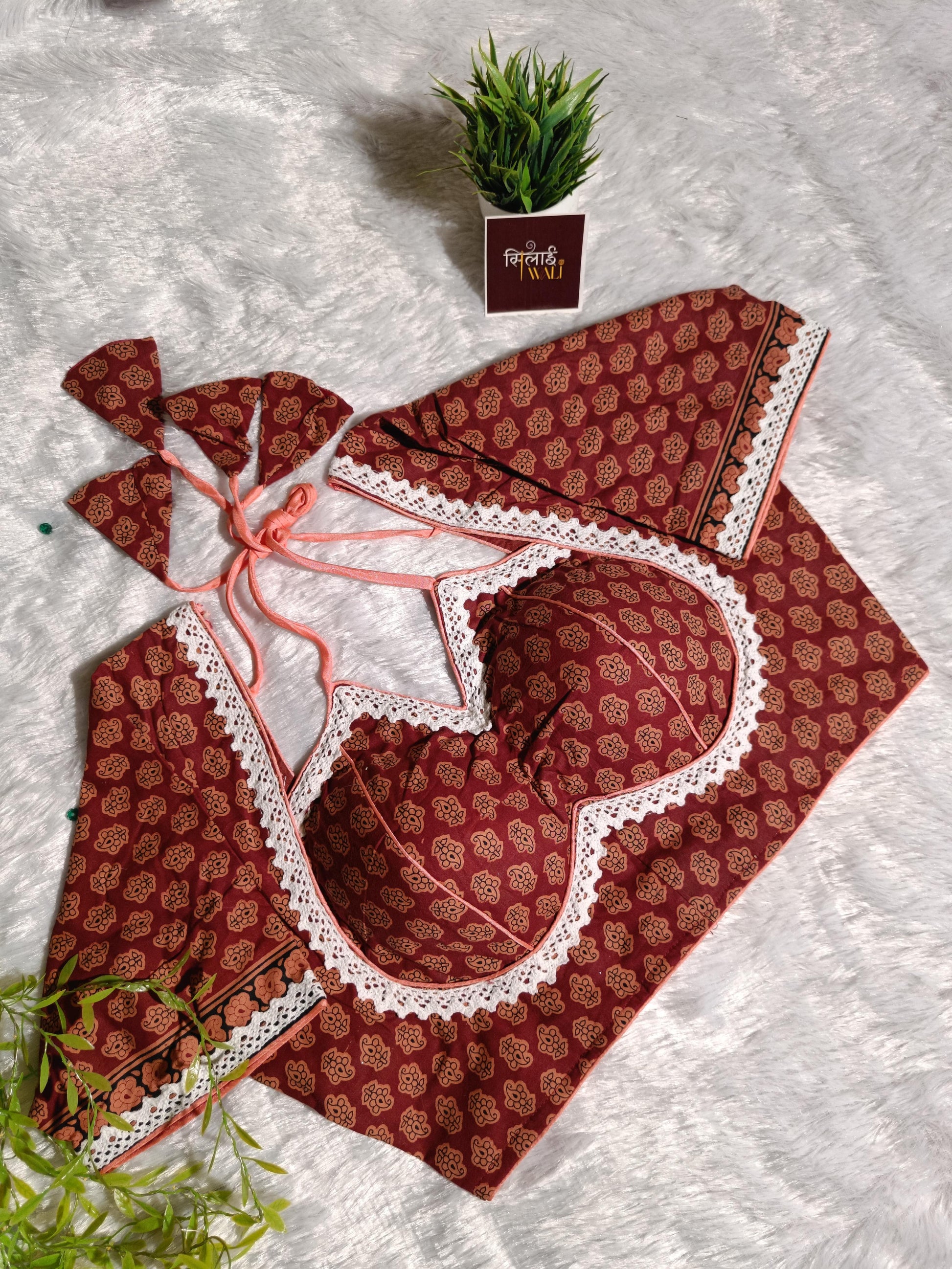 Embrace the warmth of autumn tones with this Earthy Brown Masaba Cut blouse. Featuring a dainty cream floral motif, this piece is the epitome of "Boho-Chic." The crisp white lace detailing along the neckline and hem provides a sharp contrast, making it pop against the chocolate-brown base.