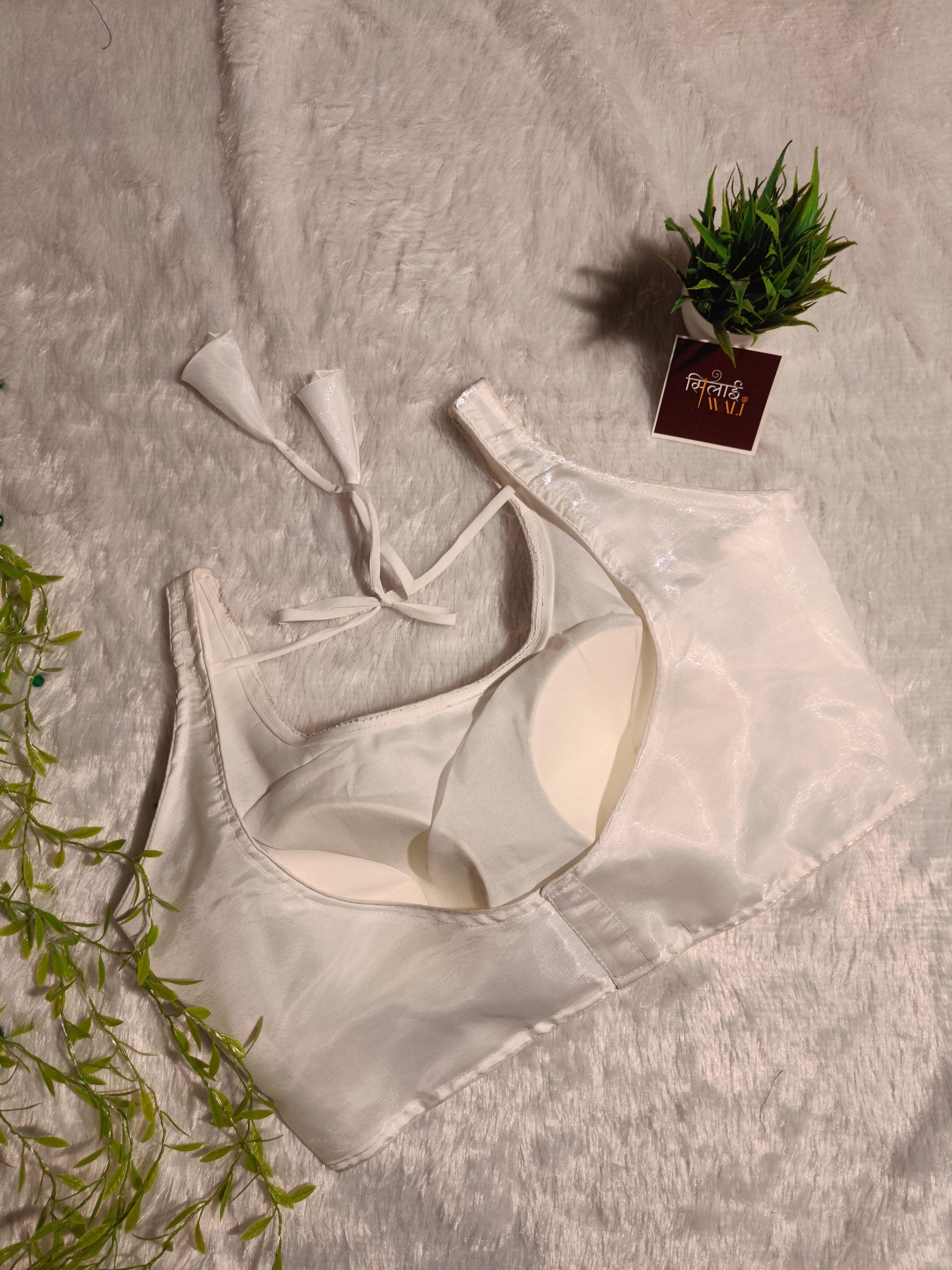 This versatile pristine white blouse is a must-have staple for any wardrobe. Crafted from high-shine shimmer silk, it offers a sophisticated glow that pairs perfectly with any colored saree or lehenga. The clean design combined with the stylish back tie-up makes it a modern ethnic favorite.