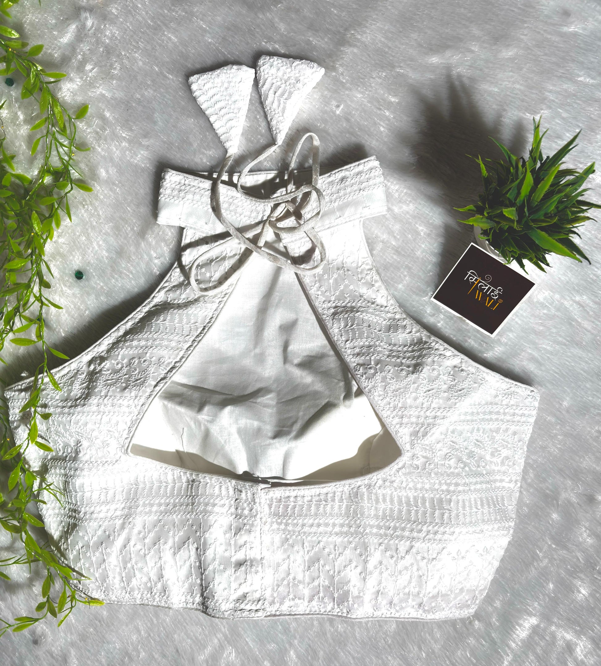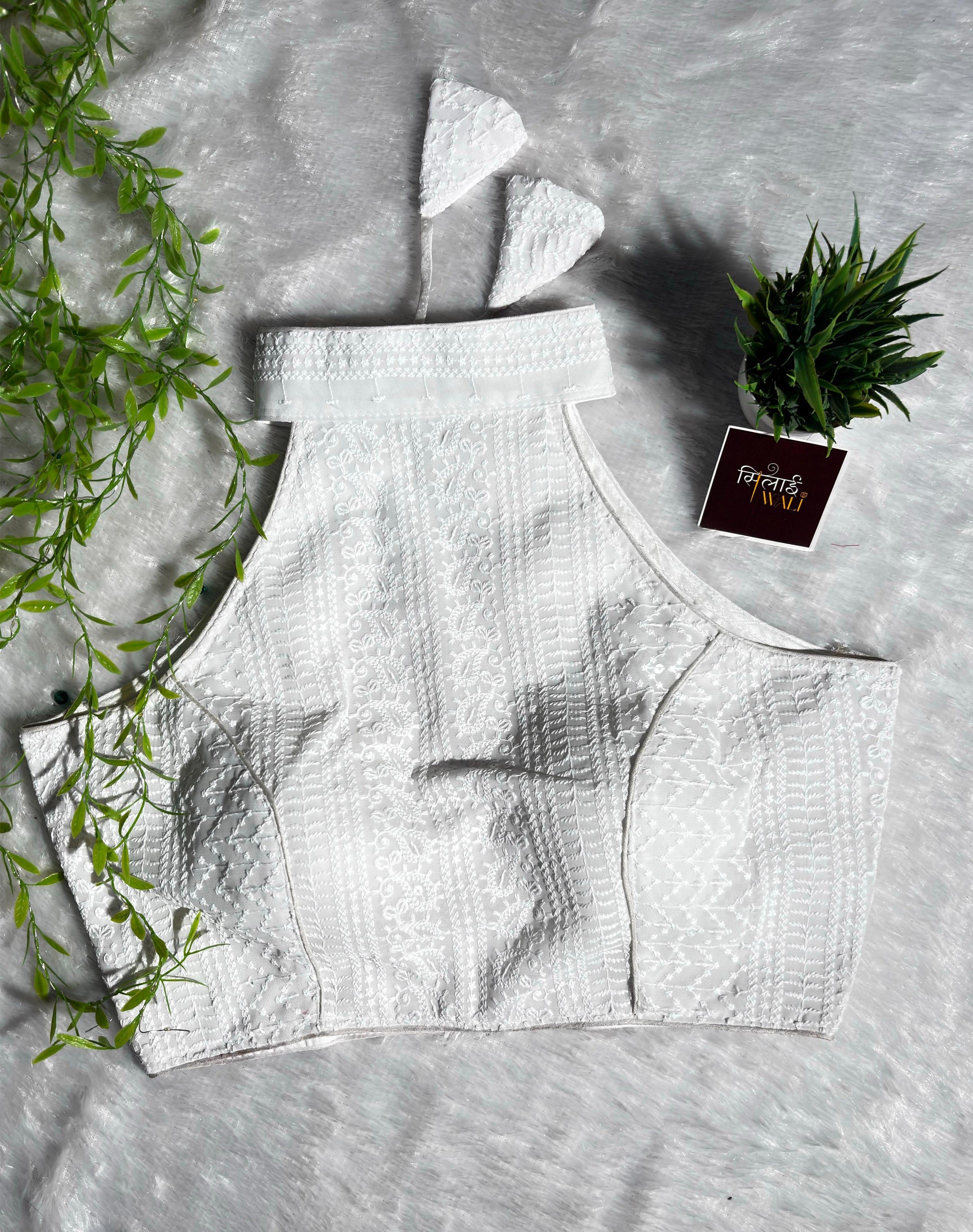 Timeless and sophisticated, our White Chikankari Halter Blouse is the epitome of elegance. The intricate white-on-white embroidery on breathable georgette makes it a versatile piece for any saree. Features a secure halter tie-up and a tailored finish.