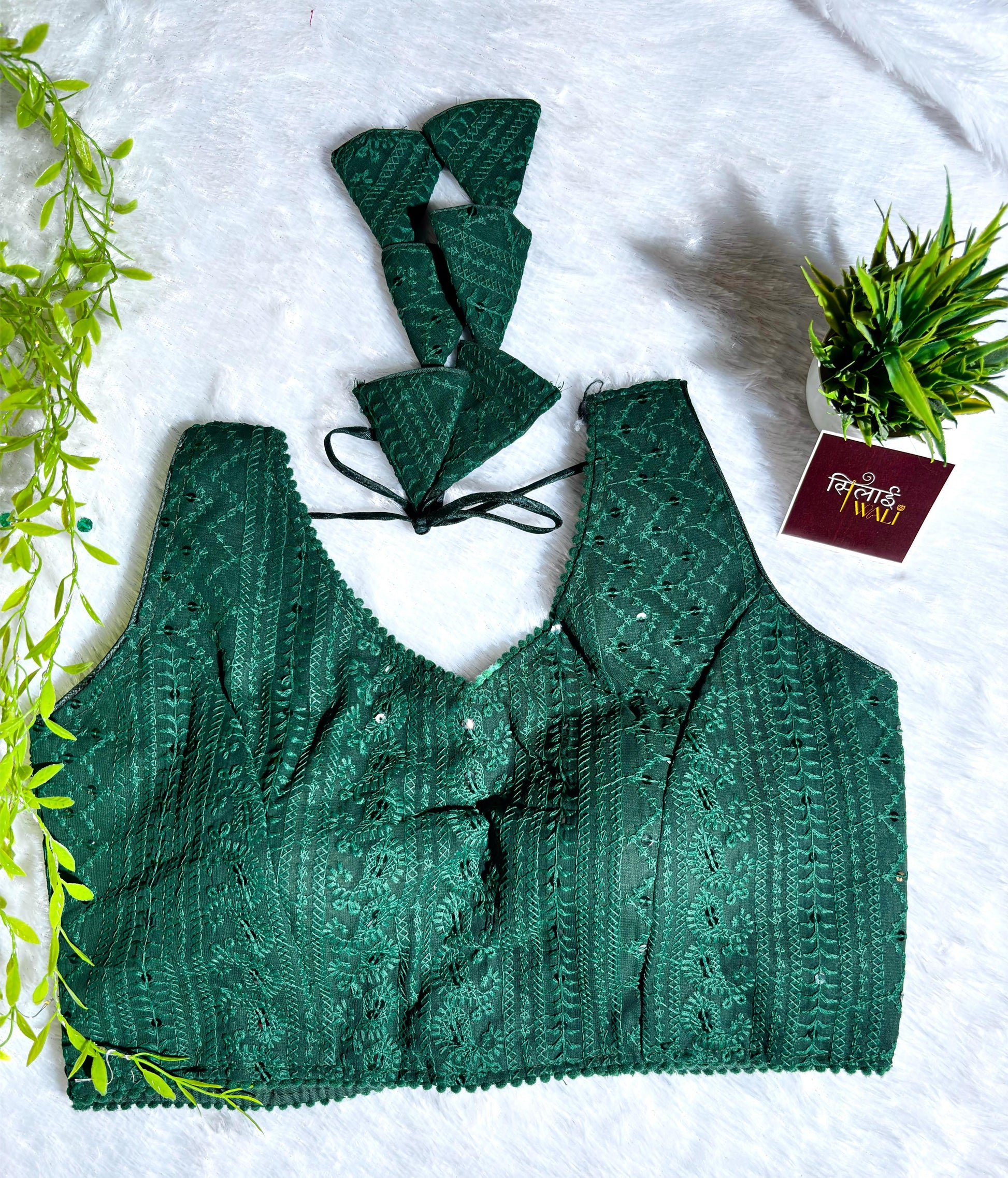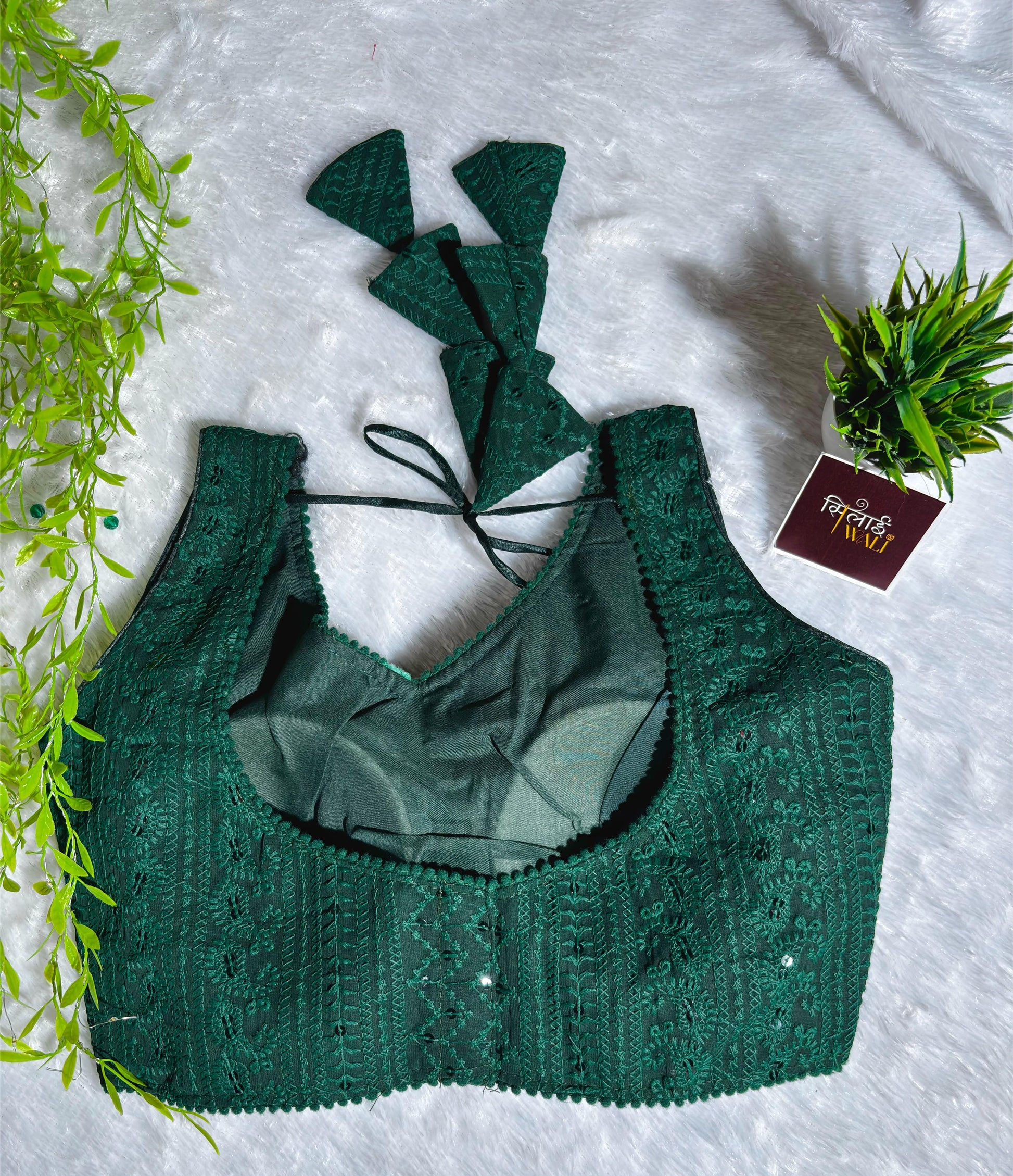 A vibrant choice for Mehendi functions or festive pujas. This Emerald Green blouse features dense embroidery that mimics traditional hand-work. The pop of green is both refreshing and traditional.