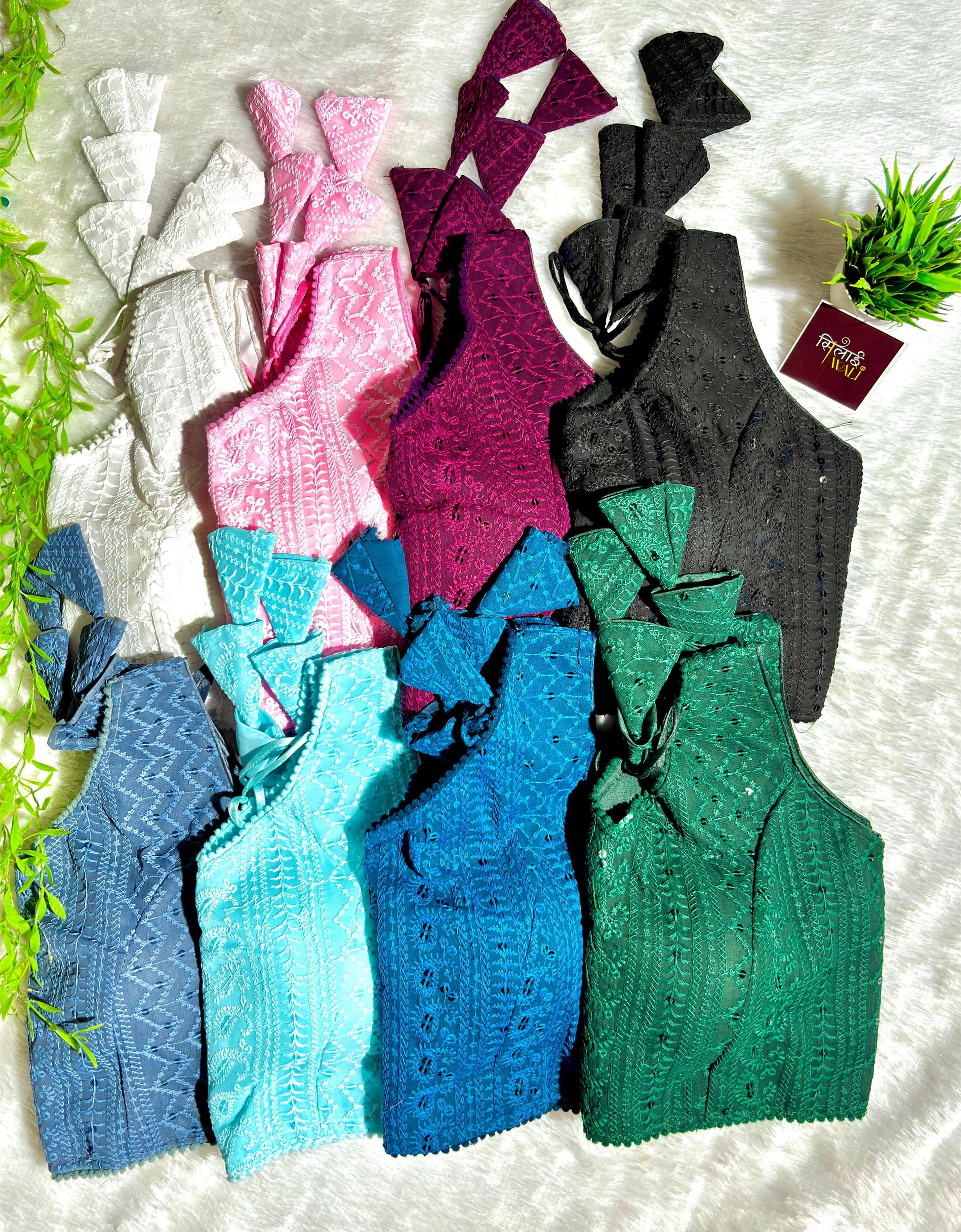 Work: Detailed Lucknowi Chikankari with sequin florets.