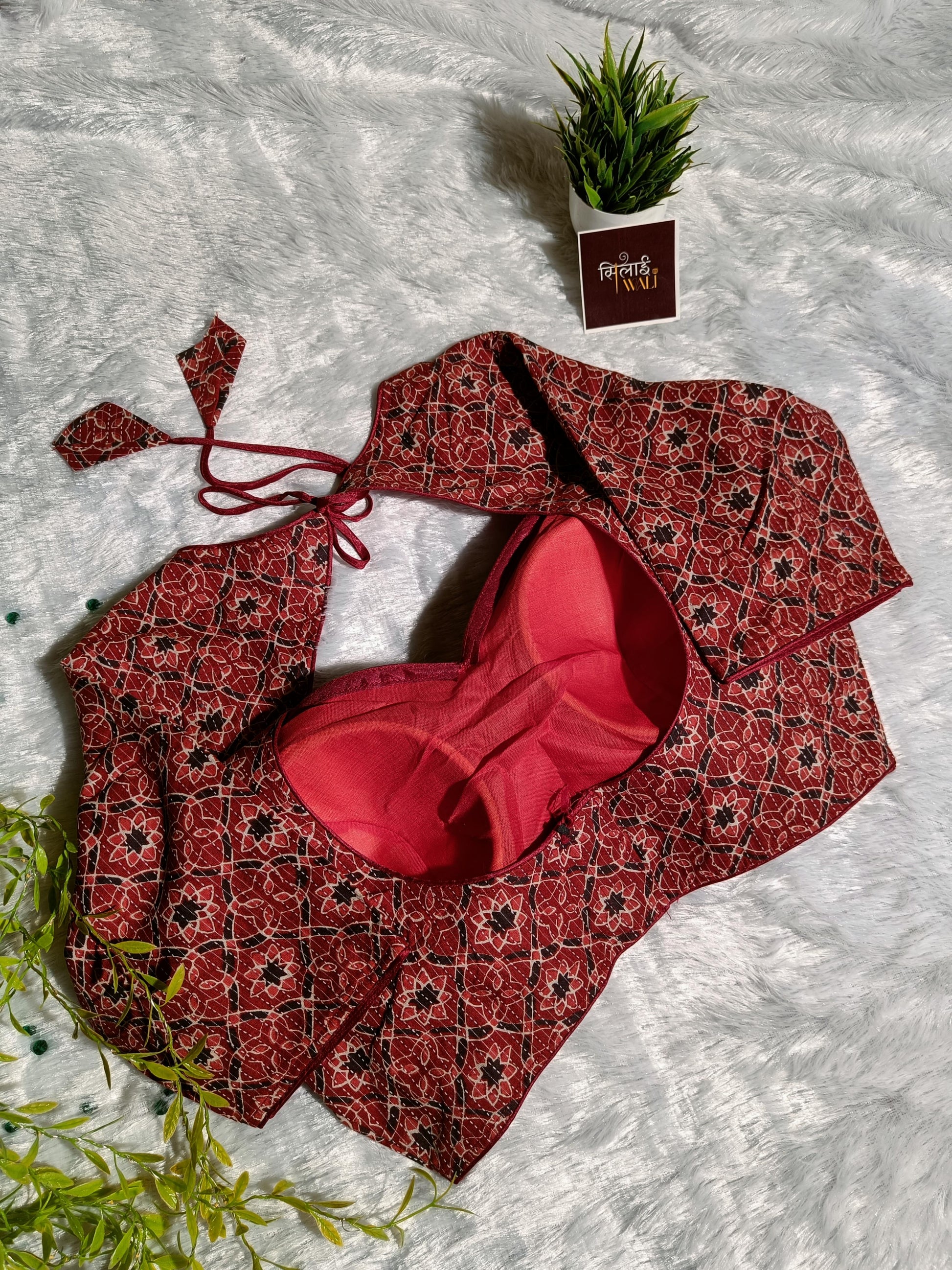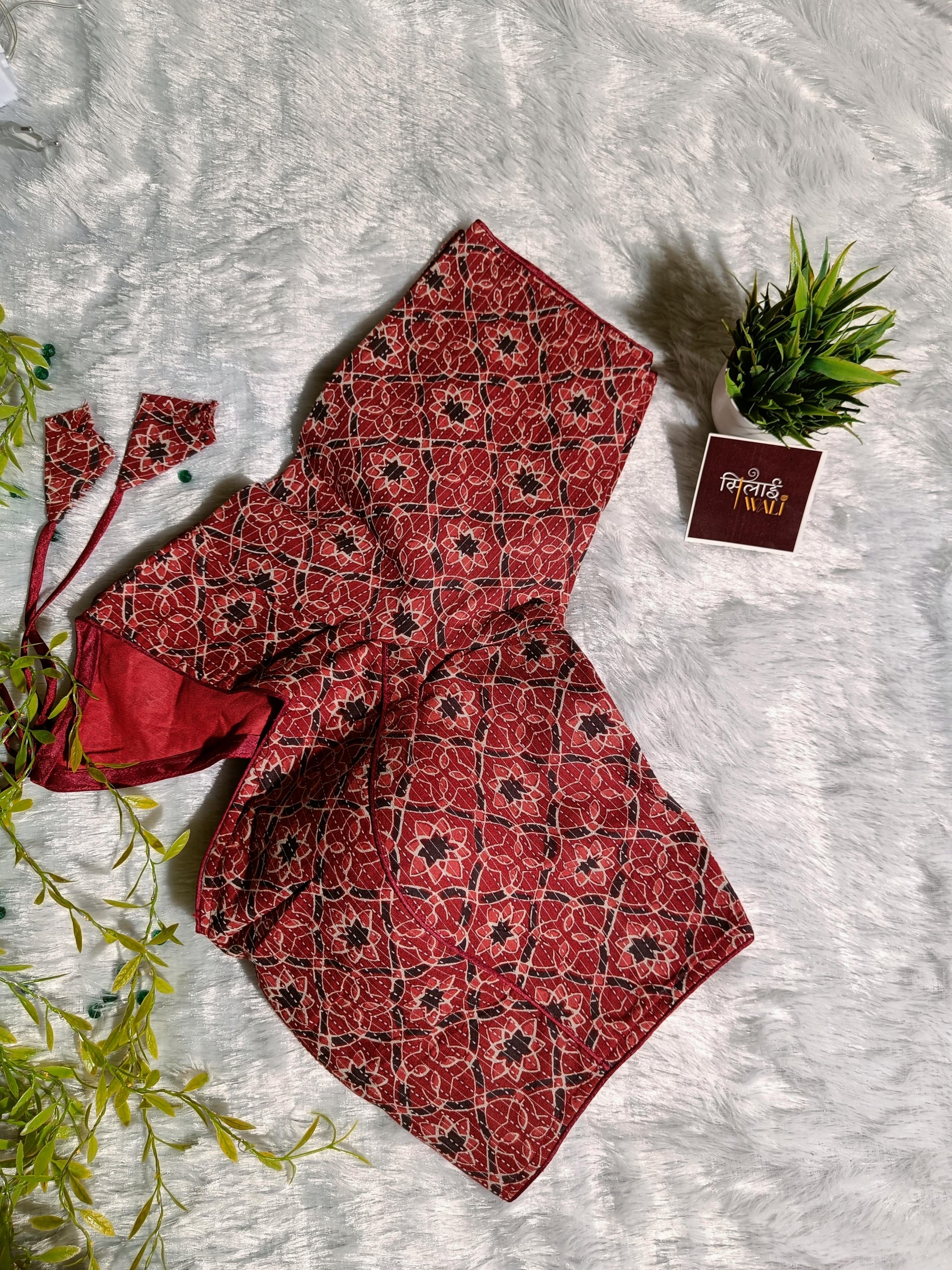 Ignite your wardrobe with the Maya blouse, a masterpiece in deep crimson and charcoal. The fabric is adorned with a repetitive star-and-circle motif that captures the essence of midnight sky artistry. Its rich color palette makes it a versatile choice for weddings and celebratory events. Finished with delicate piping and a bold back-open design, it balances traditional charm with bold femininity.