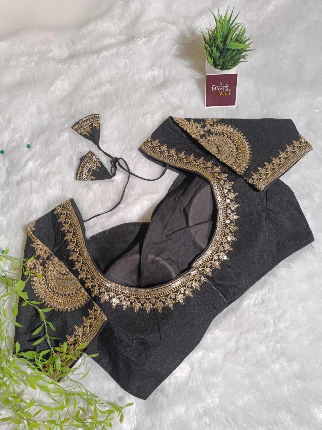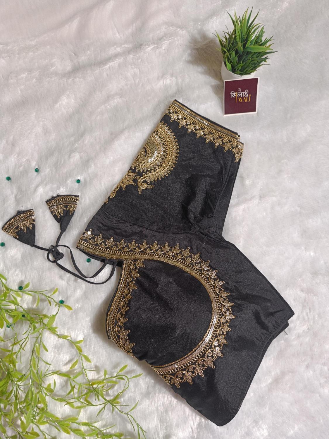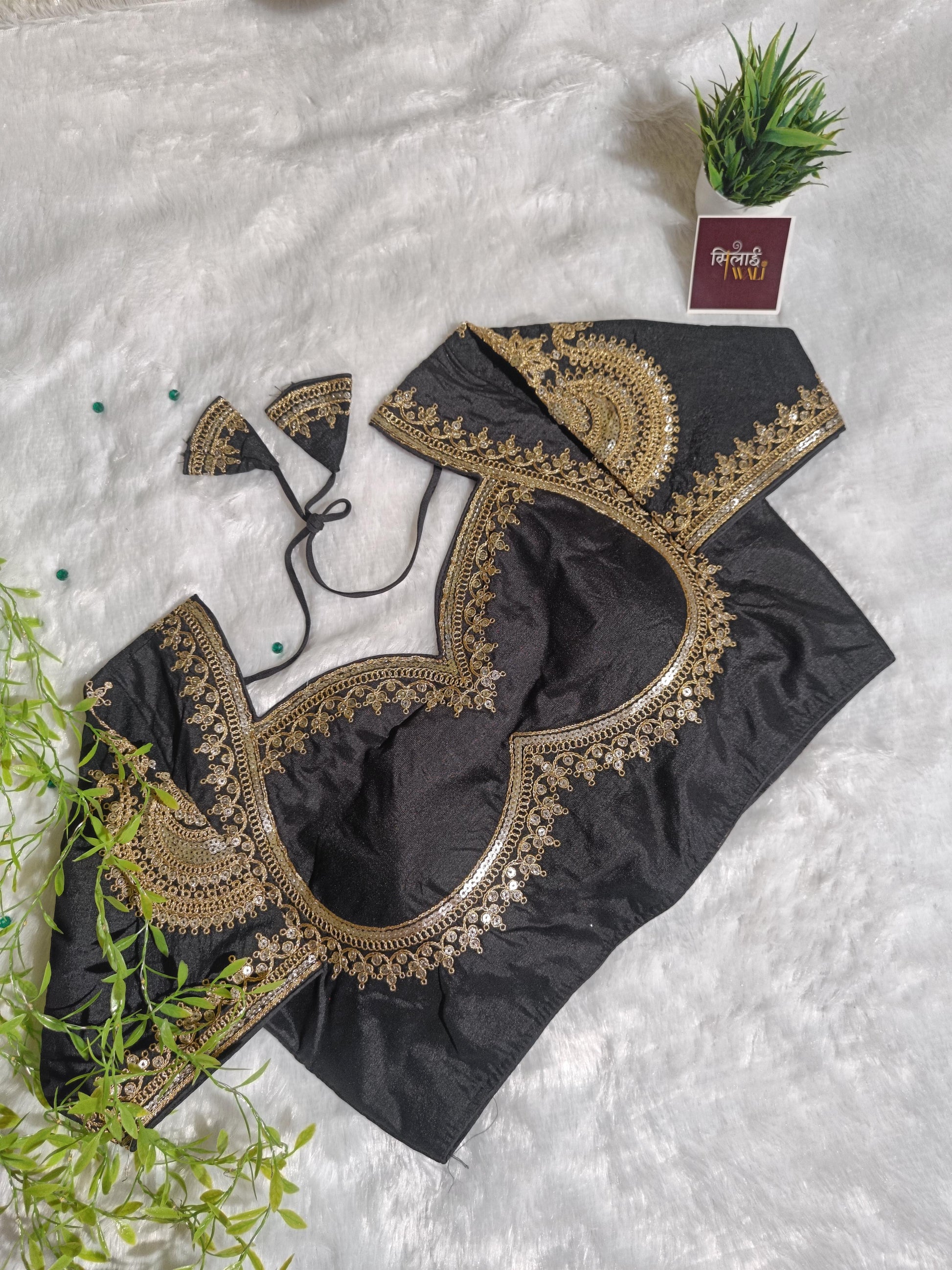 A timeless classic for every wardrobe—the Midnight Black Designer Blouse. This piece combines the mystery of black with the brilliance of antique gold embroidery. The heavy border along the neckline and sleeves makes it a versatile companion for both heavy silk sarees and lightweight designer drapes.