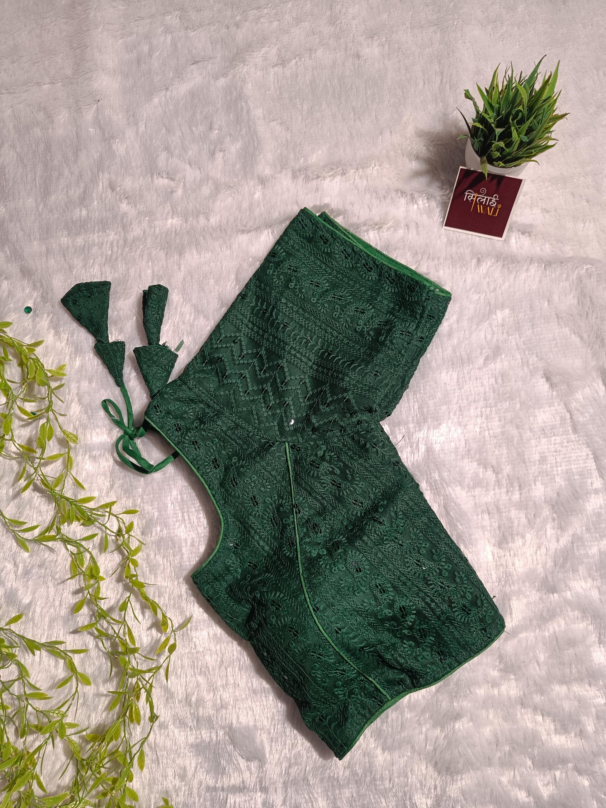 Step into royalty with the Emerald Enigma. This deep bottle green blouse features sprawling floral "Bel" motifs, meticulously hand-carved by artisans. The rich color serves as a stunning contrast to gold or ivory sarees. With its traditional "Jali" work and structured fit, it’s the ultimate choice for the festive season.