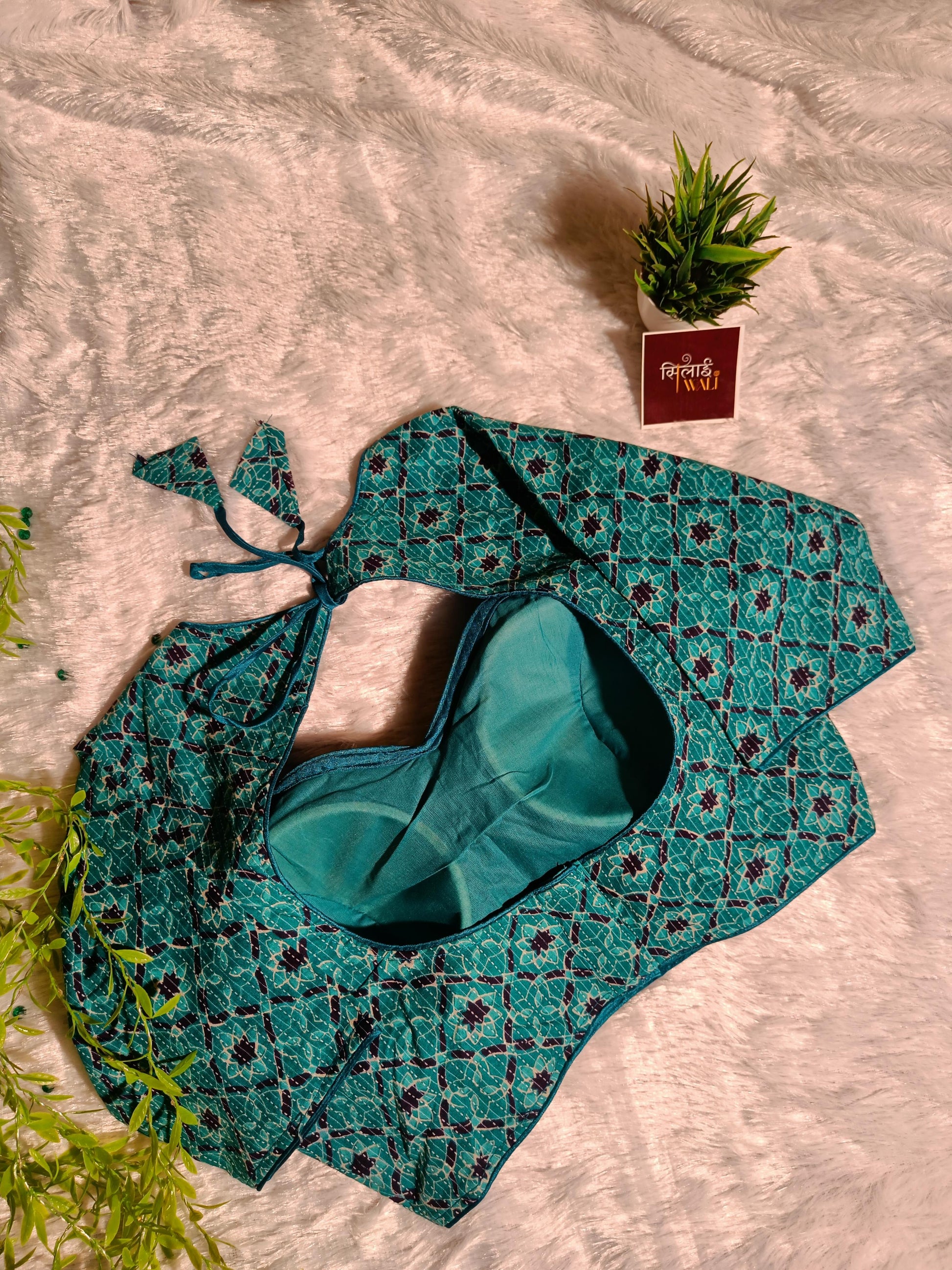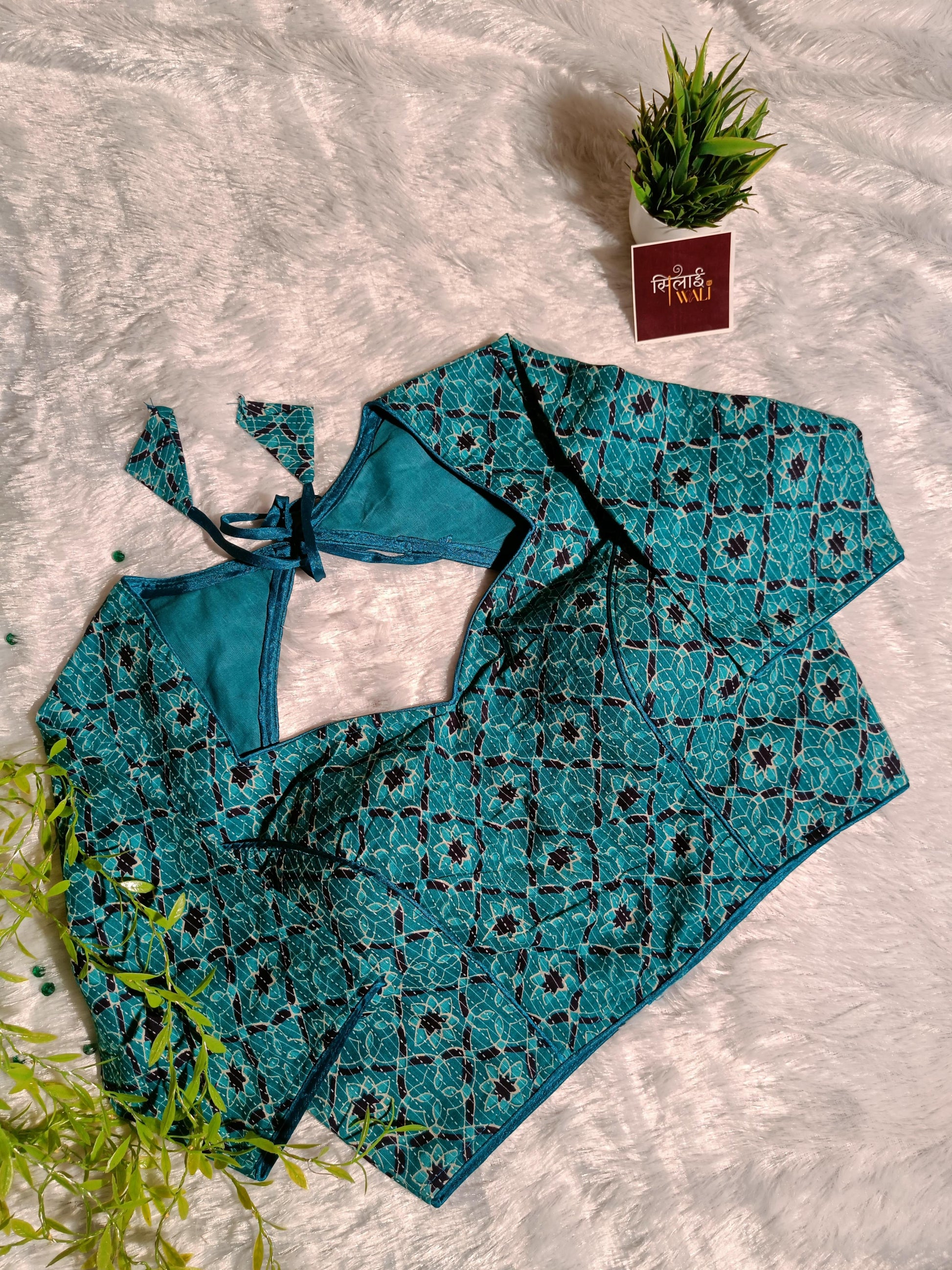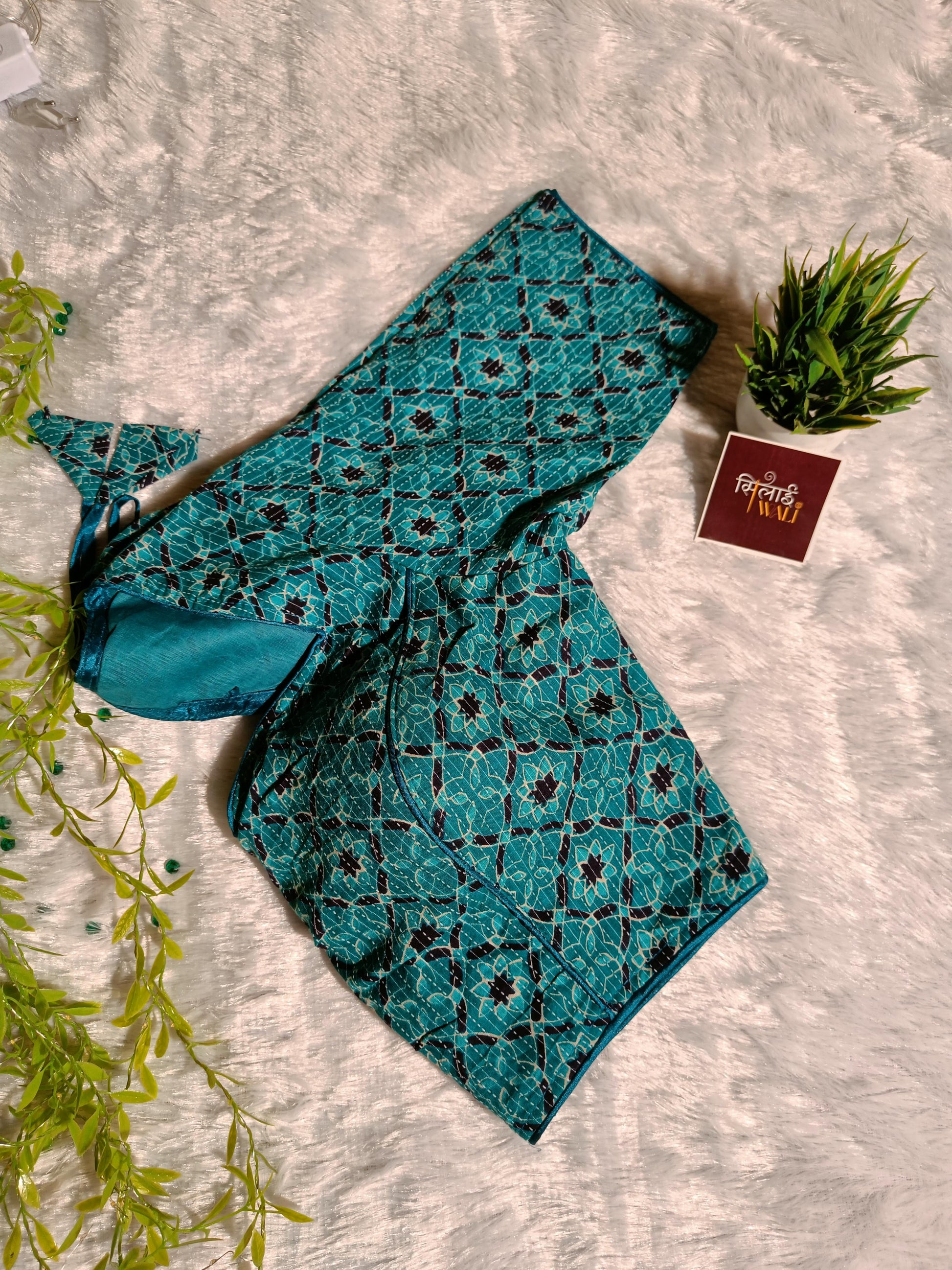 Elevate your ethnic ensemble with the Neelaksh blouse, a stunning fusion of traditional artistry and modern tailoring. Featuring an intricate teal and navy geometric pattern inspired by classic Ajrakh prints, with katha stitch ,this blouse offers a vibrant yet sophisticated look. The back is designed with a striking diamond-shaped cutout and adjustable dori ties with matching fabric tassels, ensuring you make a statement from every angle.