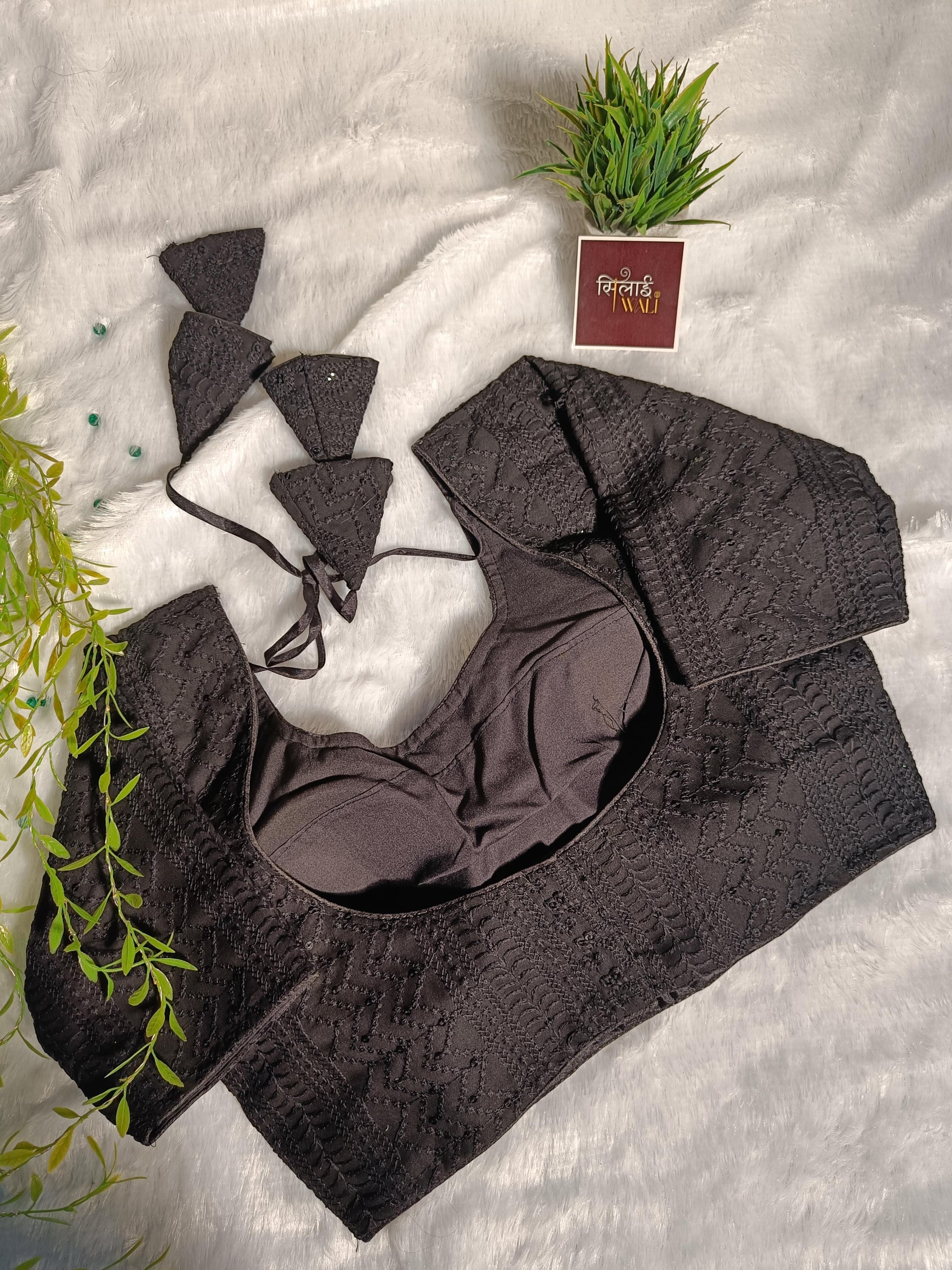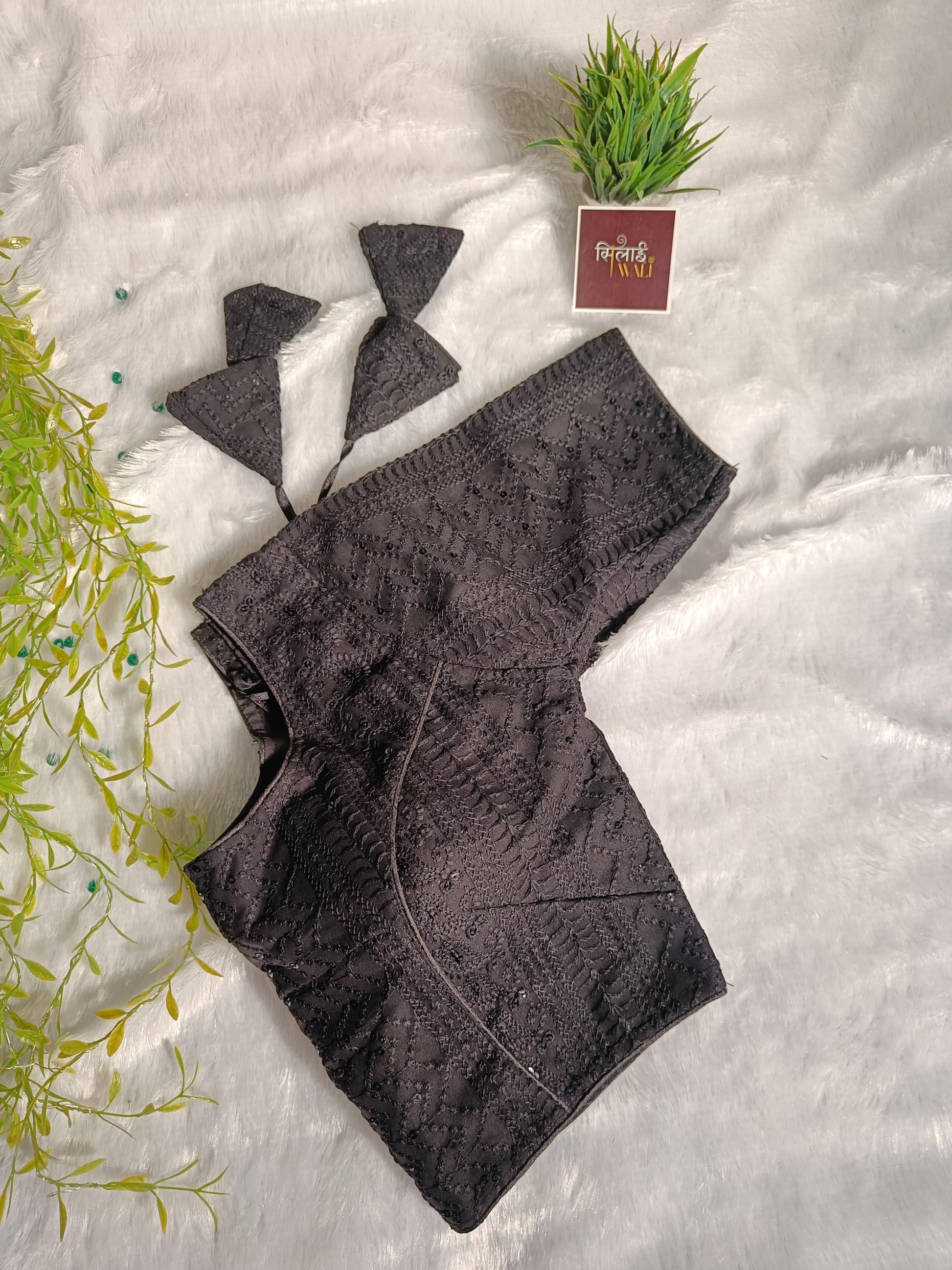 Make a bold statement with the Onyx Heritage Blouse. This masterpiece features authentic Lucknowi "Bakhiya" (shadow work) and "Phanda" (knot stitch) hand-embroidery. Designed for the modern woman who values heritage, this black blouse offers a slimming silhouette and a rich, matte finish that pairs effortlessly with heavy silk sarees or contemporary cocktail drapes.