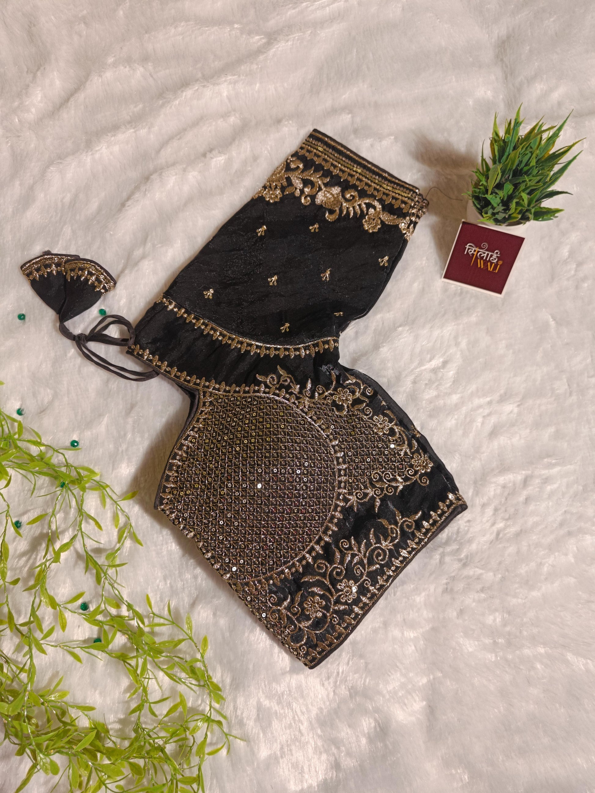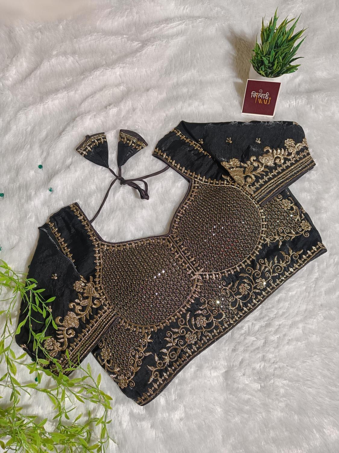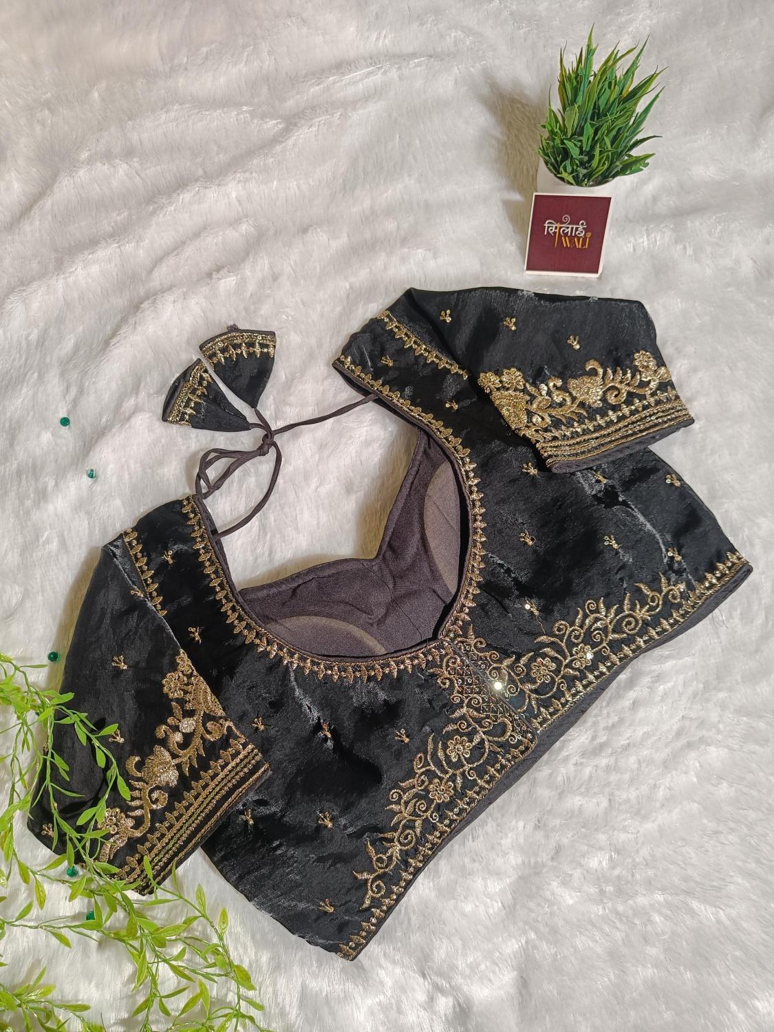 Define modern bridal luxury with the Noor Obsidian Black Blouse. While black is a bold choice, the overwhelming gold "Starlight" Jaal embroidery transforms this piece into a shimmering suit of armor for the fashion-forward bride. The intricate gold lattice-work on the bust is paired with bold, swirling floral patterns on the sleeves, creating a look that is both powerful and feminine. It is the ultimate statement piece for a grand Sangeet or a high-glamour Reception.