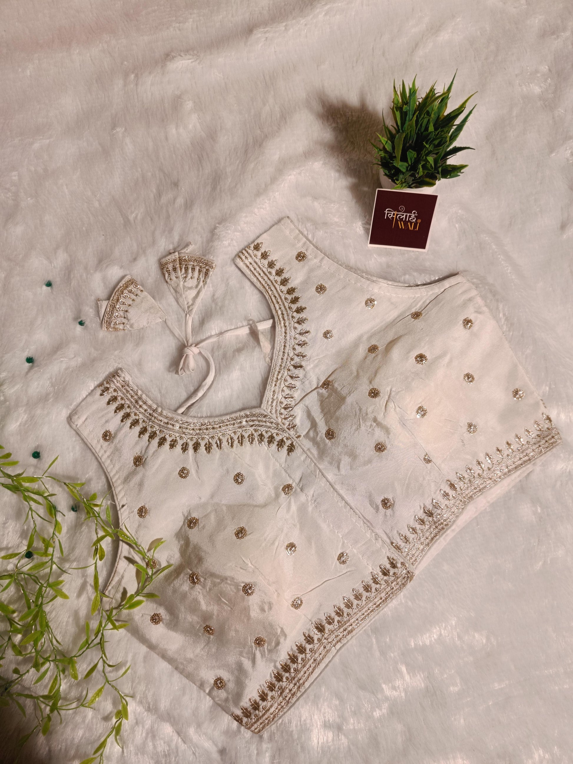 Pure elegance meets modern design in this Pearl White Silk Blouse. The serene white fabric is elevated by opulent gold sequin borders and scattered floral motifs. Whether you're a bridesmaid or the guest of honor, this V-neck padded blouse offers a clean, sophisticated look that matches almost any color palette.