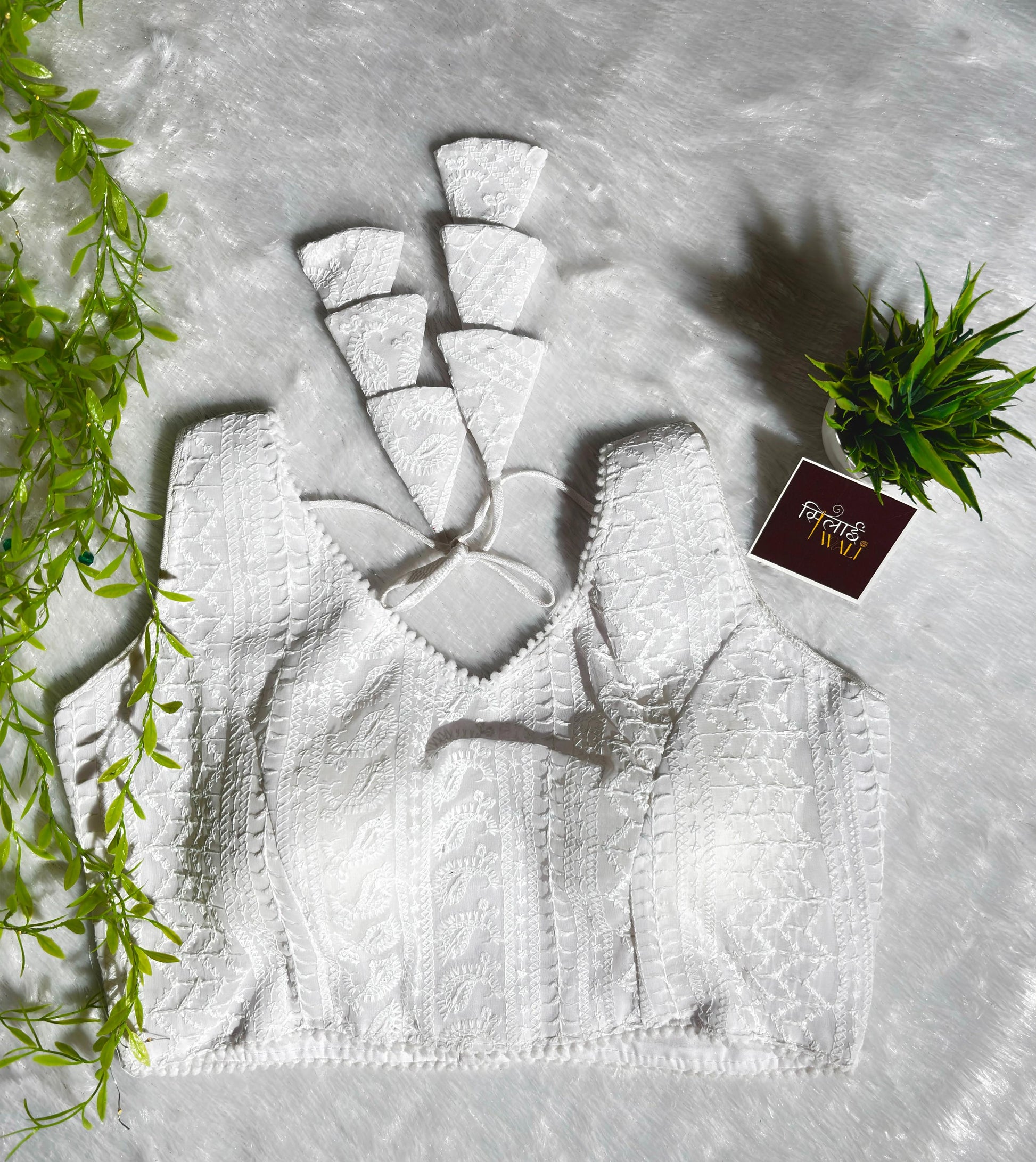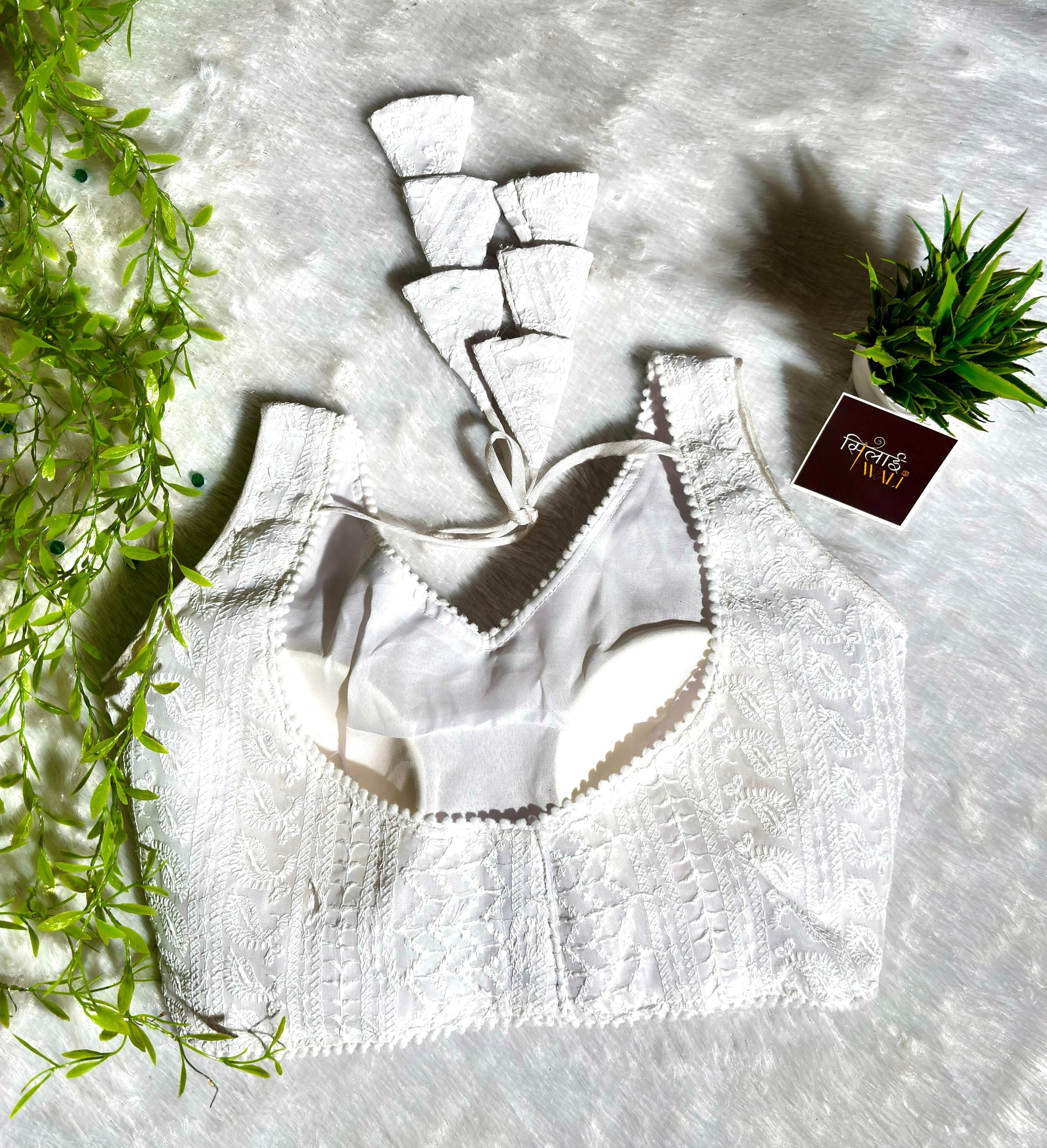A masterpiece of tonal elegance, this Ivory White blouse features authentic Lucknowi Chikankari embroidery. The subtle shimmer of transparent sequins makes it a versatile companion for both heavy bridal lehengas and lightweight floral chiffon sarees.