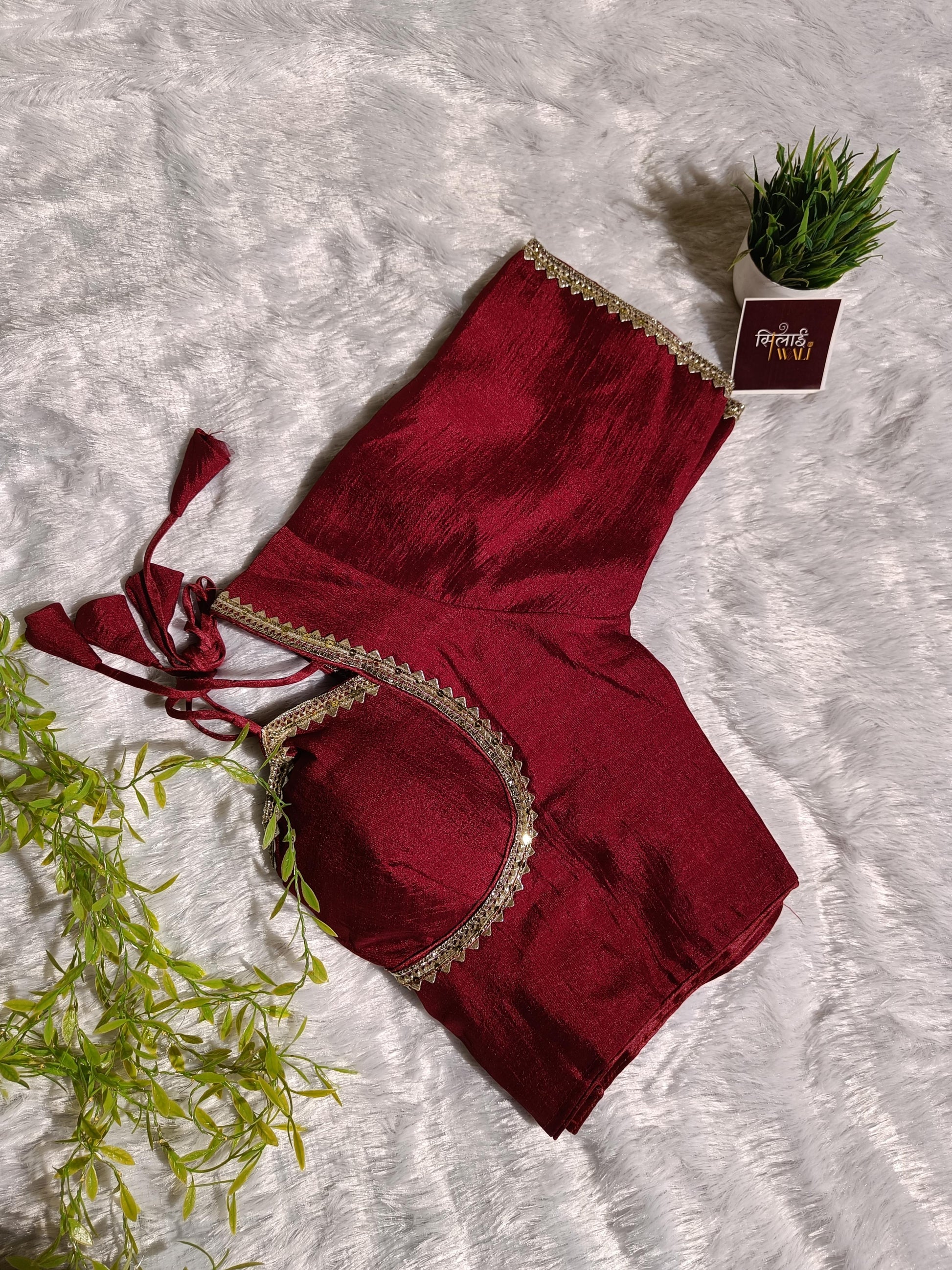 Exude luxury in this rich Maroon-toned blouse. The signature curved silhouette is highlighted by shimmering gold lace, while the long dori ties add a touch of traditional elegance to the back.