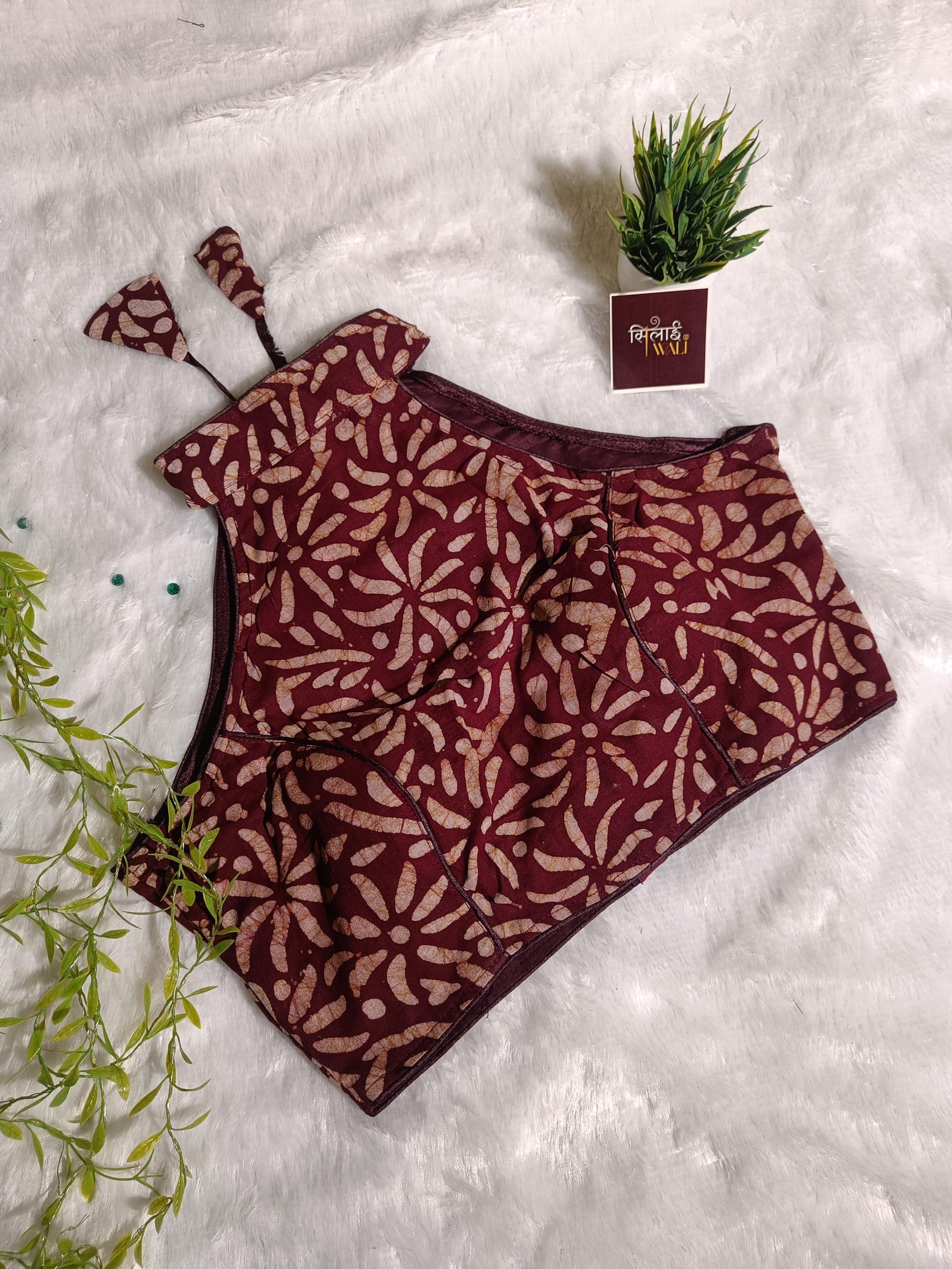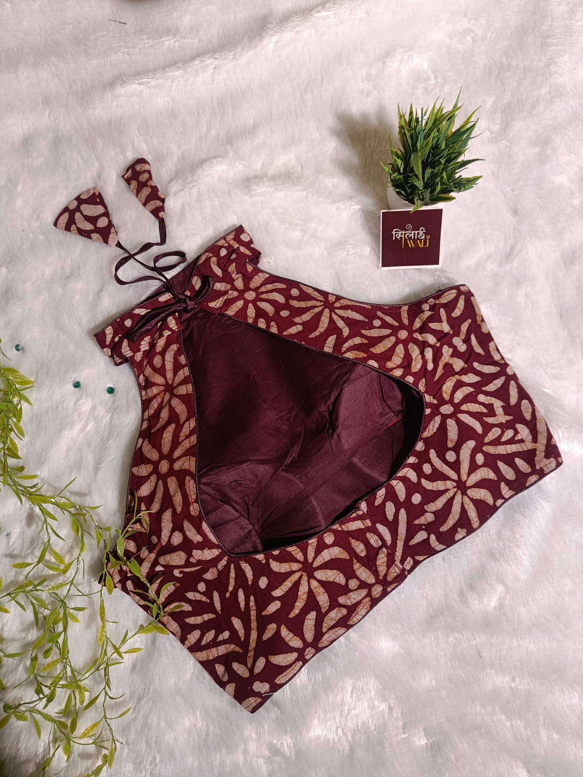 The "Roasted Coffee" blouse is a celebration of rich, earthy brown tones and delicate artistry. The deep chocolate-brown fabric serves as a stunning canvas for the warm cream-toned floral batik prints. The sleeveless halter design is both bold and graceful, making it an ideal choice for summer weddings or festive brunches. Hand-finished with designer tassels, this blouse effortlessly bridges the gap between heritage craft and contemporary style.
