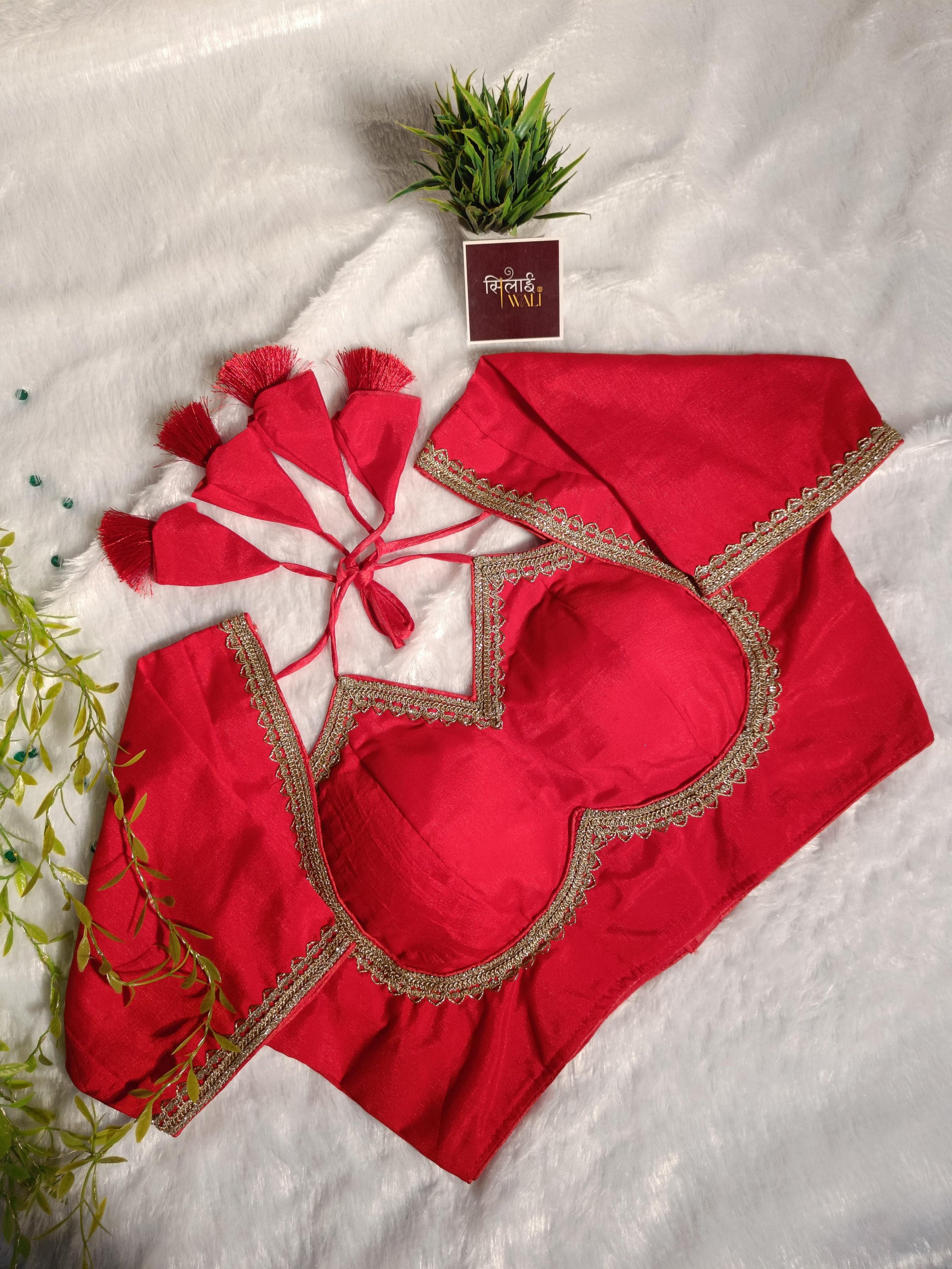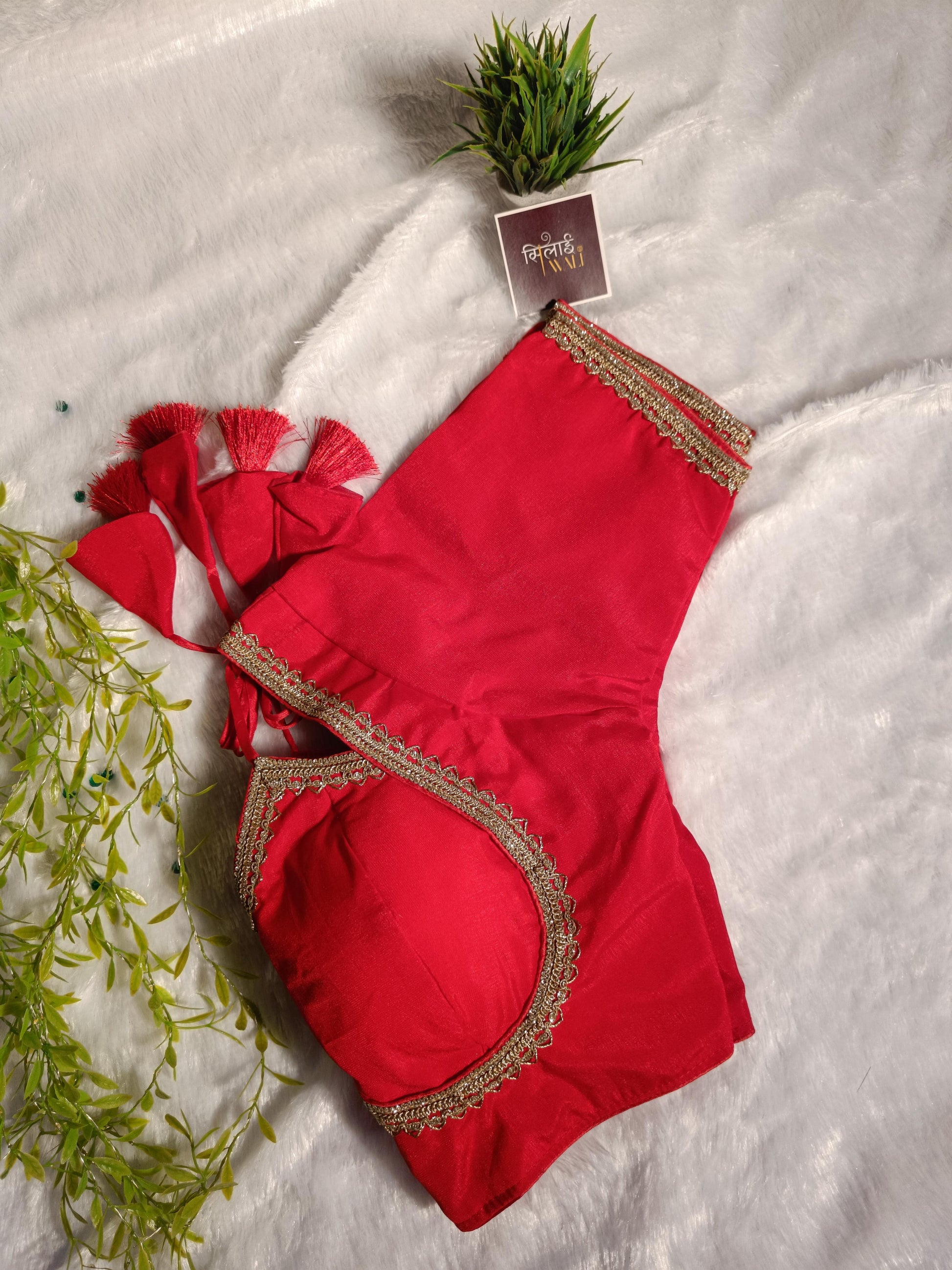 Command attention in this vibrant red Masaba cut blouse. Featuring high-density padding for a flawless fit and delicate metallic edging, it is the ultimate bridal or festive choice.