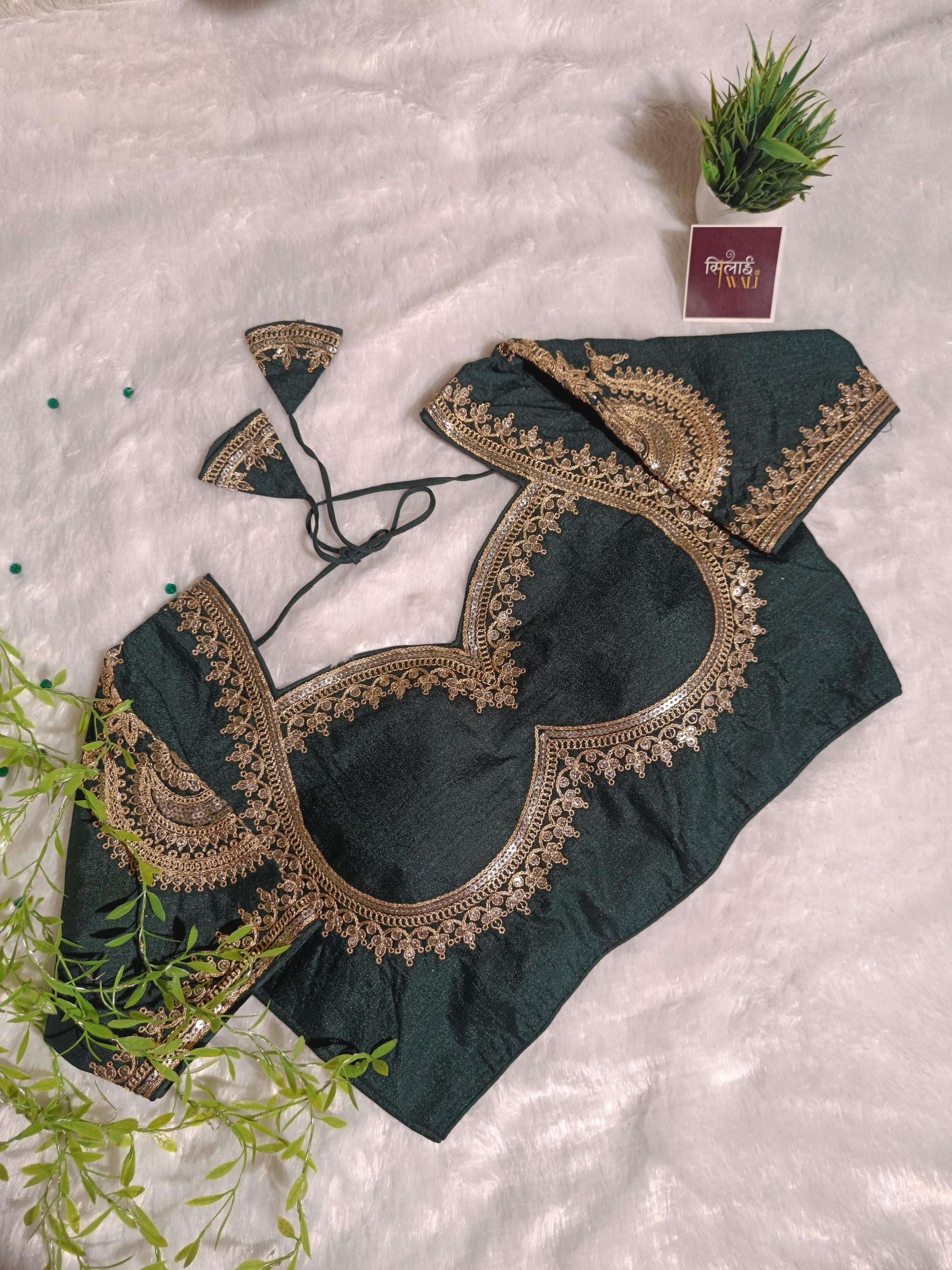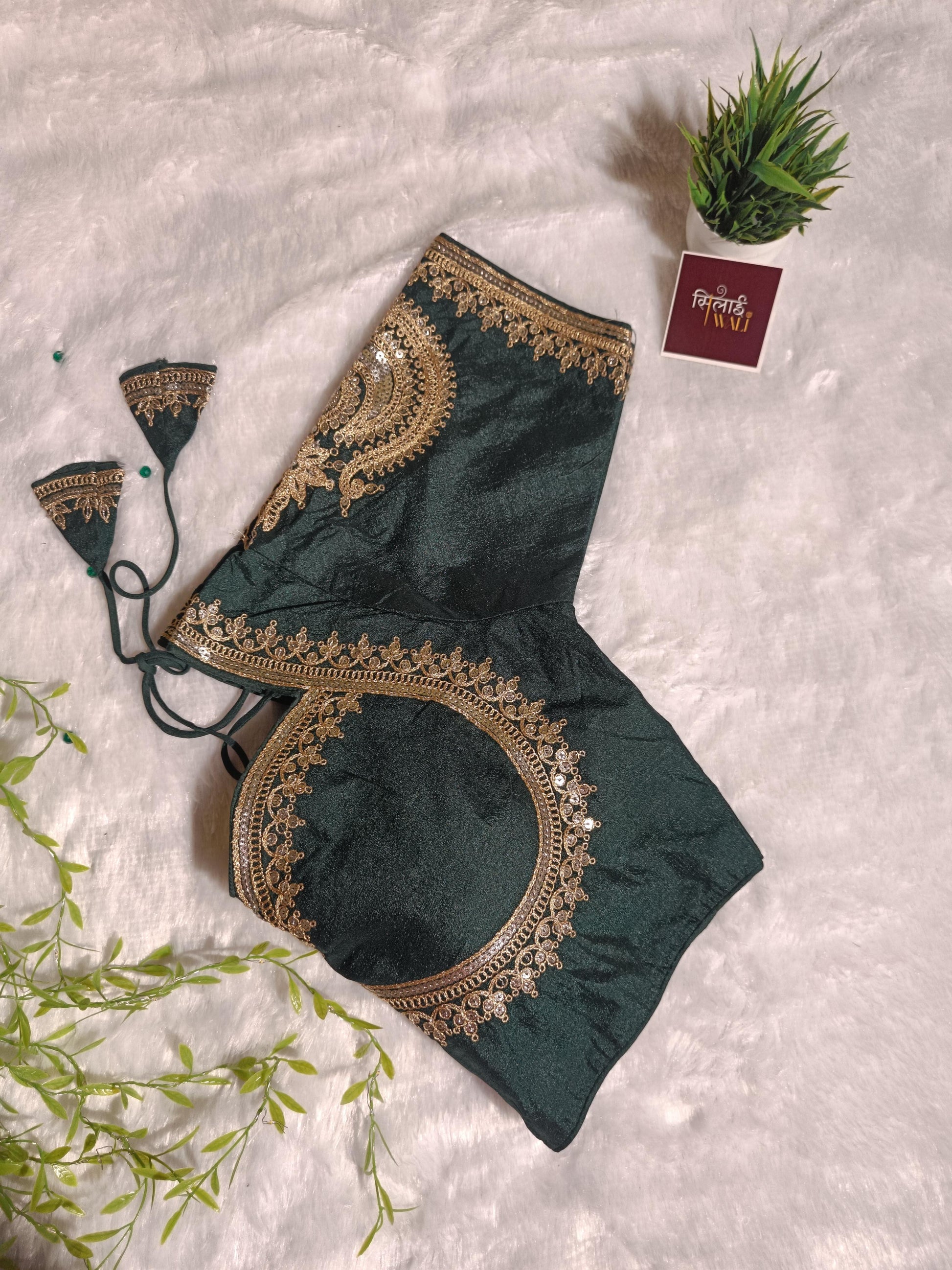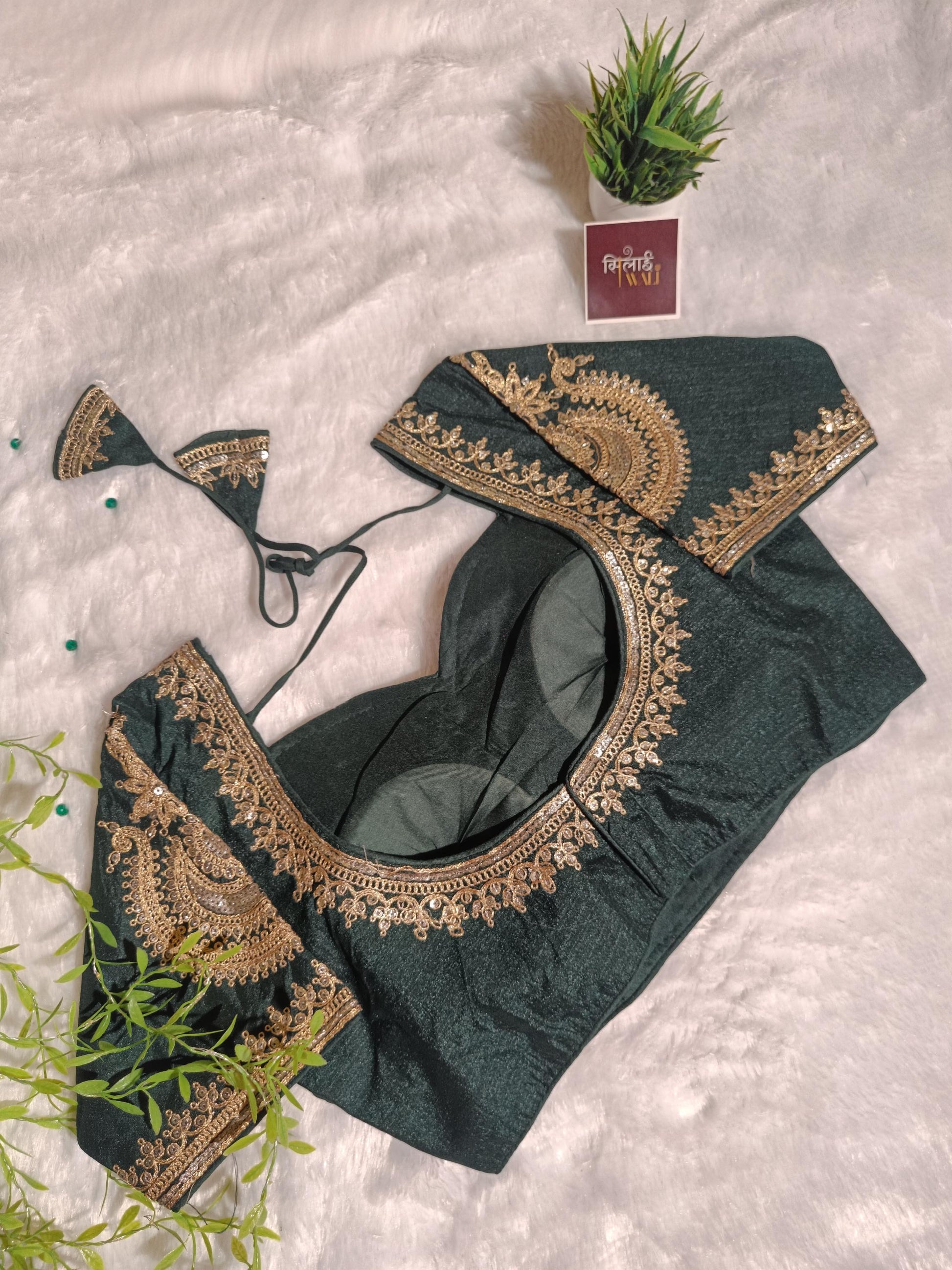 Make a grand entrance with this stunning Emerald Green Designer Blouse. Crafted from premium Phantom Silk, this blouse features a deep, luxurious green hue that serves as the perfect canvas for the dense, shimmering gold zari and sequin embroidery. The Sweetheart Neckline and padded cups ensure a perfect, flattering fit, while the heavy embroidery on the sleeves adds a touch of royal elegance.