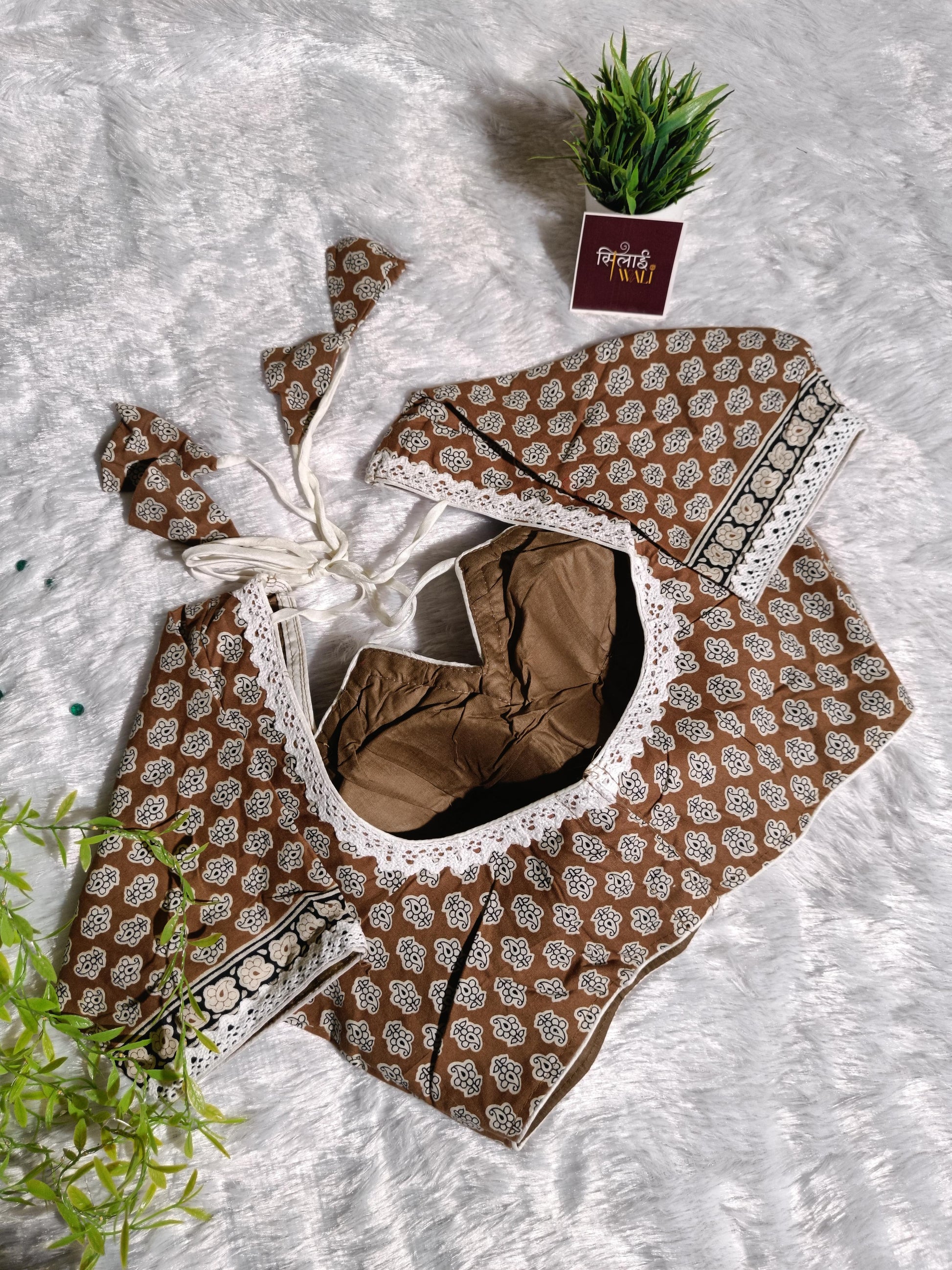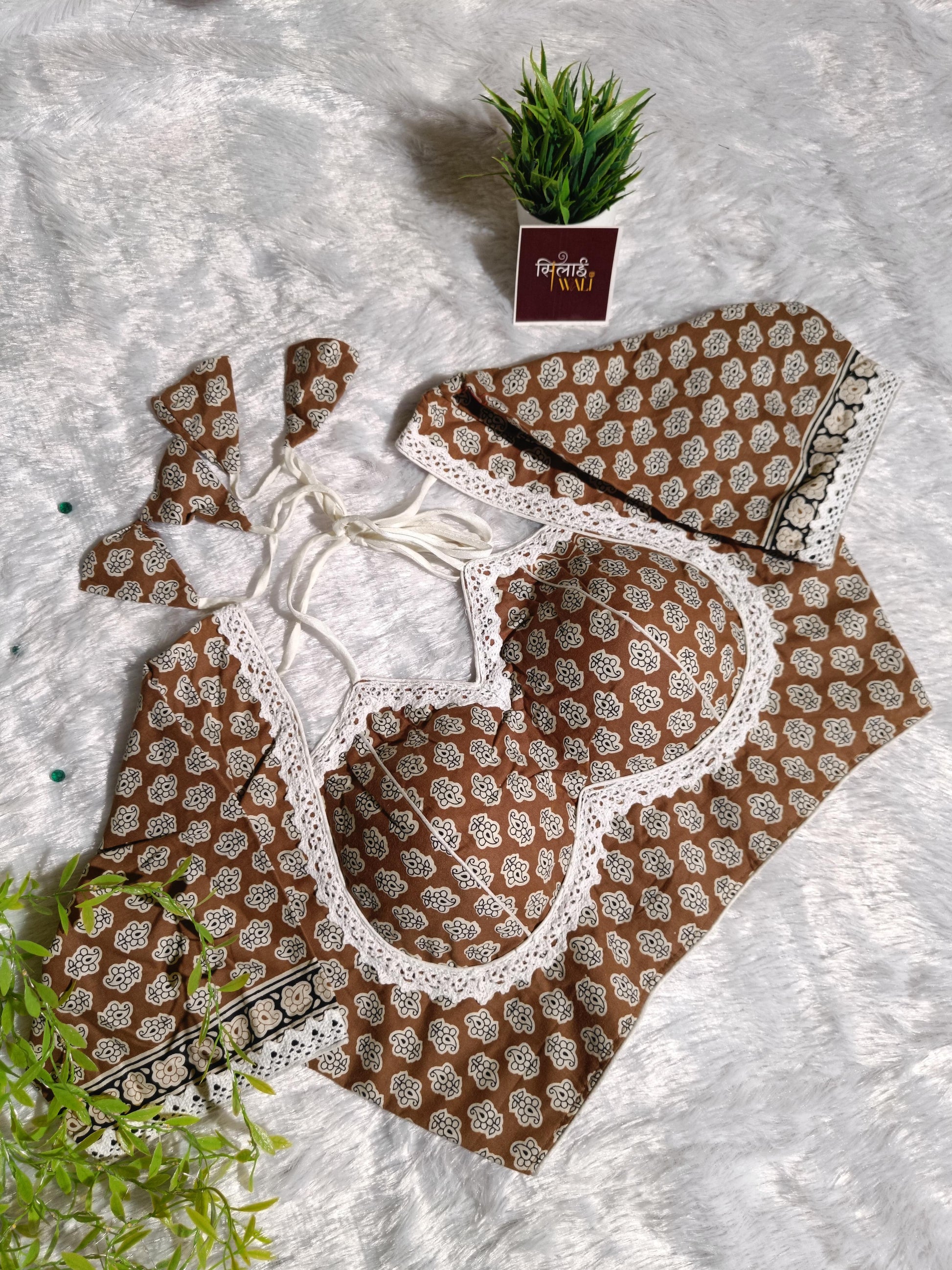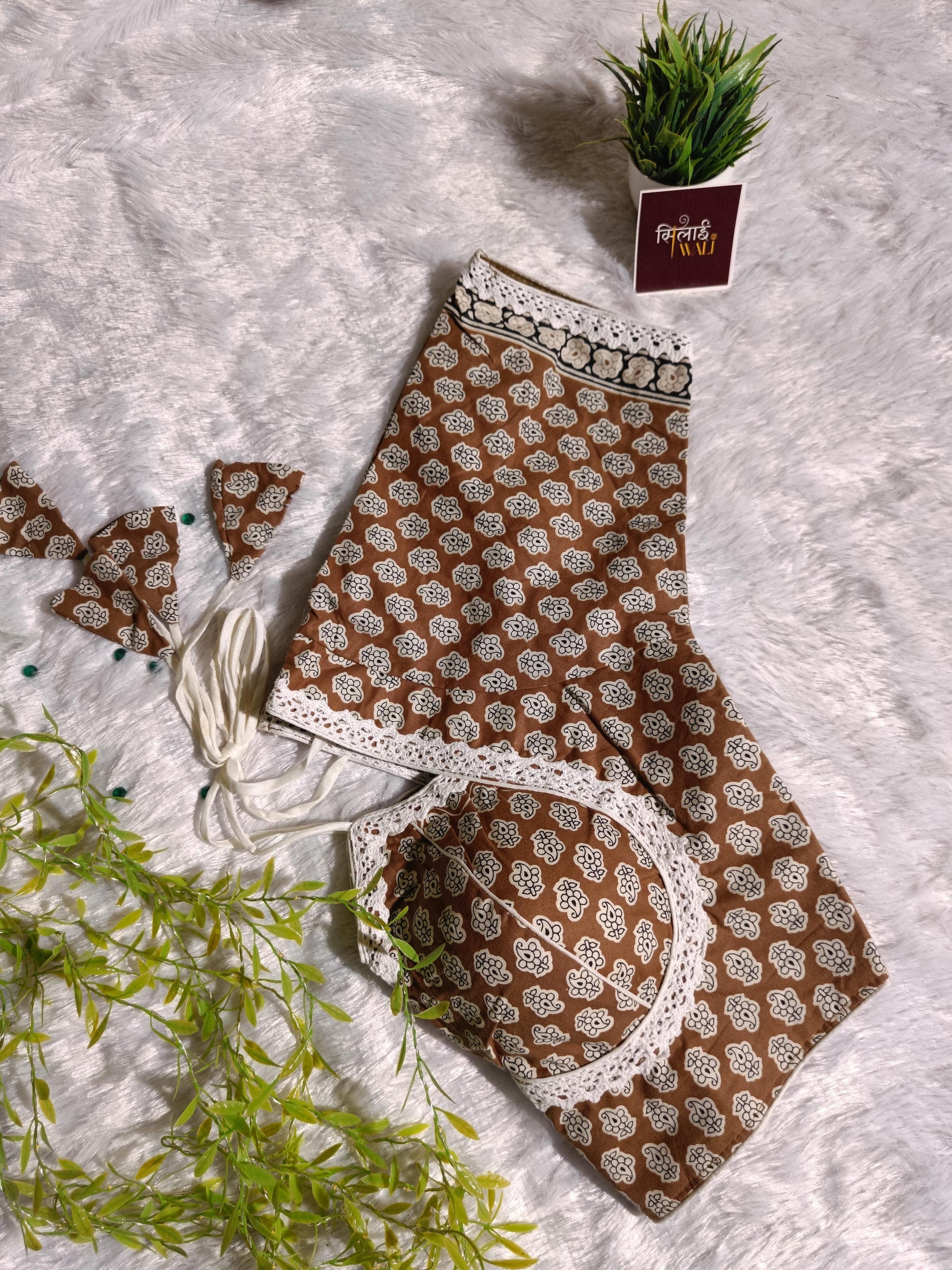 Exude warmth and elegance in our Rust Maroon Masaba Cut blouse. The deep reddish-brown hue is complimented by a classic floral butti print. The adjustable back dori with oversized triangular tassels ensures a perfect fit while adding a playful element to your back profile.