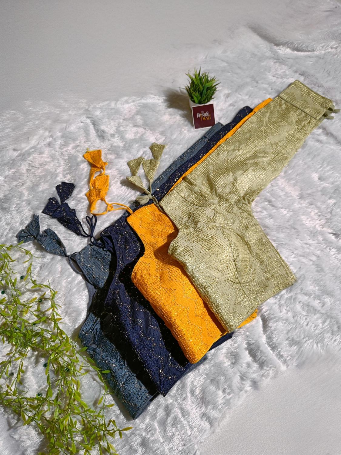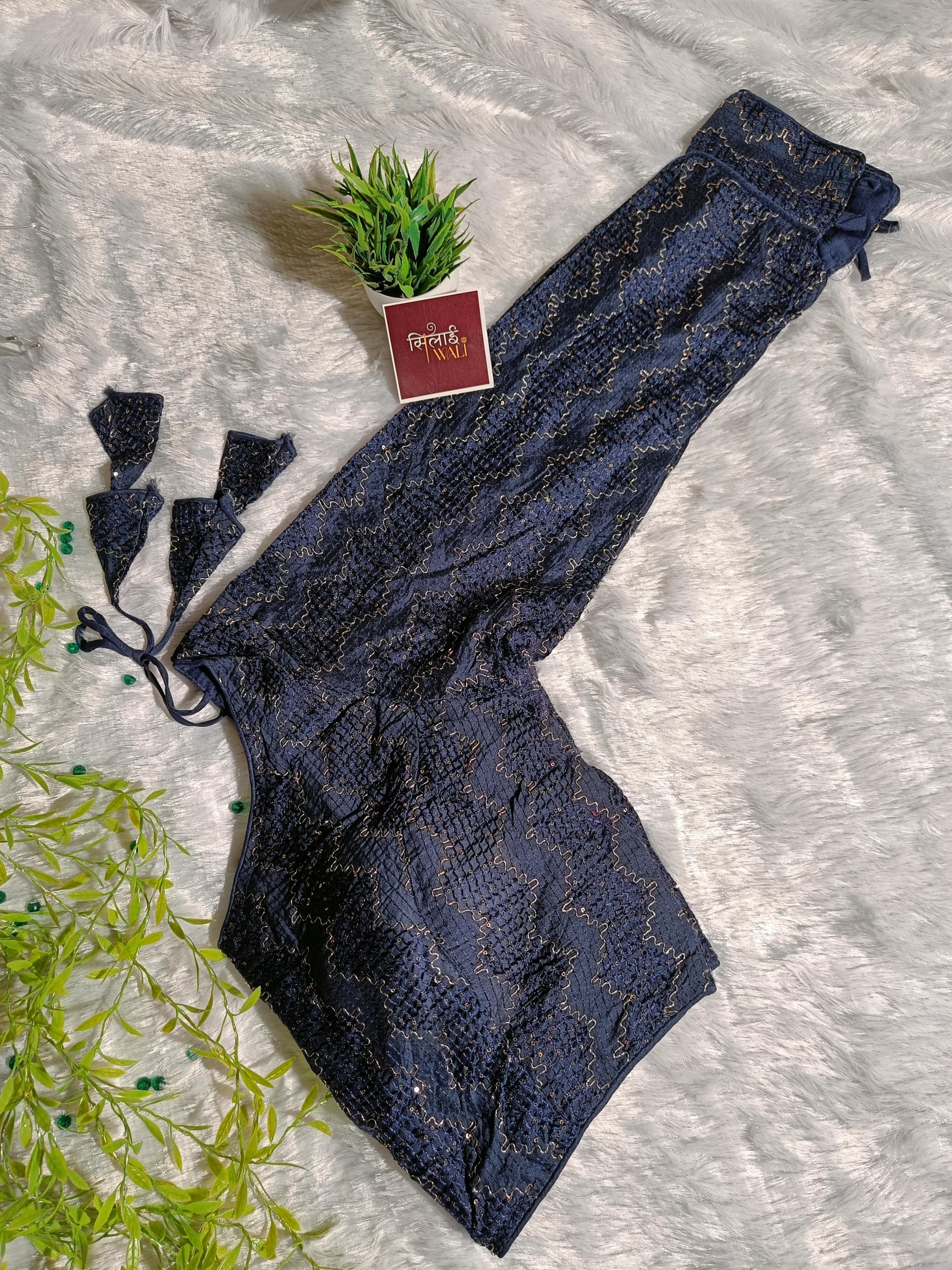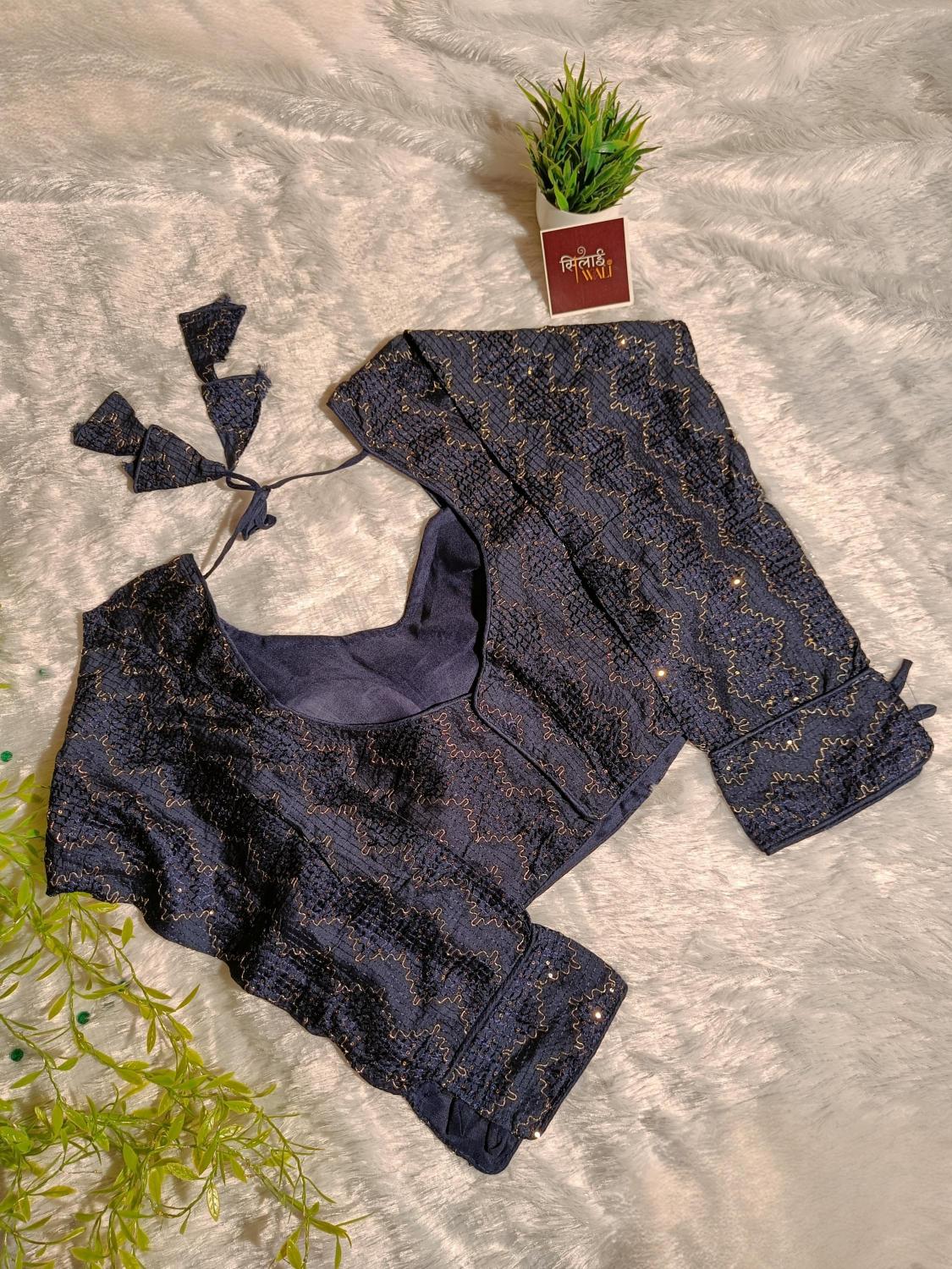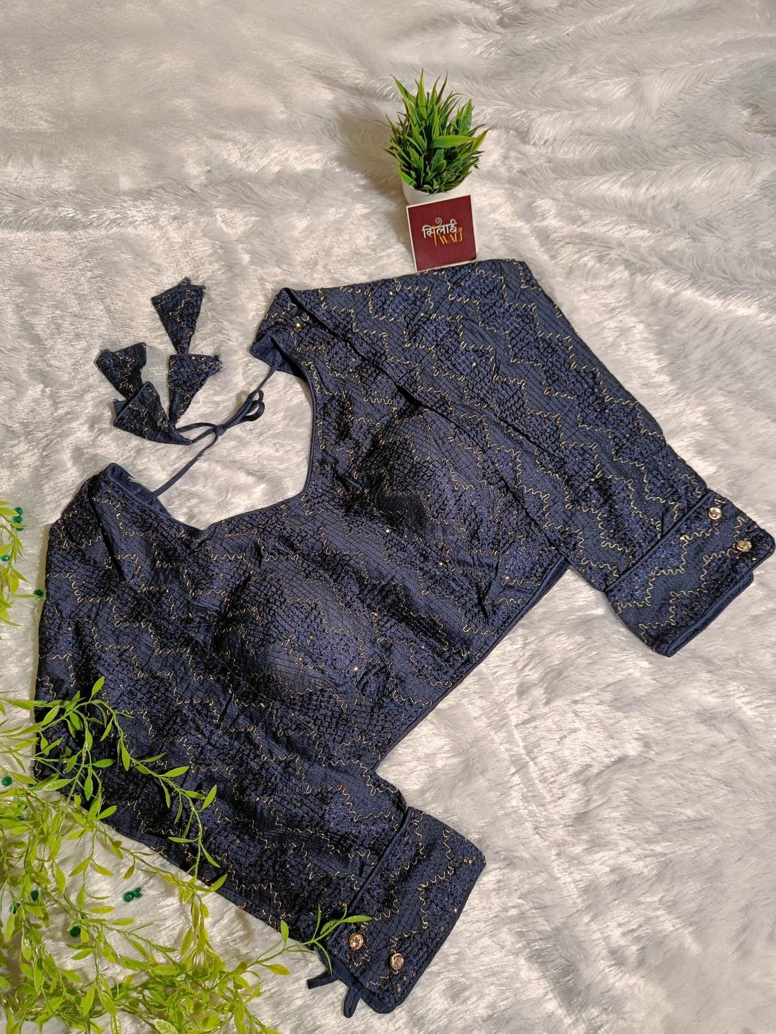 Capture the mystery of the midnight sky with this deep navy blue blouse. The full-sleeve design is heavily embellished with sequins that sparkle with every movement of your arms. The button-cuff detail adds a formal, polished touch, making it an excellent pairing for heavy bridal lehengas or sophisticated cocktail sarees.