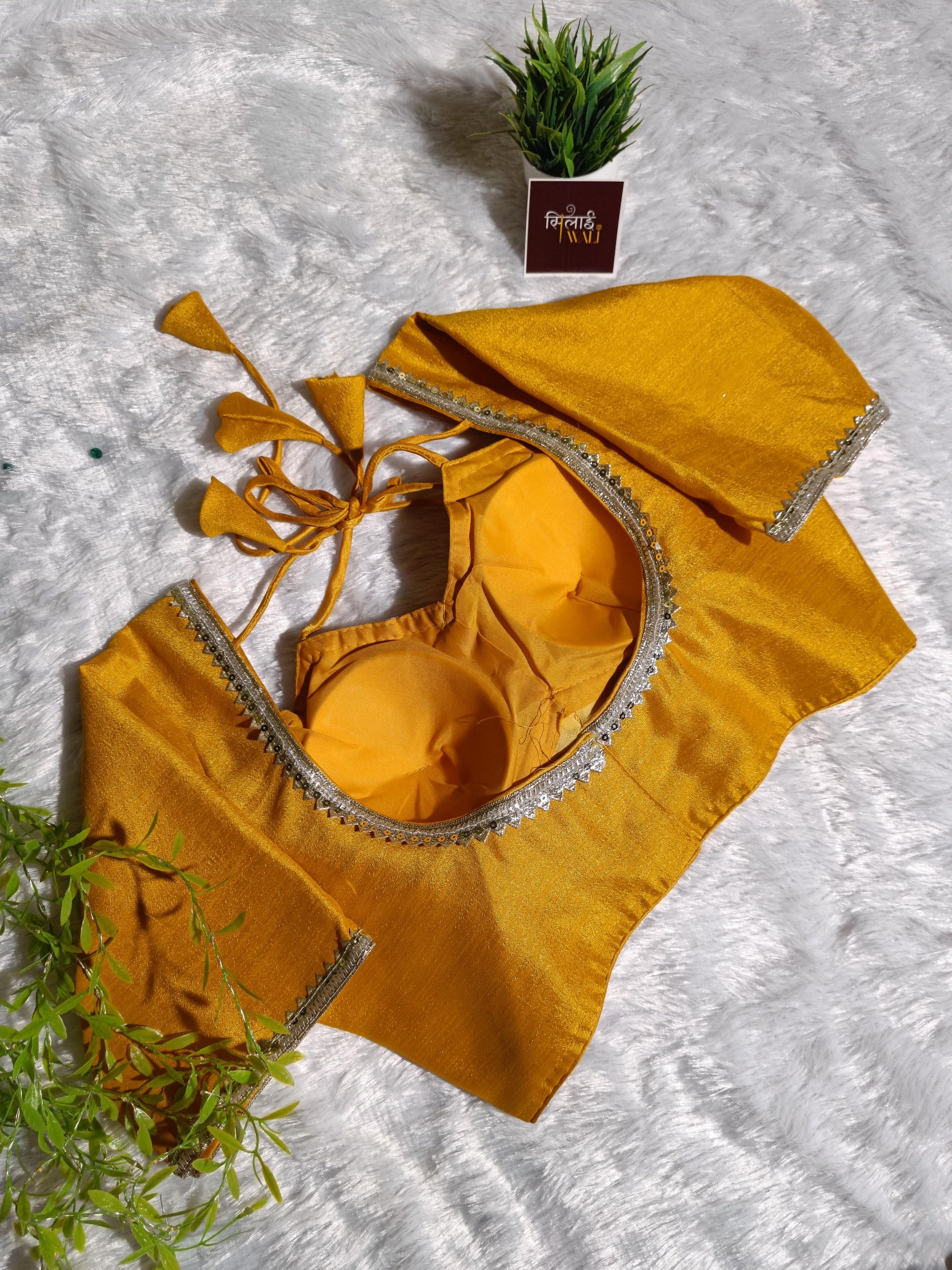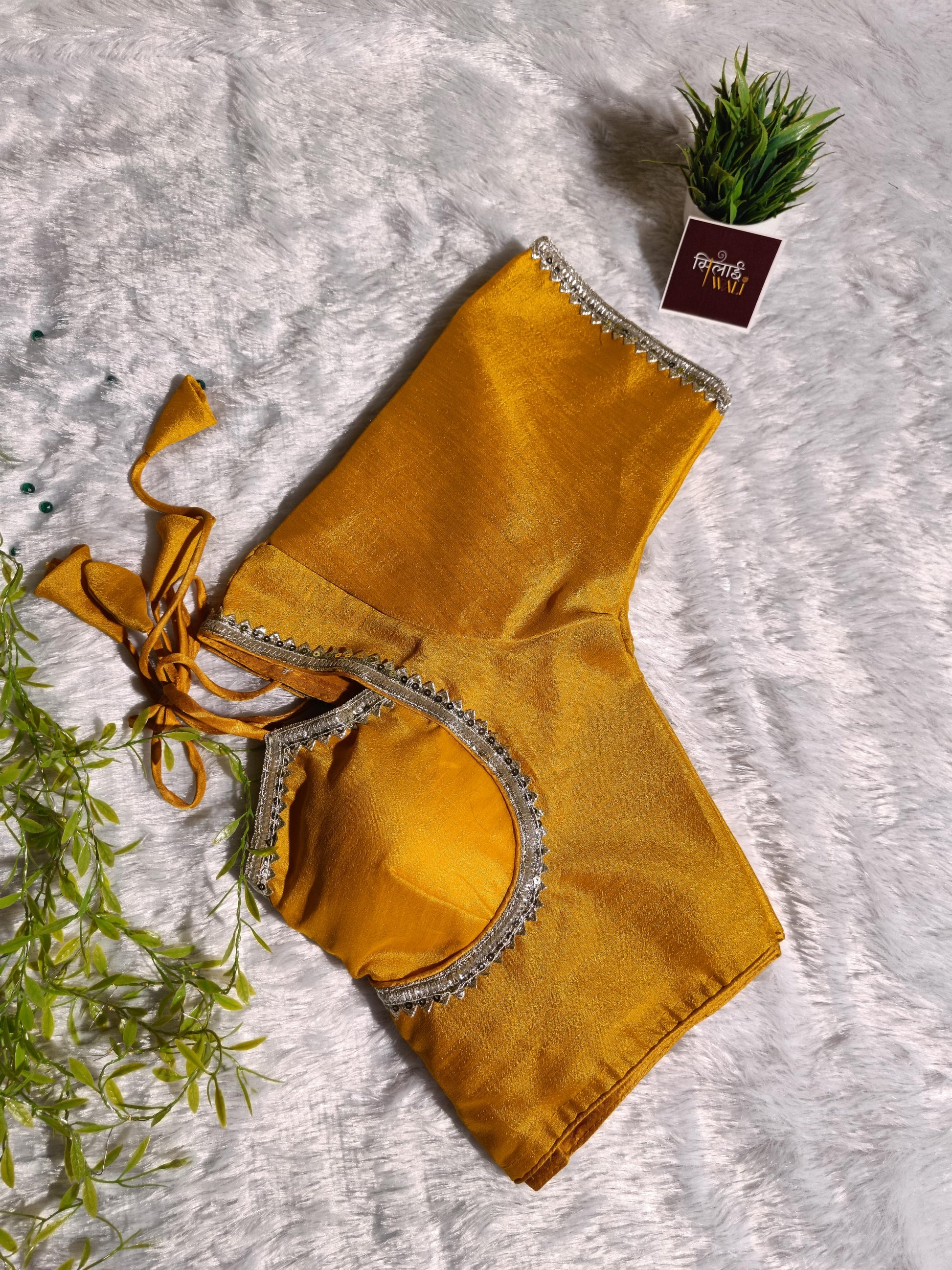 Brighten your festive wardrobe with this mustard gold beauty. Crafted in premium art silk, the blouse features a supportive sweetheart neck and elbow-length sleeves with ornate borders.